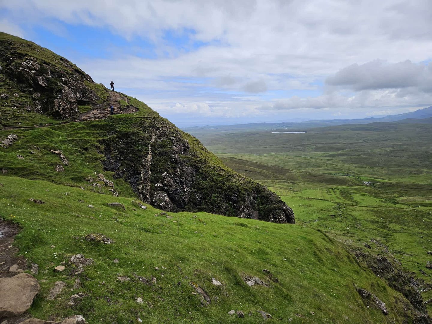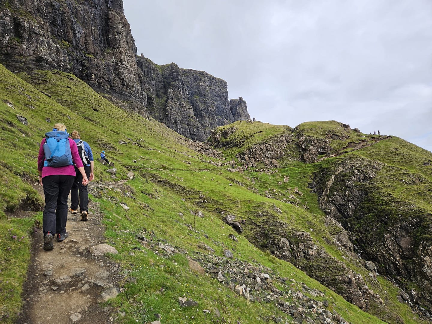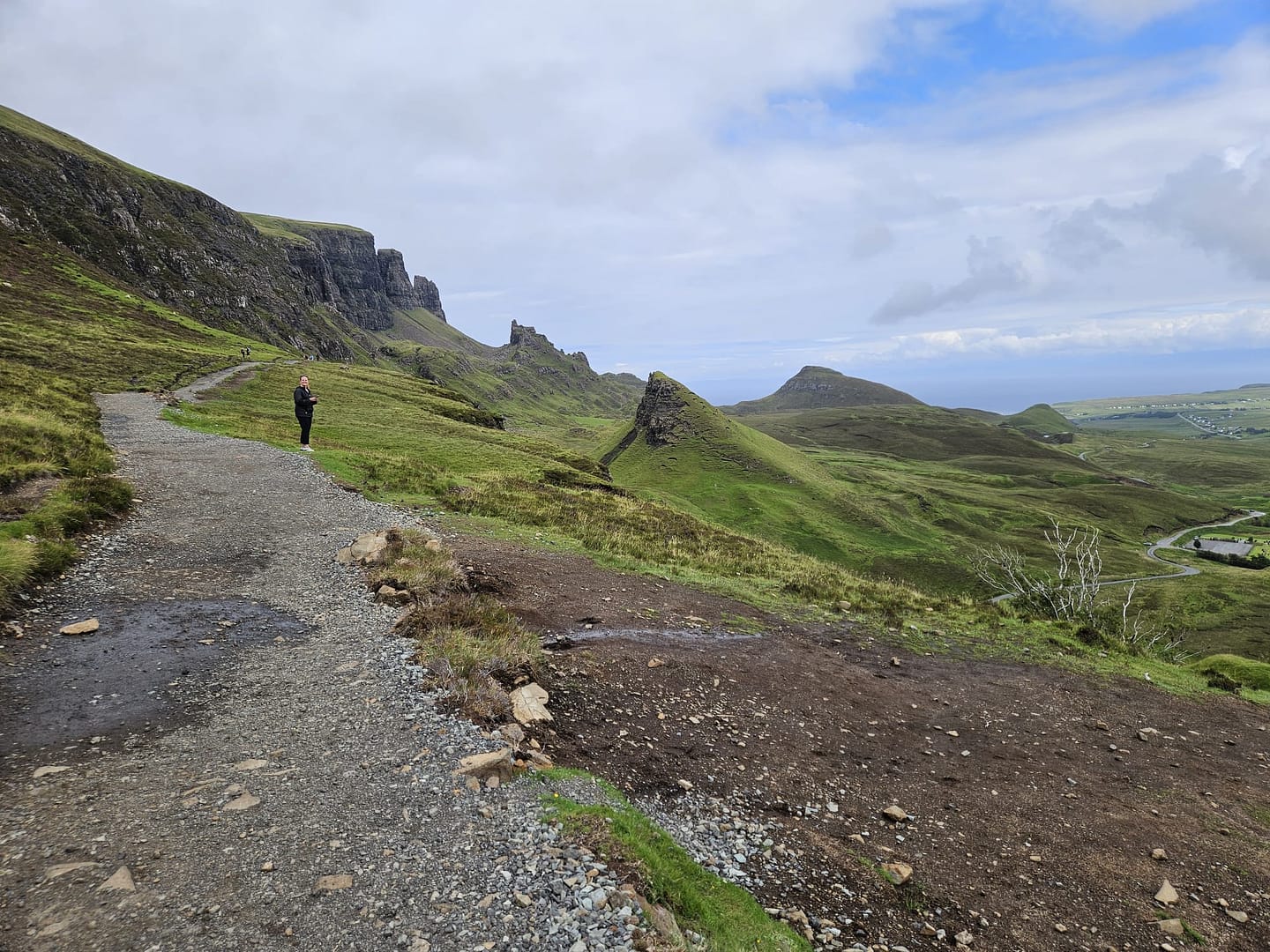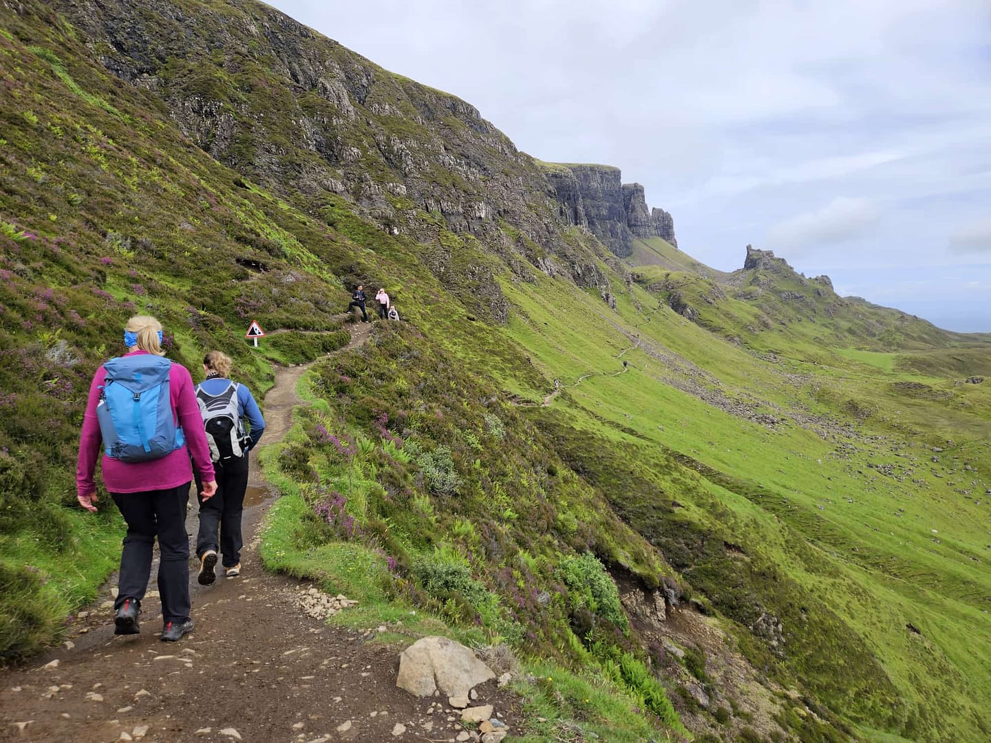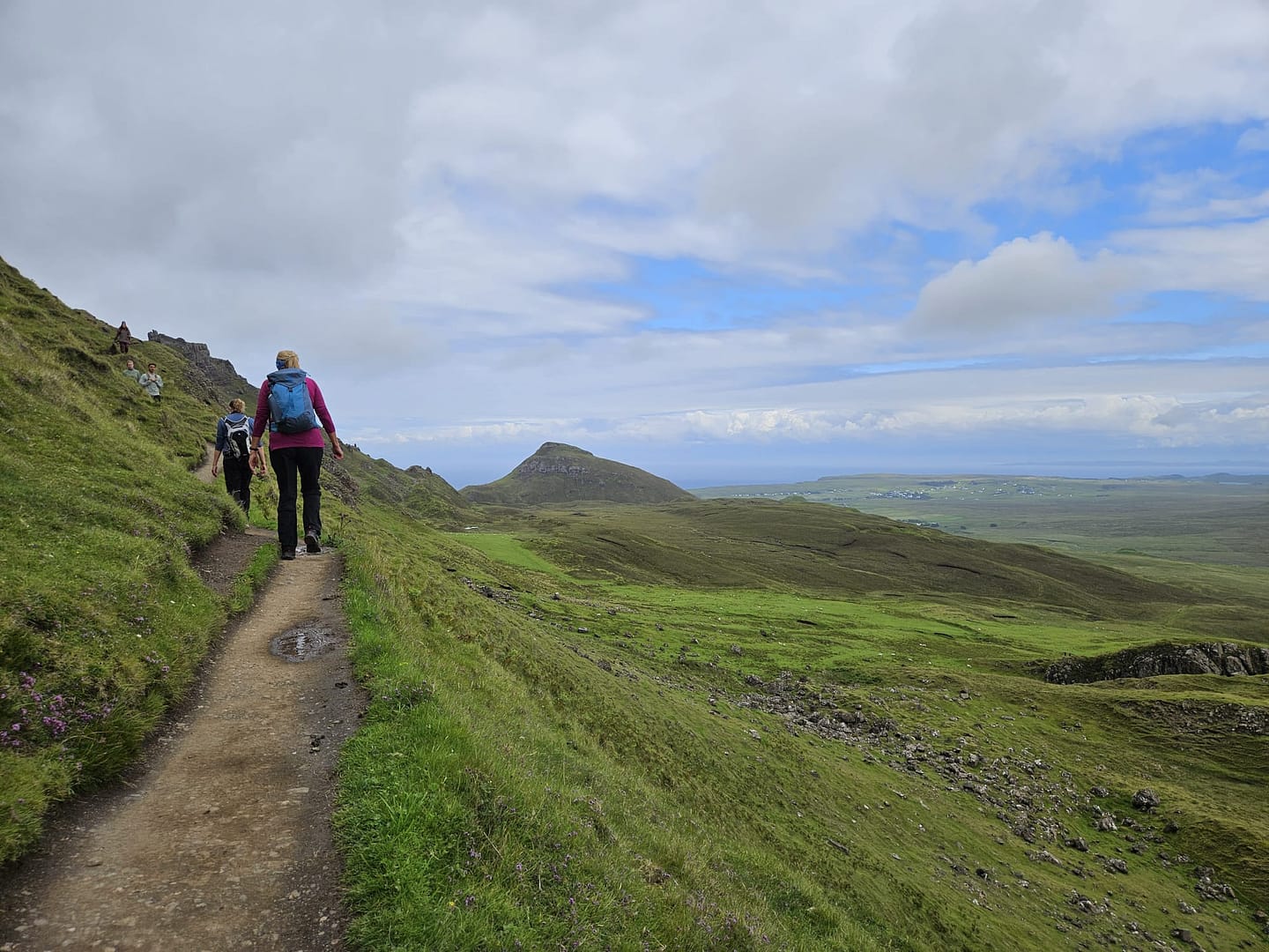 Vom Parkplatz aus beginnt der Weg auf einem breiten, gut ausgebauten Pfad, der mit der Zeit schmaler wird und sich über sanft ansteigende grasige Hänge schlängelt. Die ganze Zeit bieten sich beeindruckende Panoramablicke über die offene Landschaft und hinunter zur Staffin Bay. Doch es sind nicht nur die Fernblicke, die faszinieren – immer wieder entdeckt man schmale Wasserfälle, die entlang der Abbruchkanten herabstürzen und den Pfad an manchen Stellen etwas anspruchsvoller gestalten.