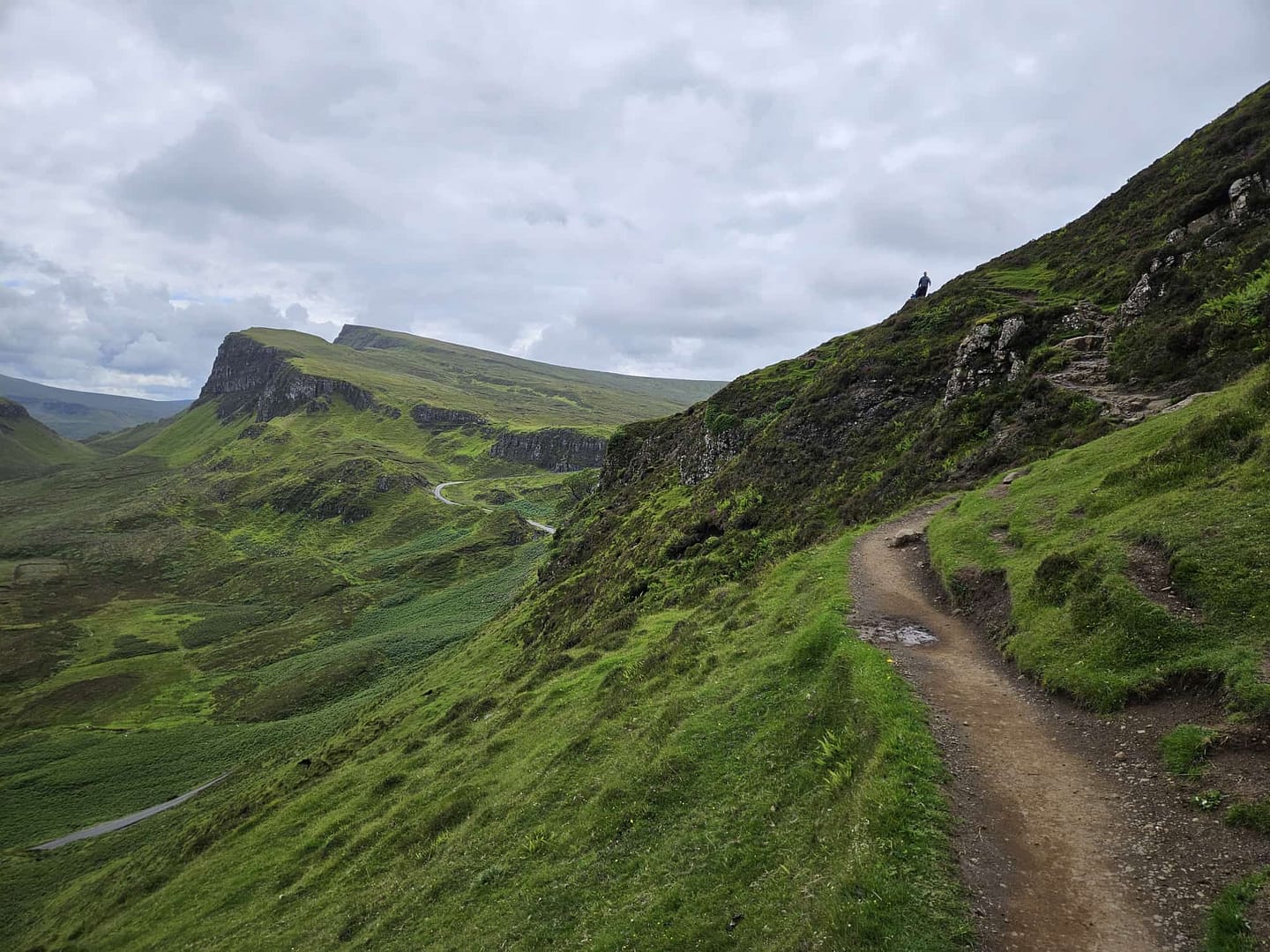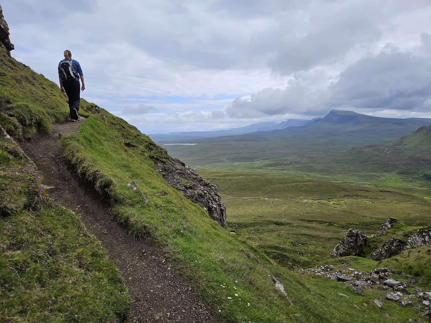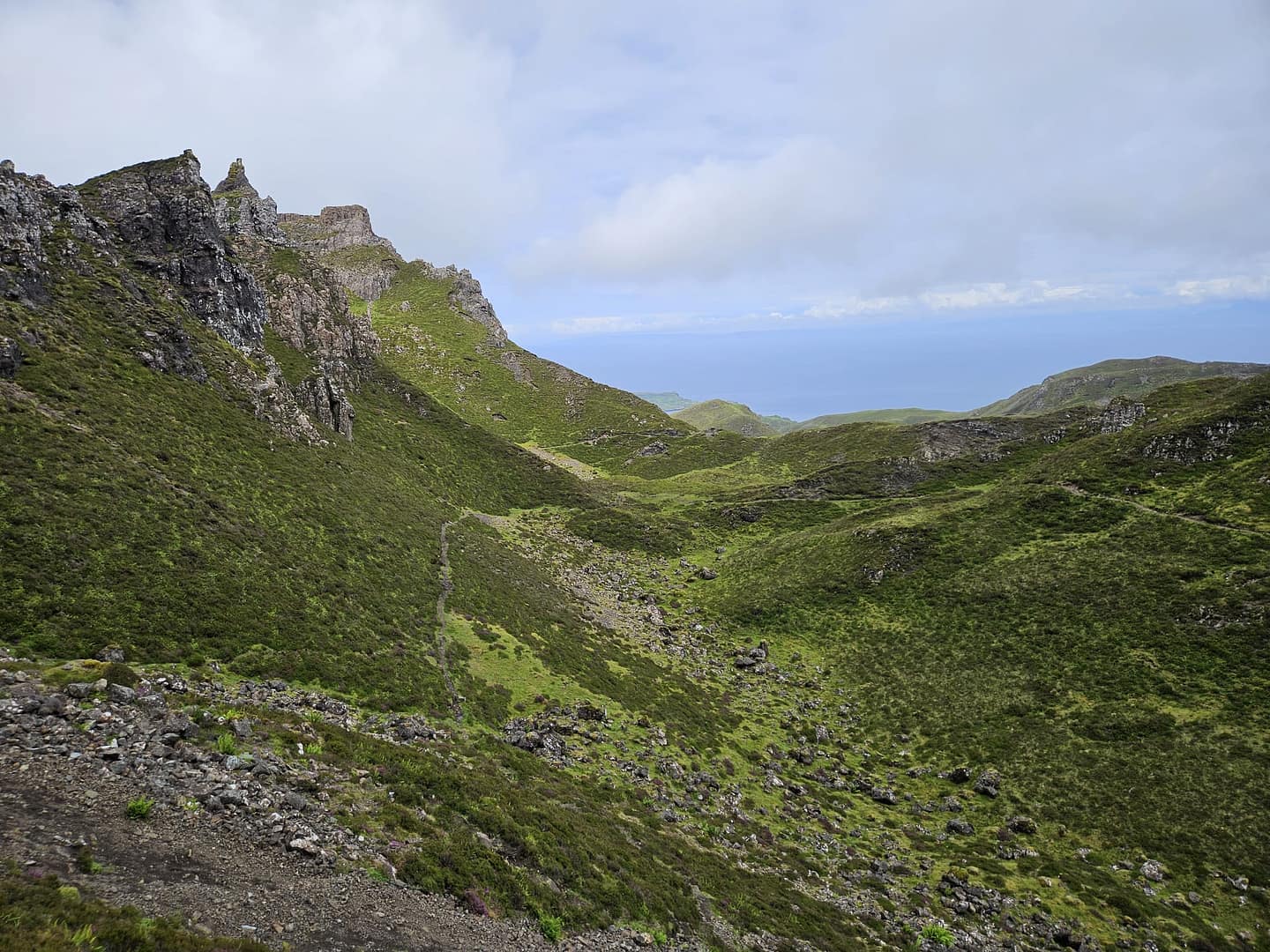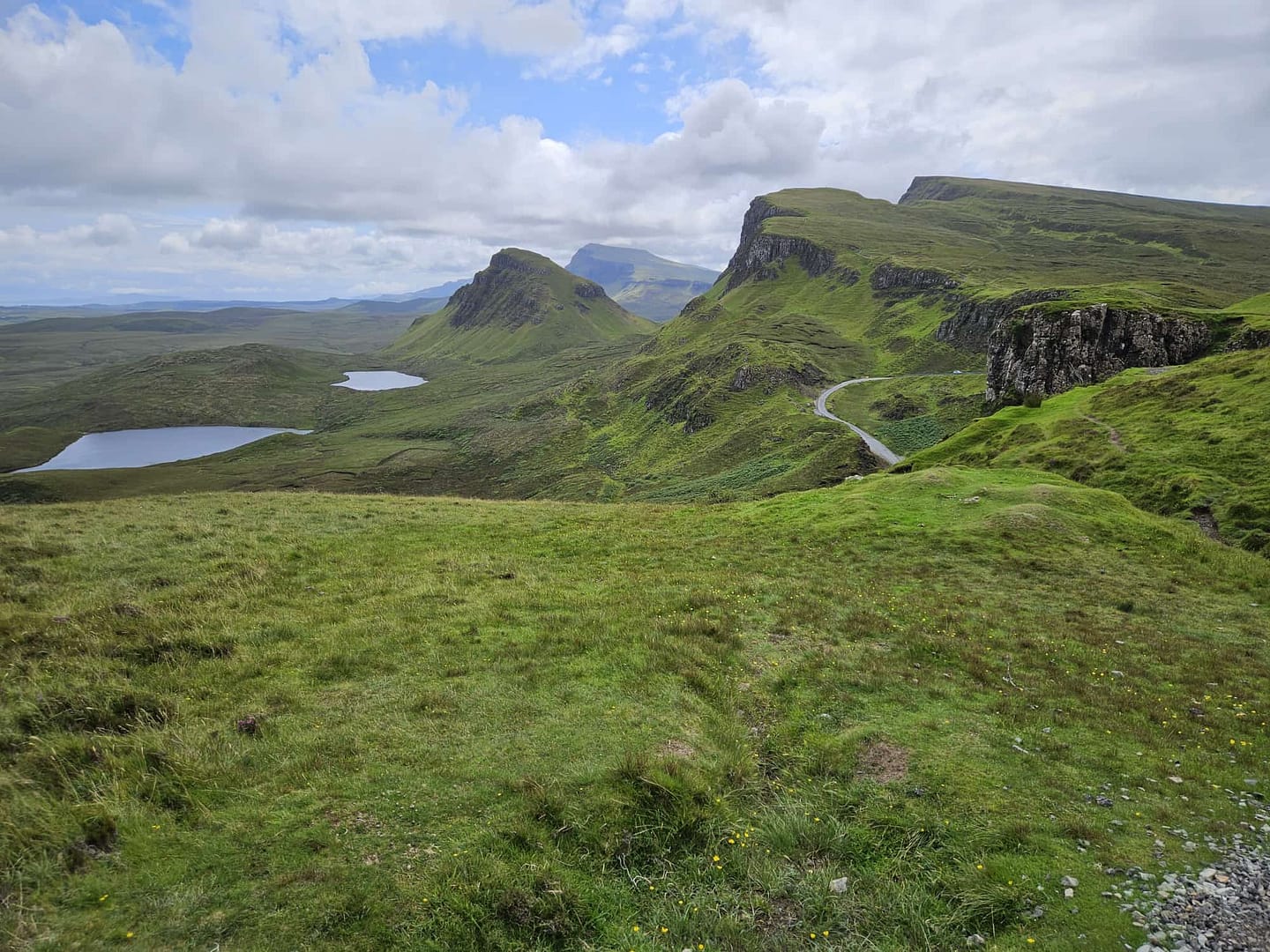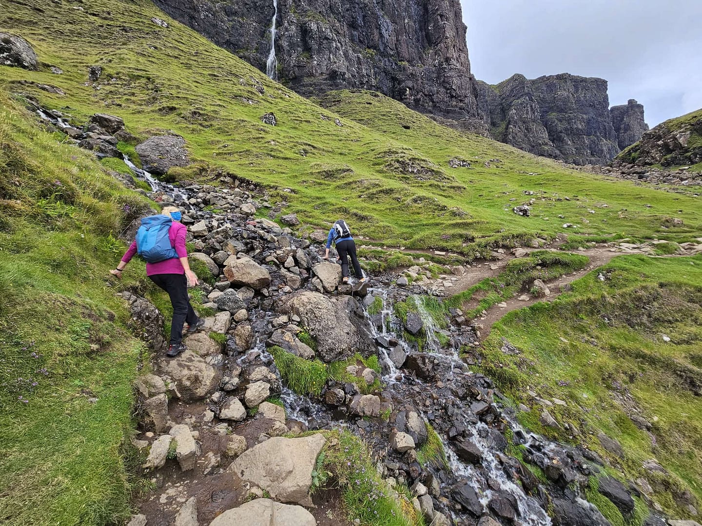Vom Parkplatz aus beginnt der Weg auf einem breiten, gut ausgebauten Pfad, der mit der Zeit schmaler wird und sich über sanft ansteigende grasige Hänge schlängelt. Die ganze Zeit bieten sich beeindruckende Panoramablicke über die offene Landschaft und hinunter zur Staffin Bay. Doch es sind nicht nur die Fernblicke, die faszinieren – immer wieder entdeckt man schmale Wasserfälle, die entlang der Abbruchkanten herabstürzen und den Pfad an manchen Stellen etwas anspruchsvoller gestalten.
