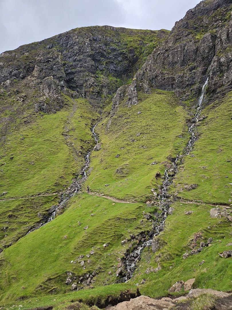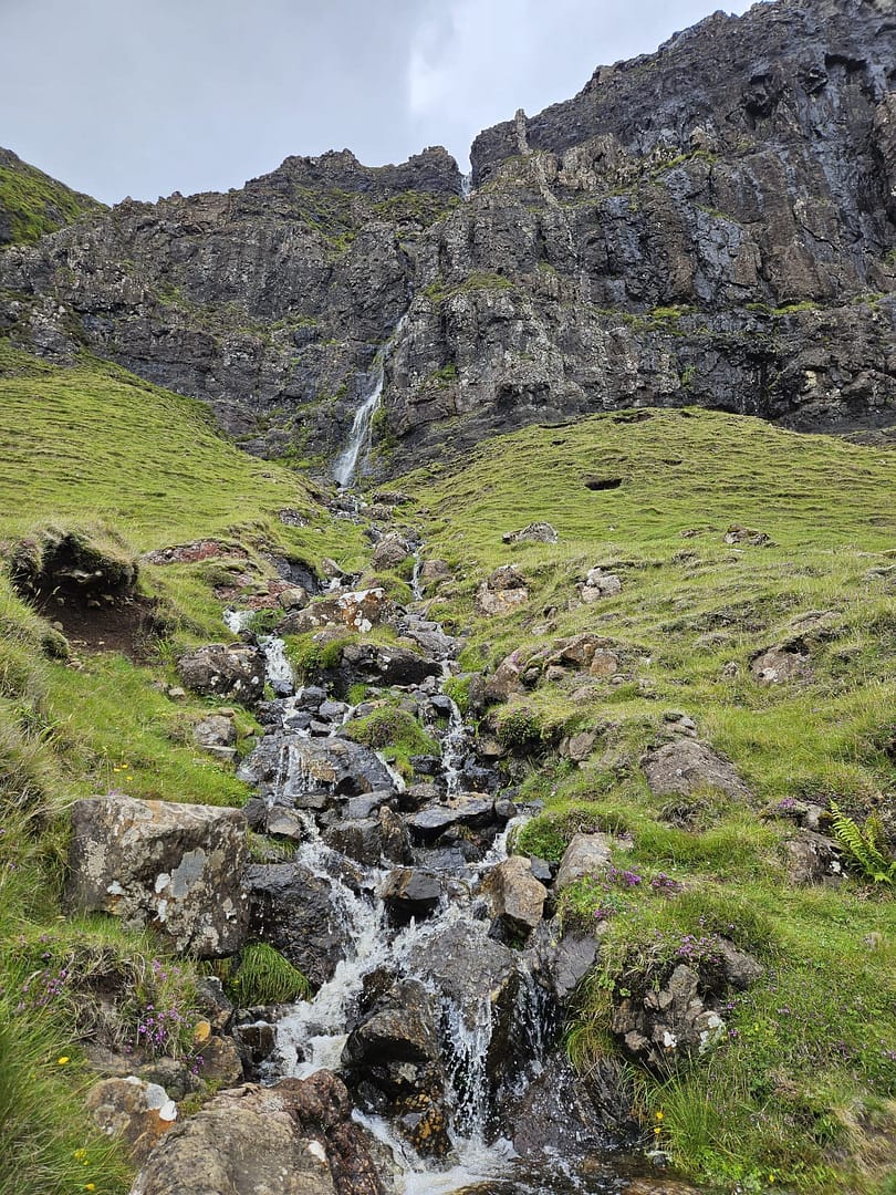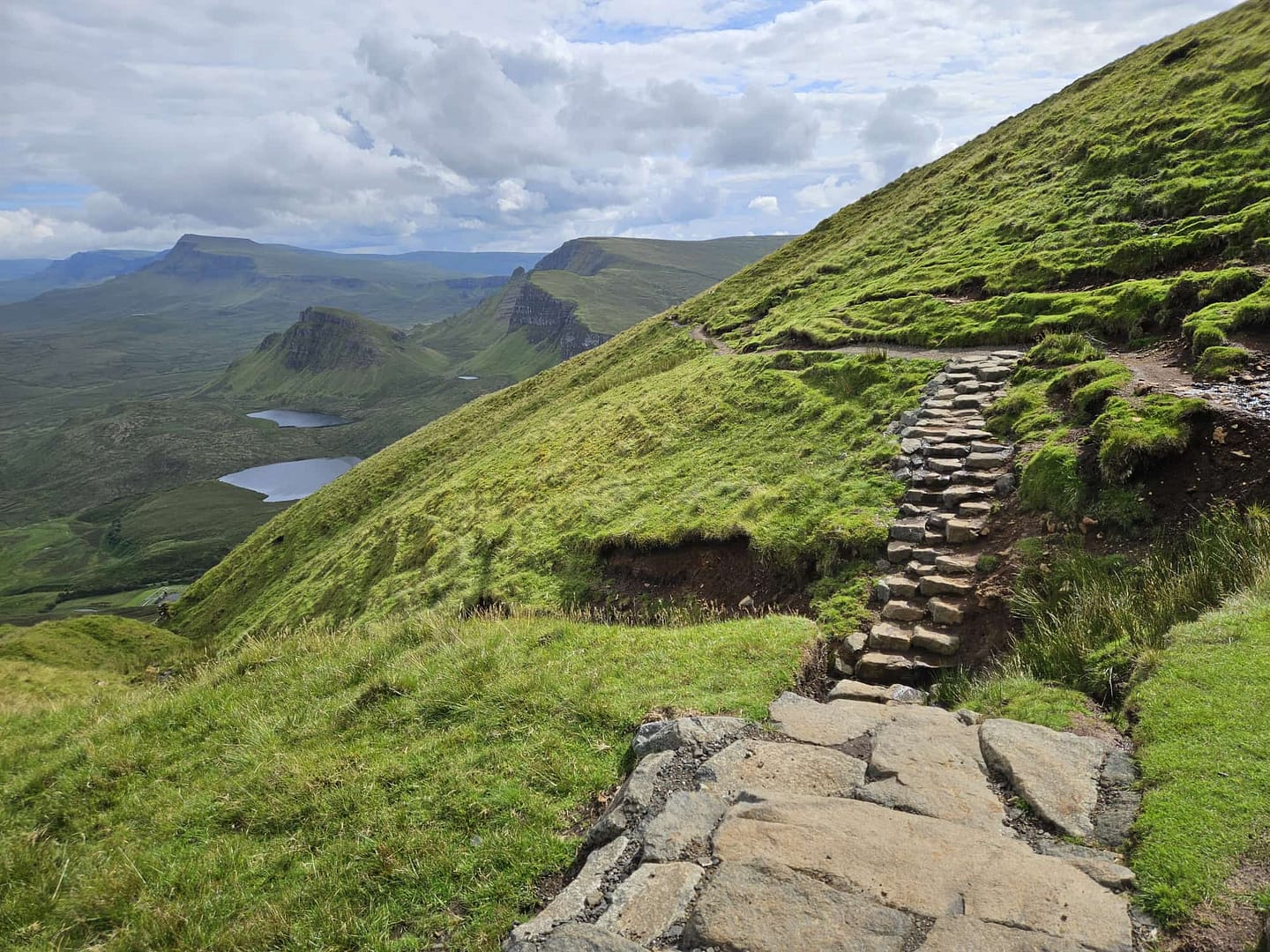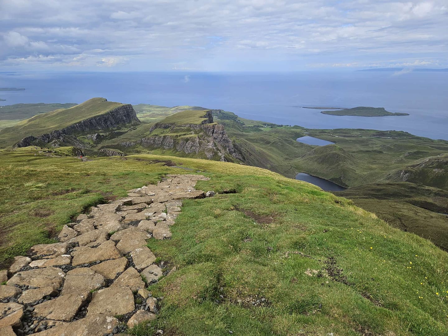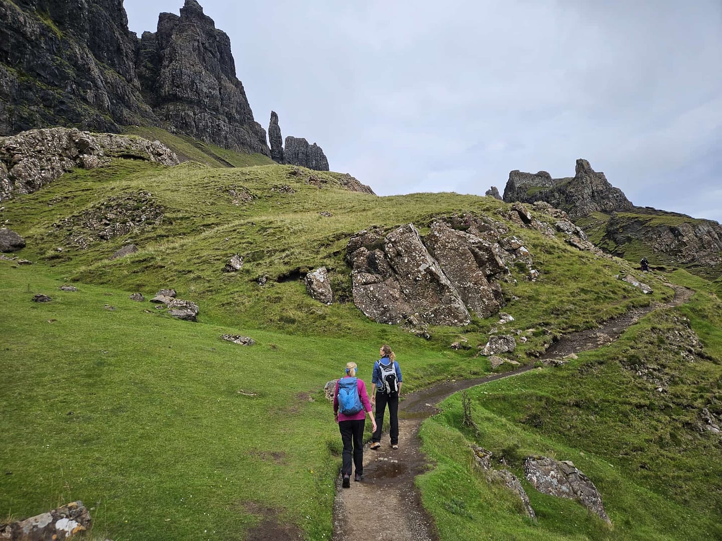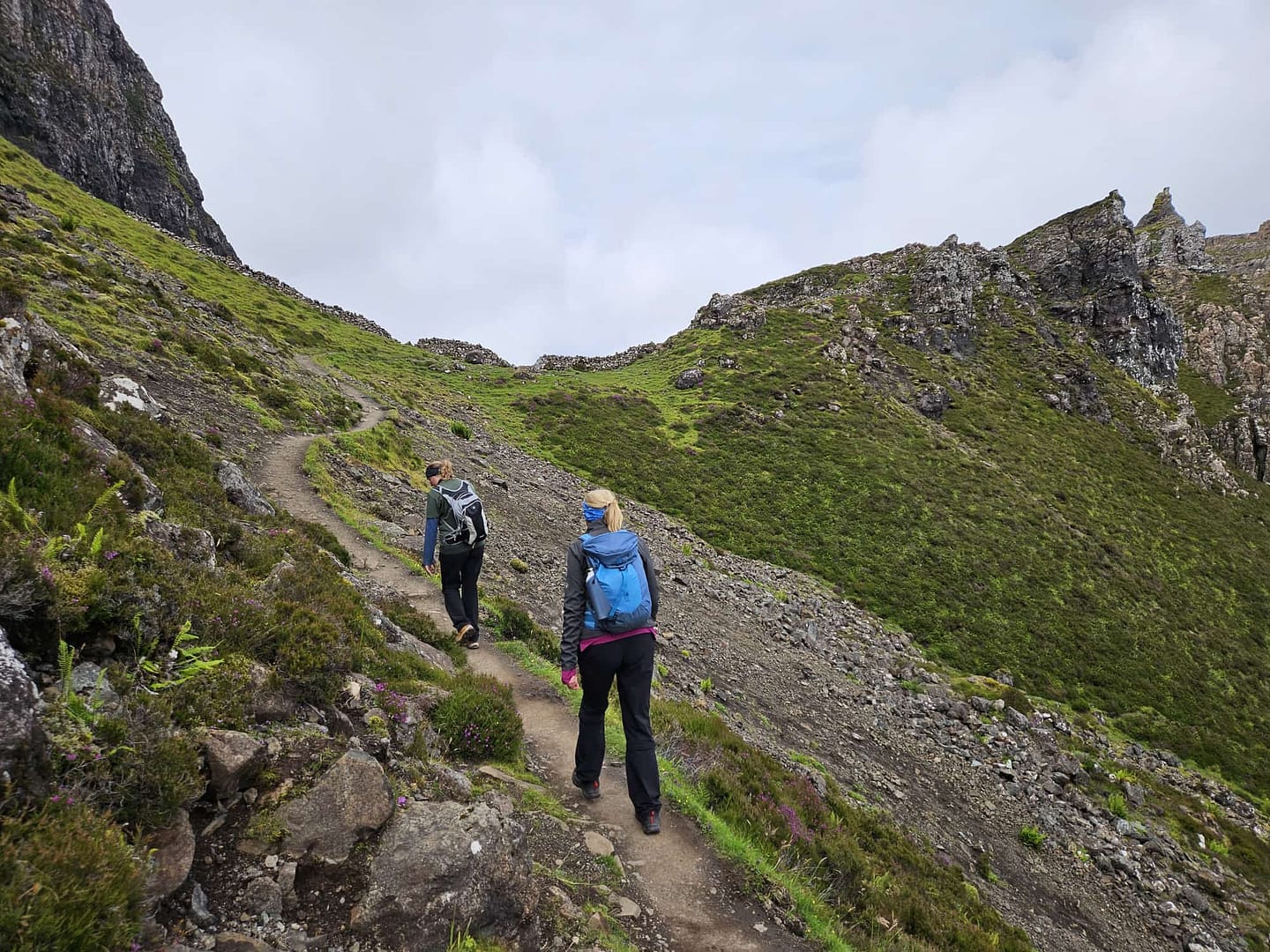 Vom Parkplatz aus beginnt der Weg auf einem breiten, gut ausgebauten Pfad, der mit der Zeit schmaler wird und sich über sanft ansteigende grasige Hänge schlängelt. Die ganze Zeit bieten sich beeindruckende Panoramablicke über die offene Landschaft und hinunter zur Staffin Bay. Doch es sind nicht nur die Fernblicke, die faszinieren – immer wieder entdeckt man schmale Wasserfälle, die entlang der Abbruchkanten herabstürzen und den Pfad an manchen Stellen etwas anspruchsvoller gestalten.