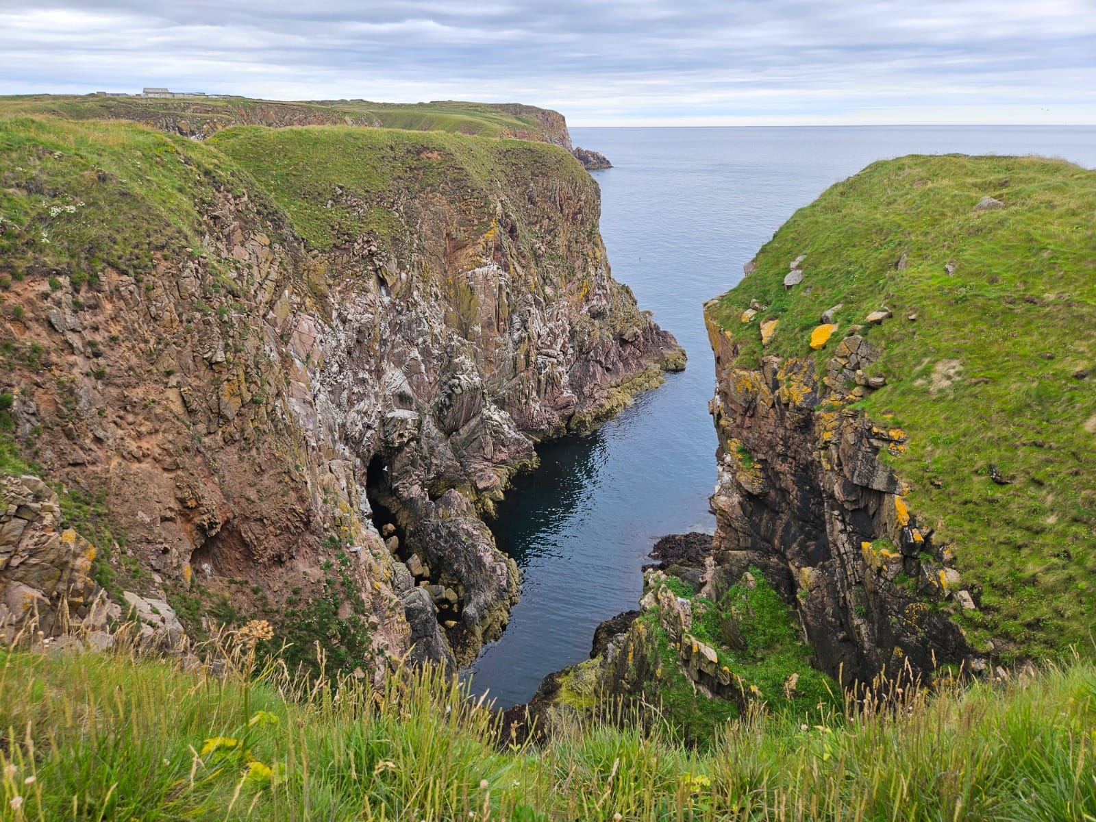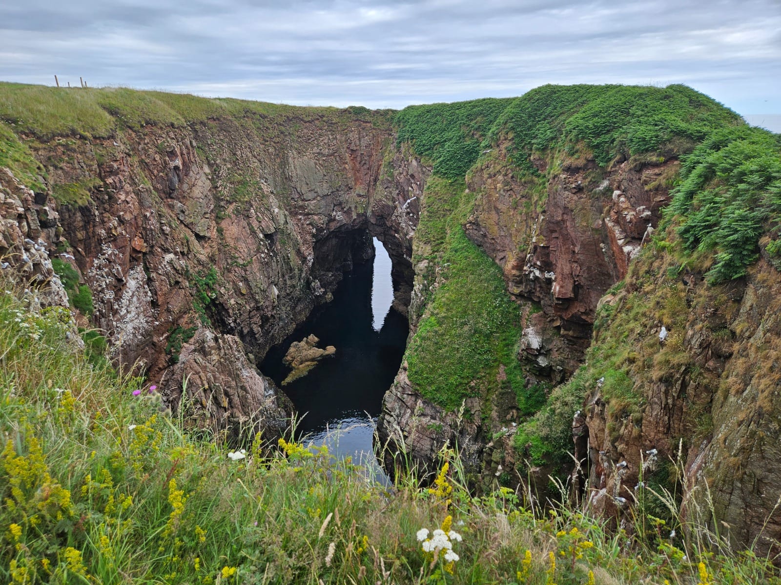 Die Bullers of Buchan zählen zu den eindrucksvollsten Naturphänomenen an Schottlands Ostküste. Dabei handelt es sich um eine eingestürzte Meereshöhle, die über Jahrhunderte hinweg von der Kraft der Nordsee geformt wurde. Heute ist daraus ein nahezu kreisrundes Felsbecken entstanden, das nur durch einen schmalen Spalt mit dem offenen Meer verbunden ist.