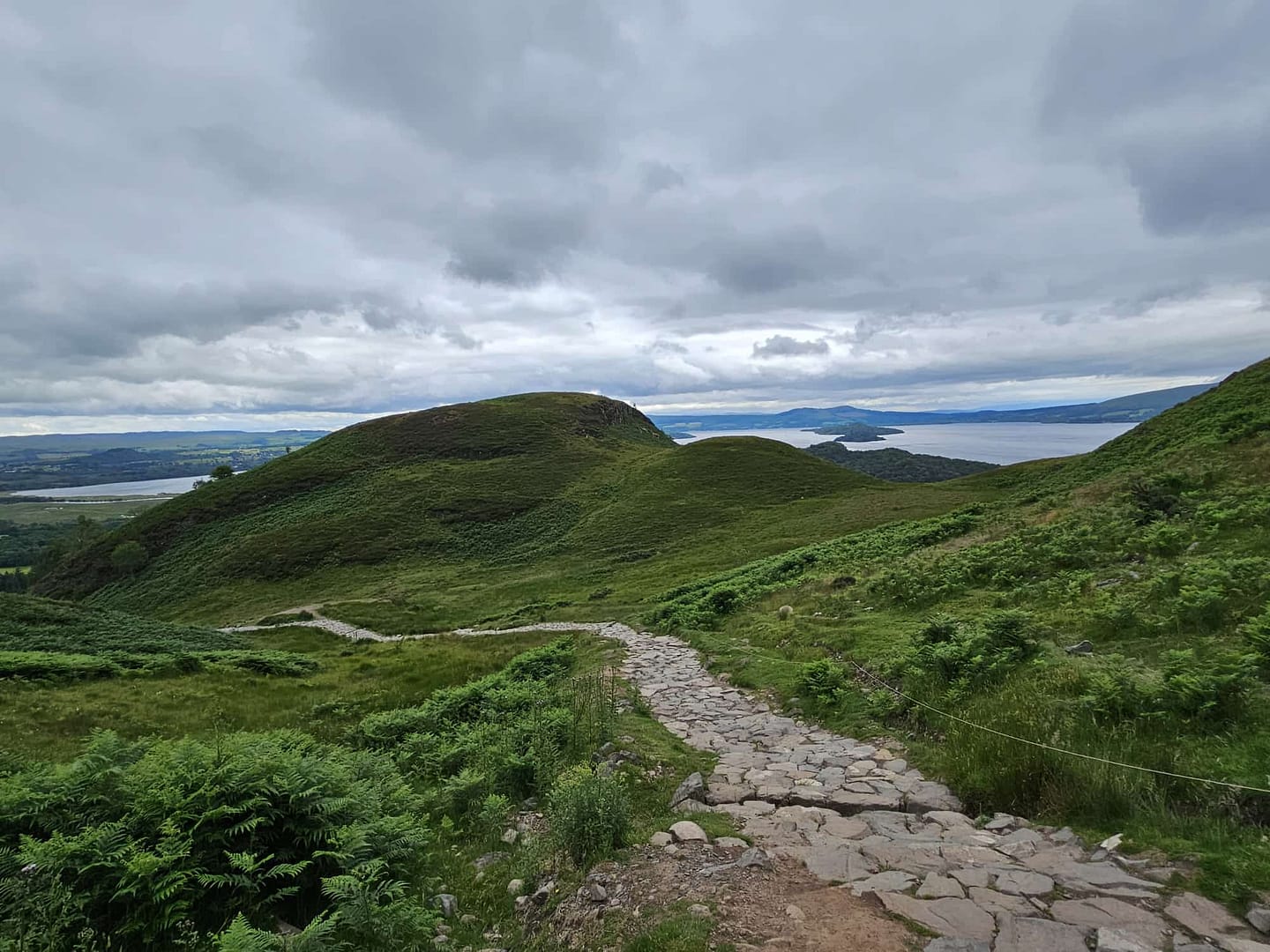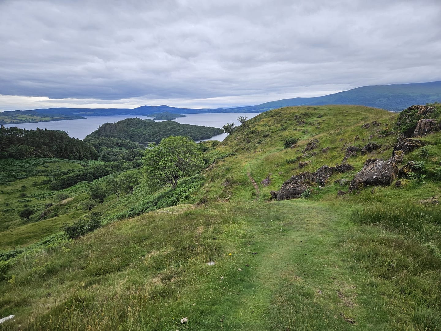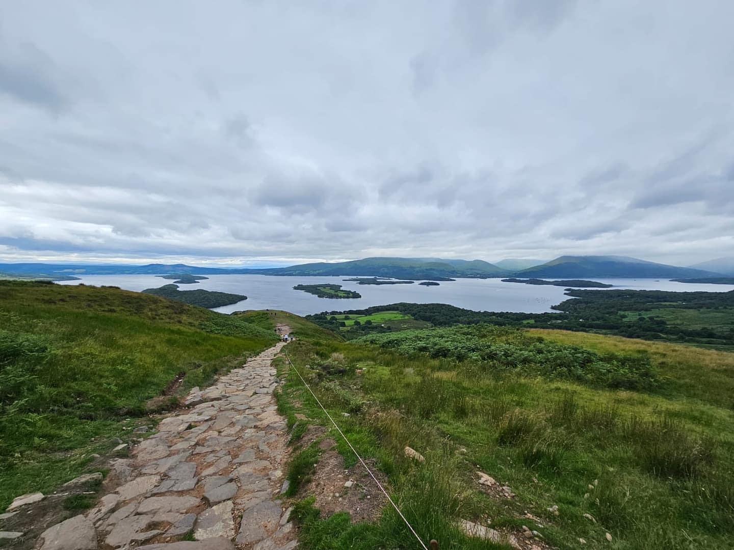 Am Gipfel angekommen, bietet sich ein spektakulärer Panoramablick über den See und seine zahlreichen Inseln (wie Inchcailloch und Inchfad). An klaren Tagen reicht die Sicht bis zu den Bergen der Highlands im Norden – ein echtes Highlight!