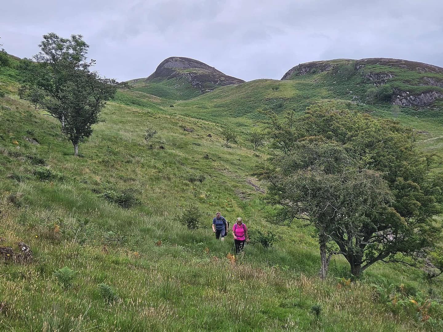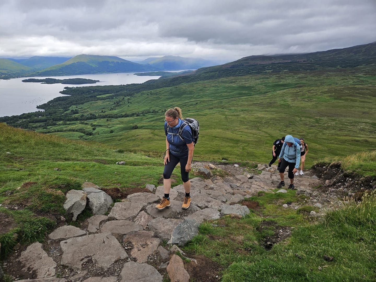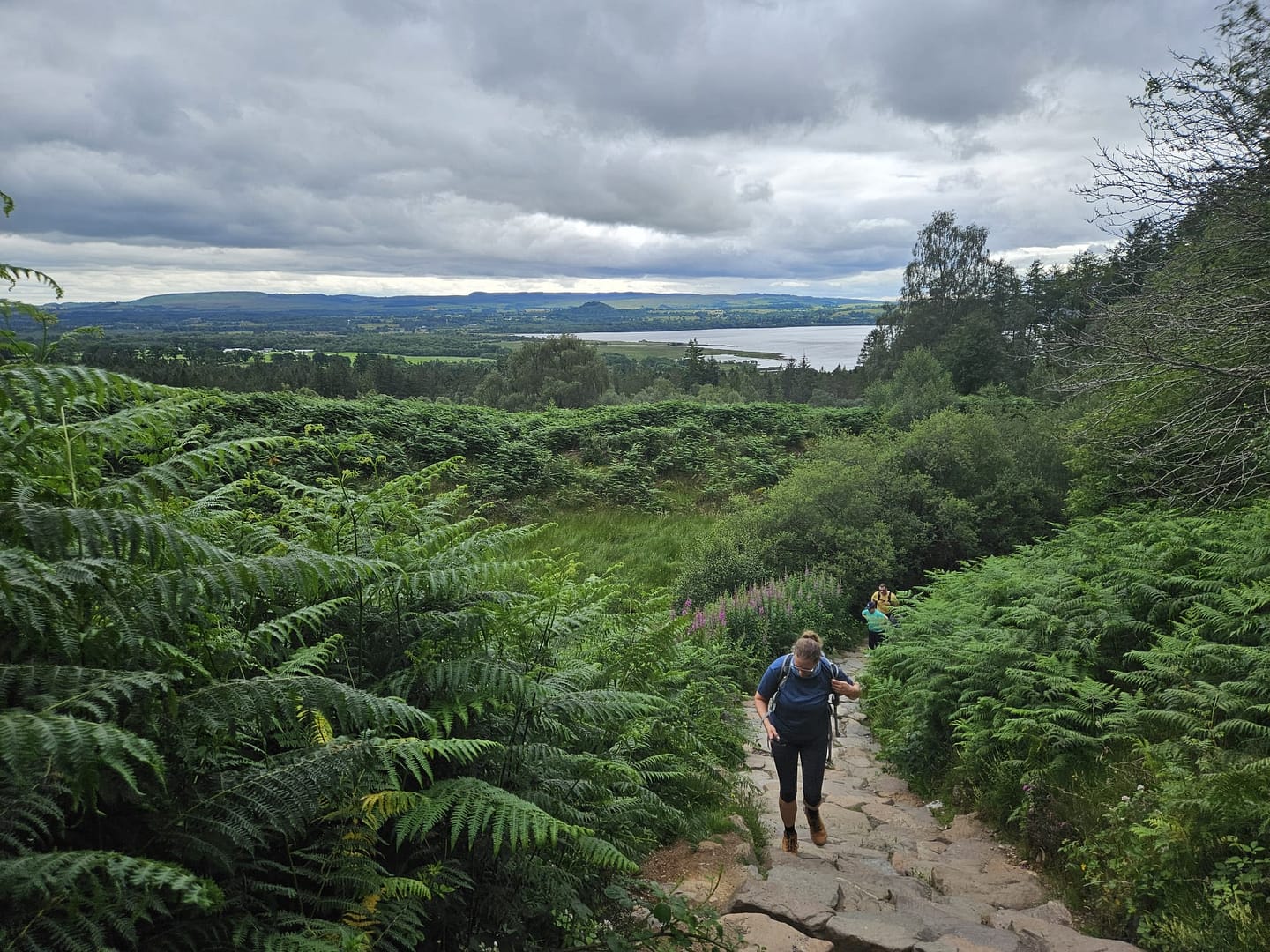 Am Gipfel angekommen, bietet sich ein spektakulärer Panoramablick über den See und seine zahlreichen Inseln (wie Inchcailloch und Inchfad). An klaren Tagen reicht die Sicht bis zu den Bergen der Highlands im Norden – ein echtes Highlight!