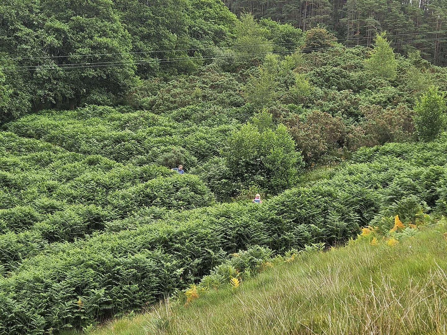 Abstieg: In der Outdooractive-App entdeckten wir die Möglichkeit, eine Rundtour daraus zu machen. Unser Fazit: nicht empfehlenswert. Der Abstieg in südwestlicher Richtung führte zunächst über einen gut sichtbaren Trampelpfad, der jedoch weiter unten zunehmend zugewachsen und schwer begehbar war. Der Farn wuchs stellenweise so hoch, dass ein Durchkommen kaum möglich war. Nach mehreren gescheiterten Versuchen, den richtigen Weg zu finden, landeten wir schließlich abenteuerlich auf einem privaten Grundstück.