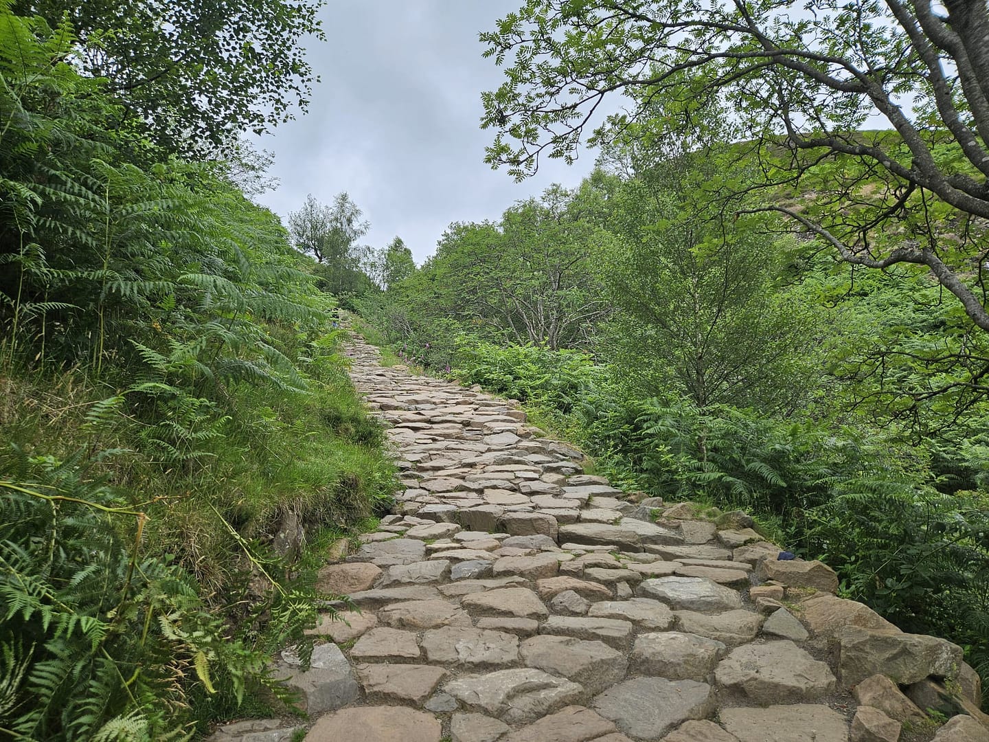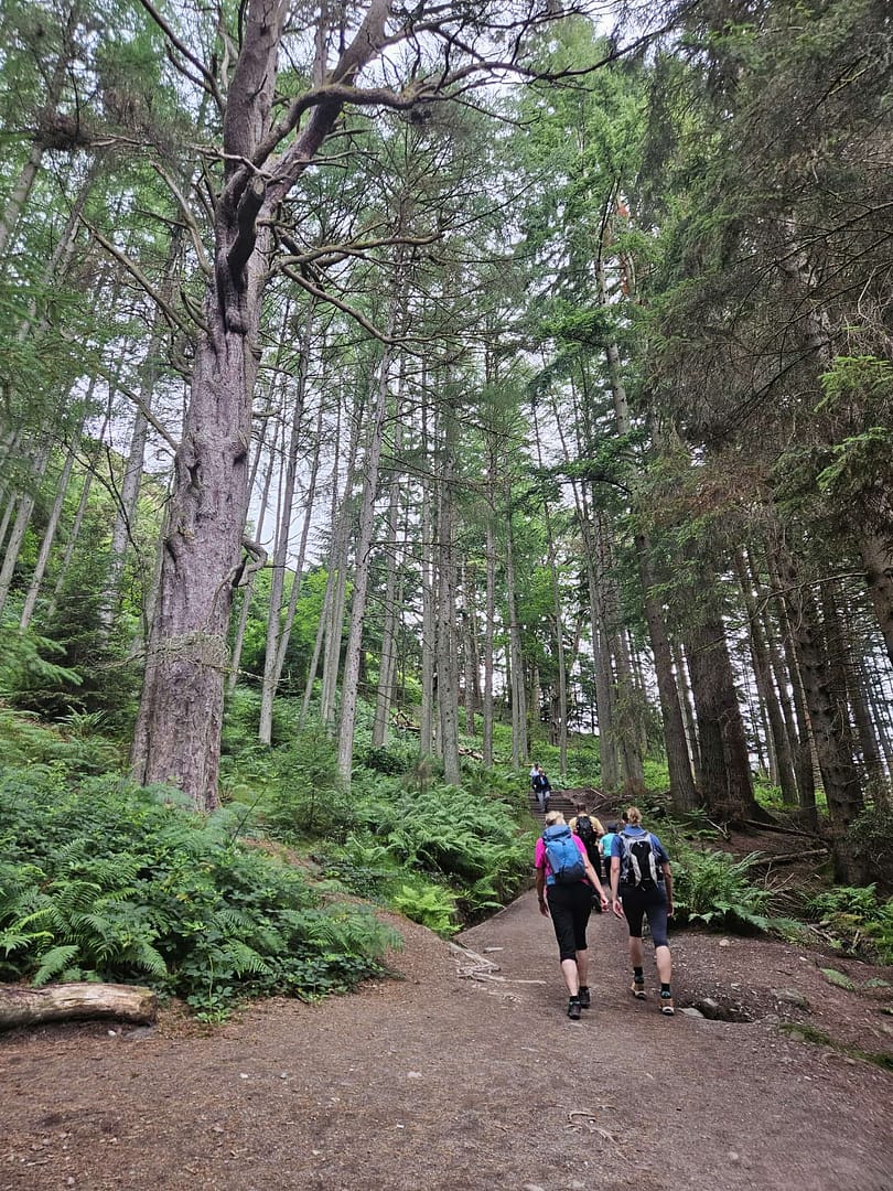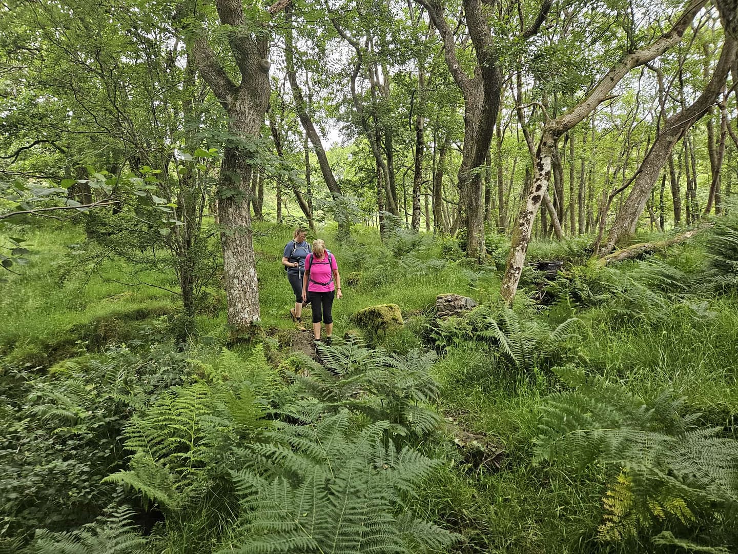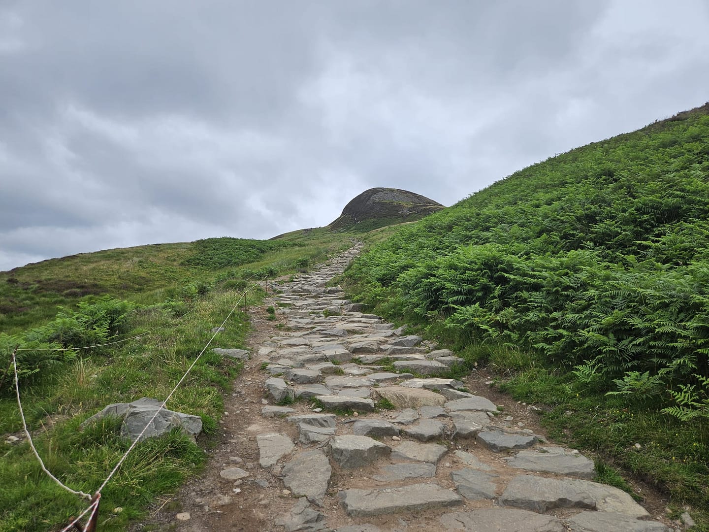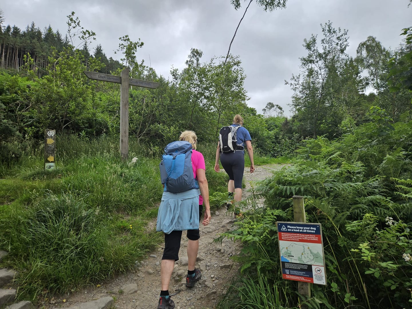 „Conic“ bedeutet „kegelförmig“ – und tatsächlich beeindruckt der Hügel mit seiner auffällig symmetrischen Kegelform. Der Wanderweg zum Gipfel startet im hinteren Eck des Parkplatzes. Dort folgen wir dem Wegweiser „Conic Hill Path“ in nordöstliche Richtung. Zunächst führt der Weg durch einen lichten Wald, der stellenweise mit Holztreppen ausgebaut ist. Weiter oben ist der Pfad mit großen Steinen gepflastert und steigt teilweise stufig den Hang hinauf. Immer wieder lohnt sich ein Blick zurück: Der Loch Lomond breitet sich in seiner ganzen Pracht aus und eröffnet bereits hier fantastische Aussichten.