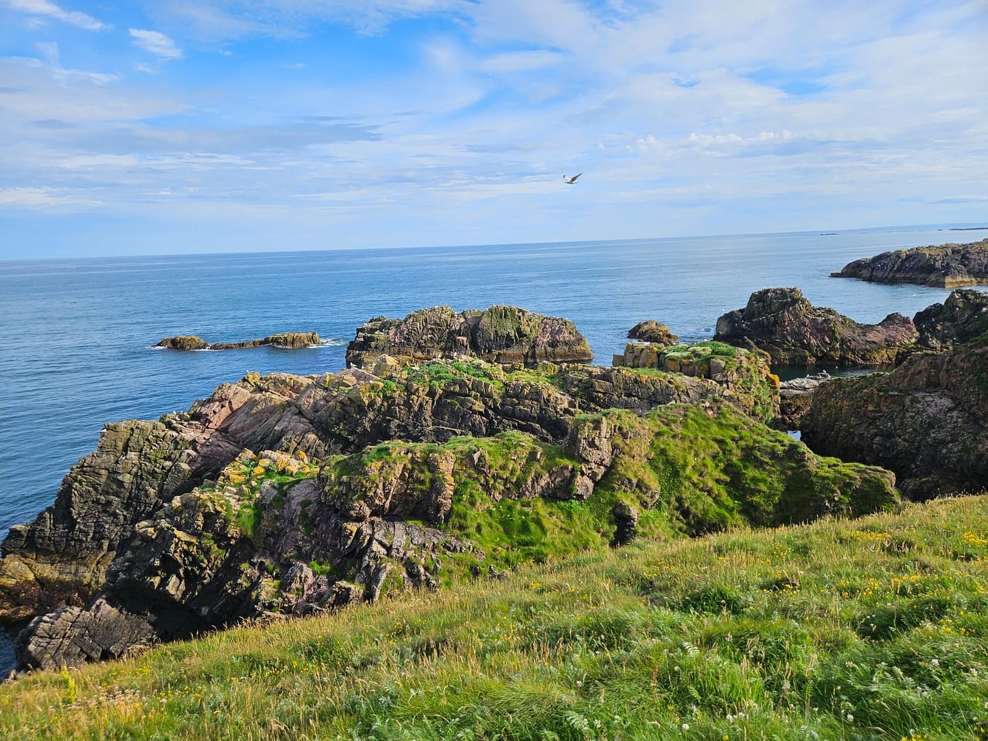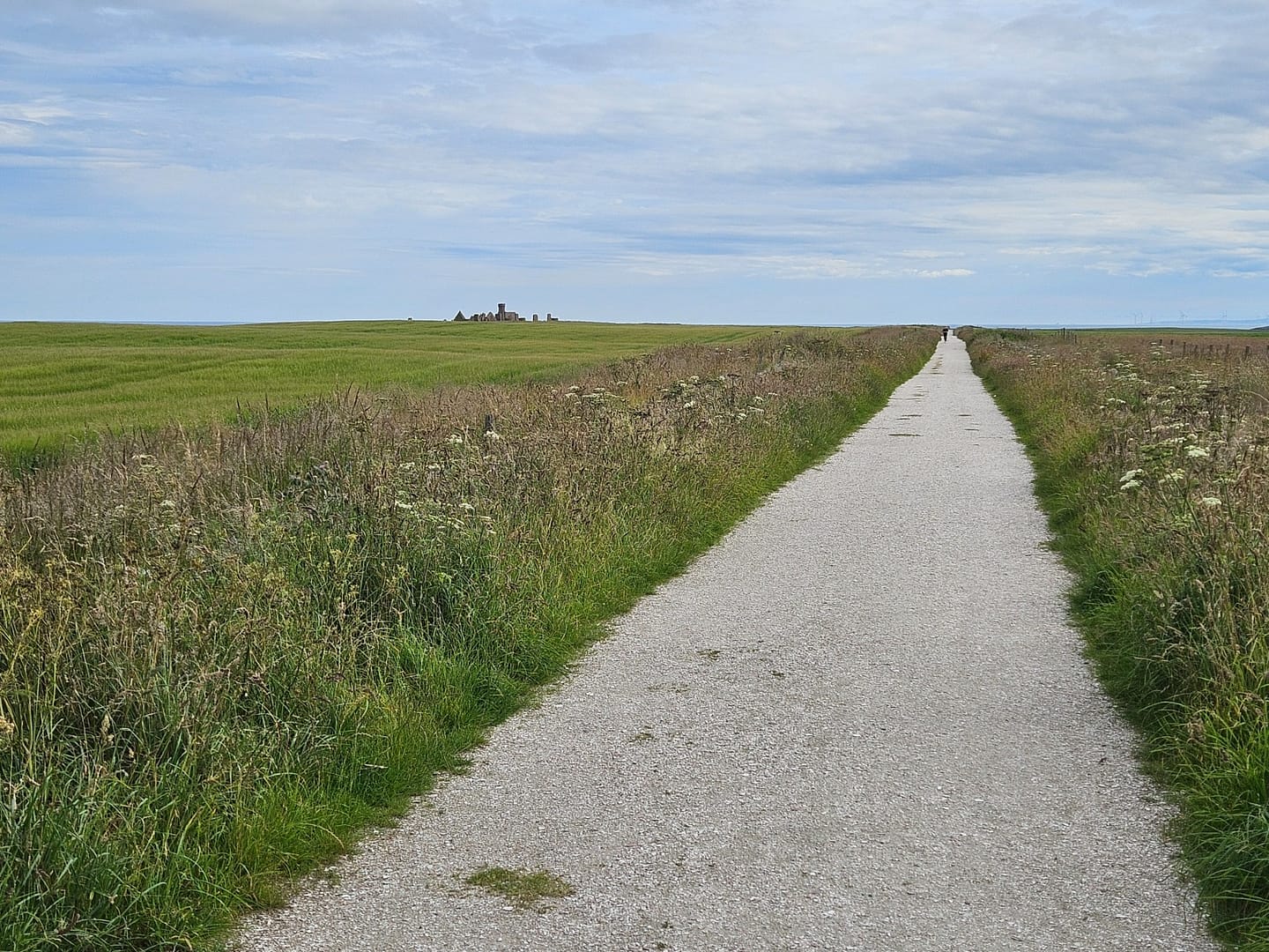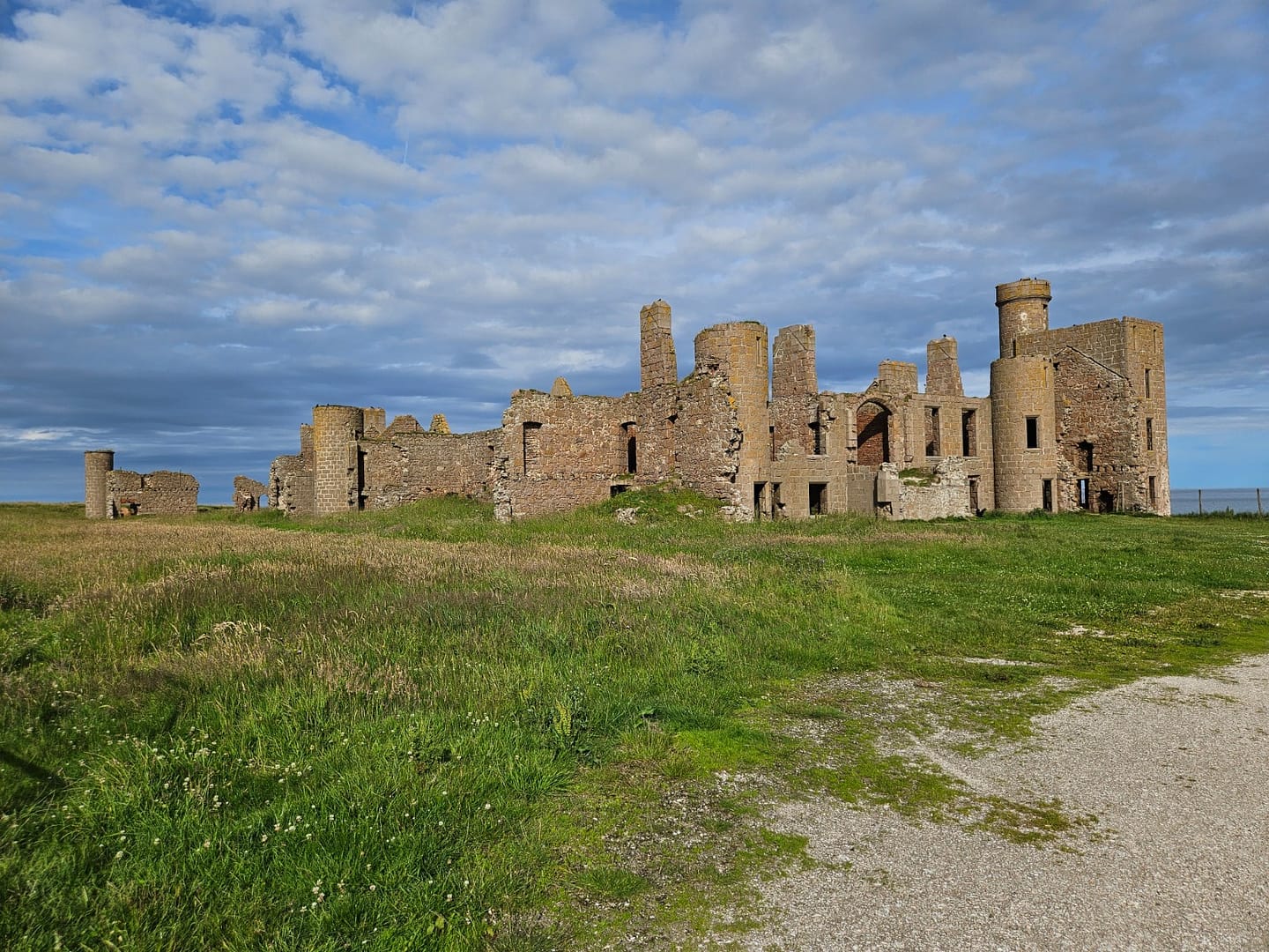 Vom Parkplatz aus laufen wir etwa einen Kilometer auf einem gut angelegten Weg zur Ruine. New Slains Castle ist eine eindrucksvolle Schlossruine an der Ostküste Schottlands, die spektakulär auf steilen Klippen hoch über der Nordsee thront. Ursprünglich ab 1597 für Francis Hay, den 9. Earl of Erroll, erbaut, wurde das Schloss im 19. Jahrhundert zu einem prunkvollen Landsitz im Scots-Baronial-Stil ausgebaut, bevor es im 20. Jahrhundert dem Verfall überlassen wurde.