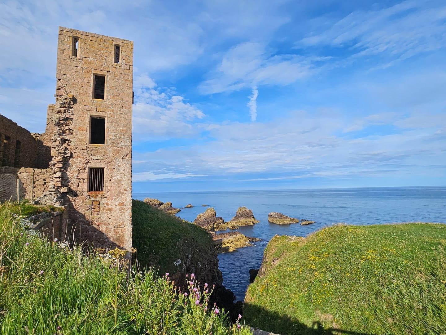 Heute steht nur noch ein dachloser Ruinenkomplex, dessen Außen- und Innenmauern größtenteils erhalten sind. Gerade das verleiht dem Ort eine ganz besondere Atmosphäre: New Slains Castle lässt sich frei erkunden und bietet ein stimmungsvolles, fast mystisches Erlebnis.