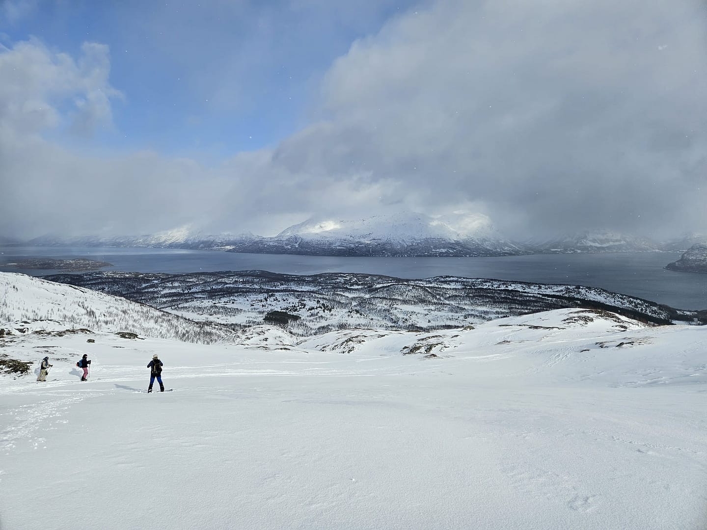 Nachdem es zwei Tage lang heftig gestürmt hatte – laut Wetterbericht mit Böen von bis zu 124 km/h am Gipfel – war an eine Skitour zunächst nicht zu denken. Umso größer war die Hoffnung, denn laut Prognose sollte sich das Wetter heute endlich beruhigen. Der Tag begann zwar weiterhin wechselhaft mit einem Mix aus Sonne und Schneeschauern, doch wir entschieden uns trotzdem, es zu versuchen. Gegen Mittag starteten wir schließlich am Parkplatz Rottenvikelva unsere Skitour.
