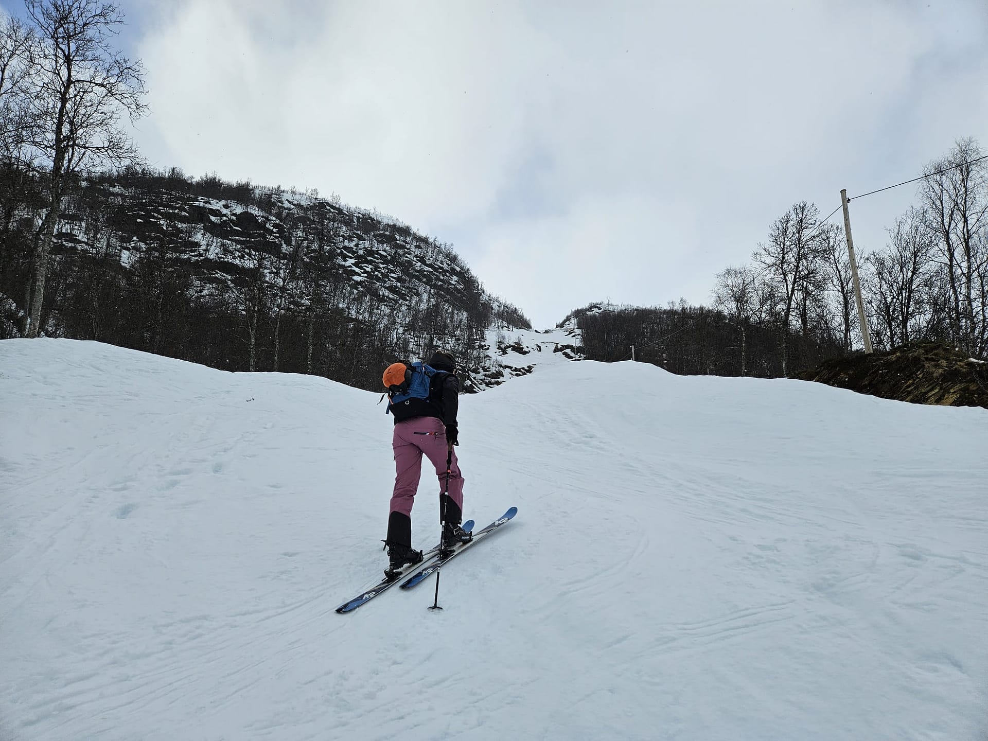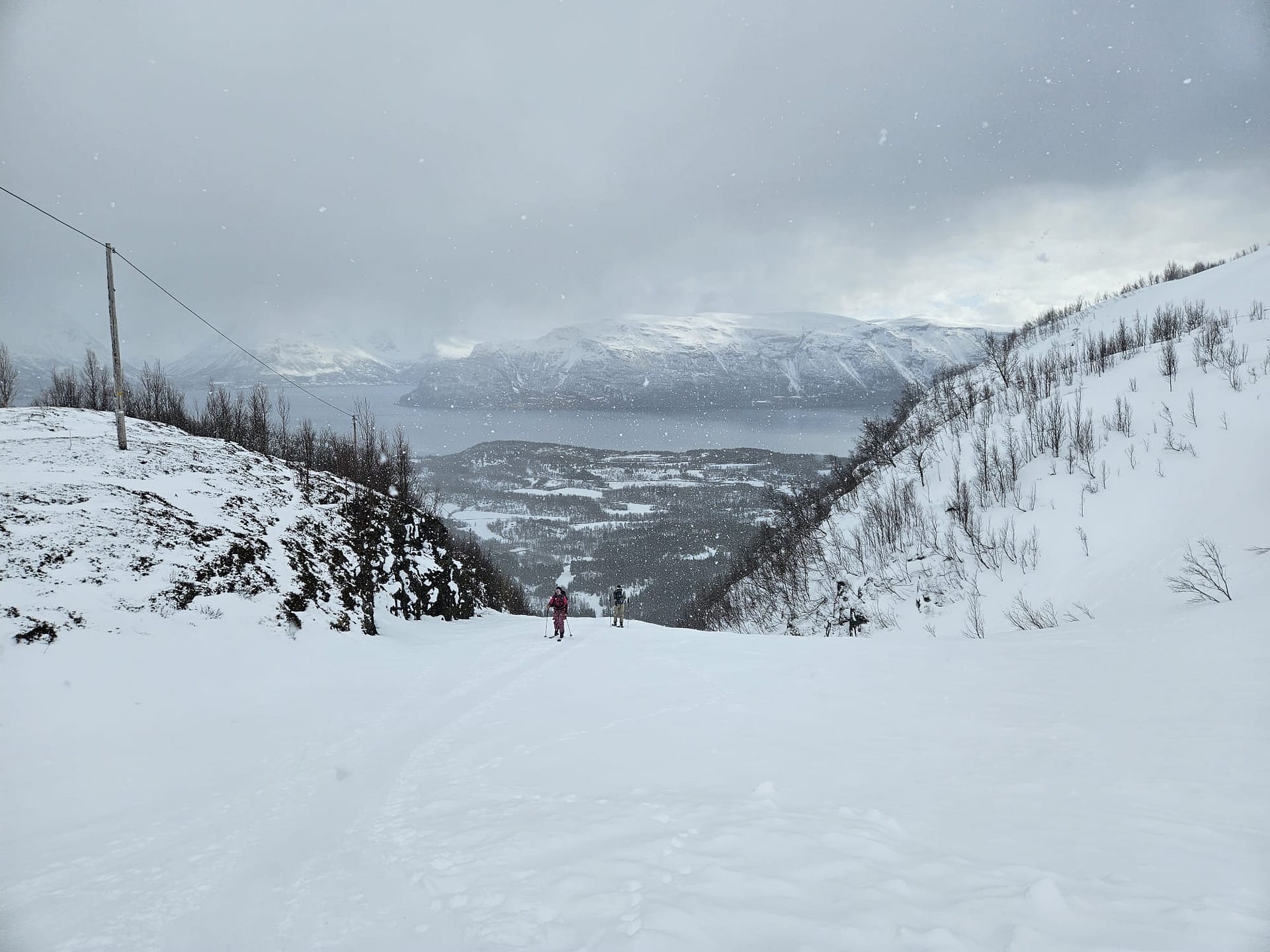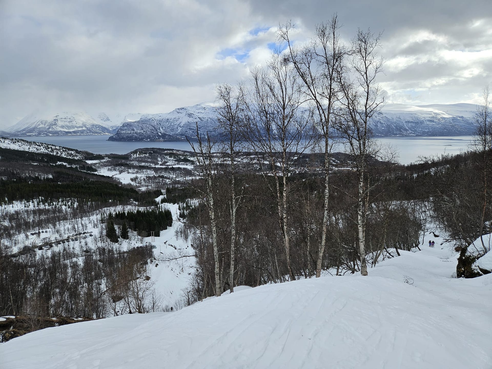 Nachdem es zwei Tage lang heftig gestürmt hatte – laut Wetterbericht mit Böen von bis zu 124 km/h am Gipfel – war an eine Skitour zunächst nicht zu denken. Umso größer war die Hoffnung, denn laut Prognose sollte sich das Wetter heute endlich beruhigen. Der Tag begann zwar weiterhin wechselhaft mit einem Mix aus Sonne und Schneeschauern, doch wir entschieden uns trotzdem, es zu versuchen. Gegen Mittag starteten wir schließlich am Parkplatz Rottenvikelva unsere Skitour.