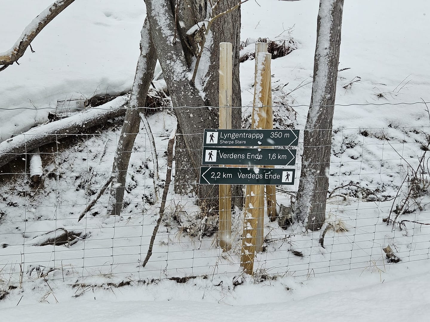 Die ersten etwa 150 Meter legten wir zu Fuß auf der Straße zurück, bis wir einen verschneiten Hang erreichten. Dort schnallten wir die Felle an und stiegen über den Hang die ersten rund 40 Höhenmeter bis zum Wanderweg „Verdens Ende“ auf. An einem Wegweiser folgten wir dem Pfad nach links und hielten uns weiter entlang des Wanderwegs.