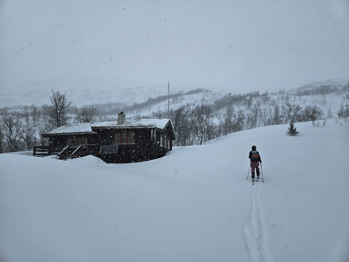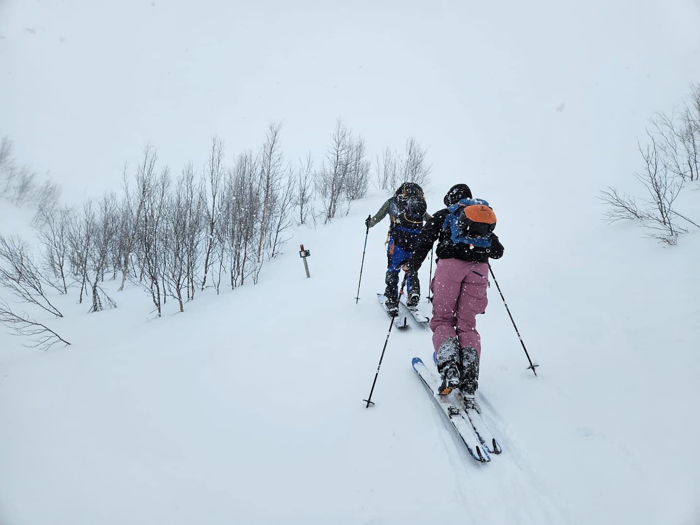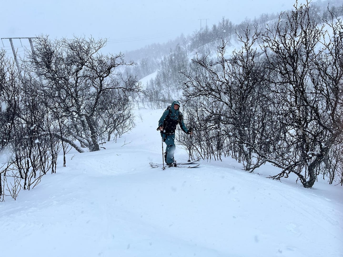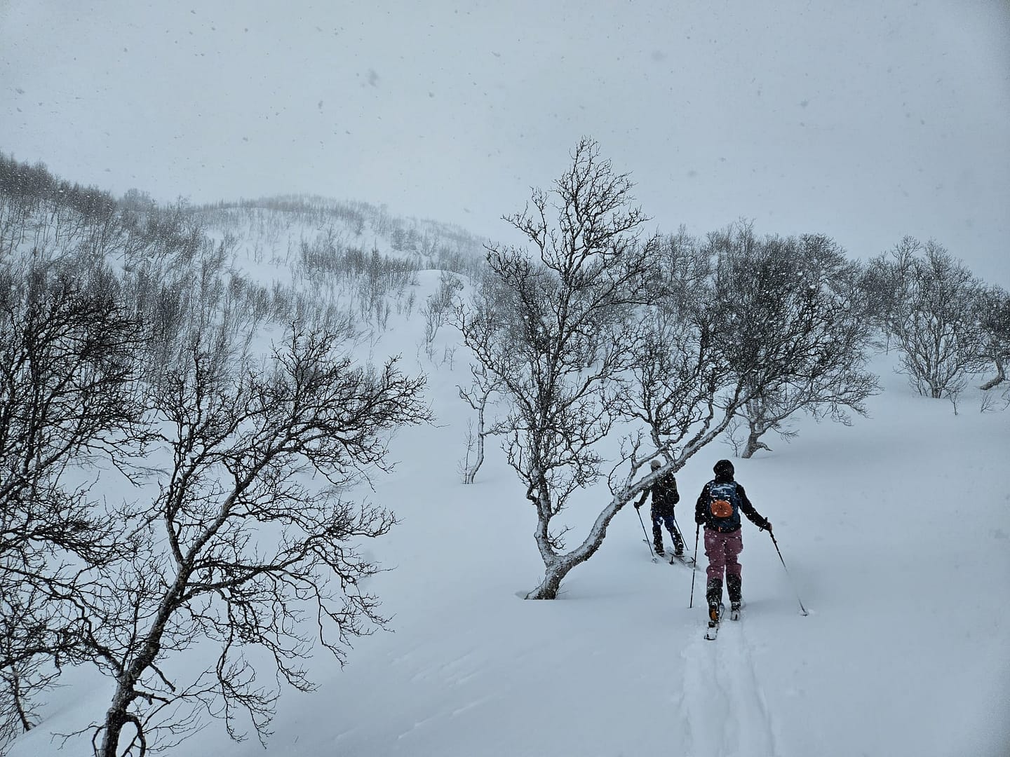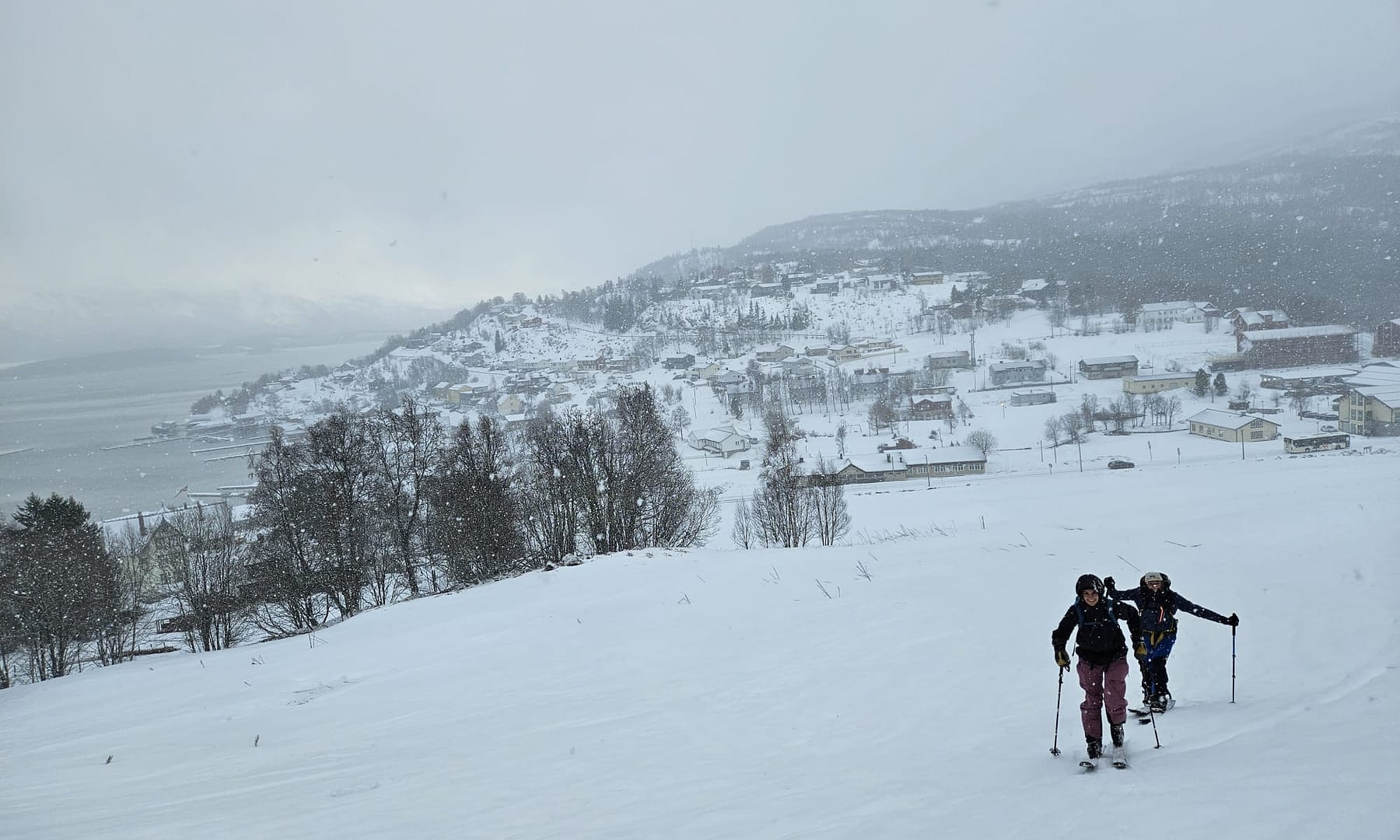 Unser Ziel war es, bis auf etwa 900 Höhenmeter aufzusteigen. Allerdings verschlechterten sich die Sichtverhältnisse zunehmend, der Wind nahm stark zu, und schließlich befanden wir uns praktisch im Whiteout. Daher entschieden wir uns, die Tour etwa 100 Höhenmeter oberhalb des Langvatnet-Sees abzubrechen.