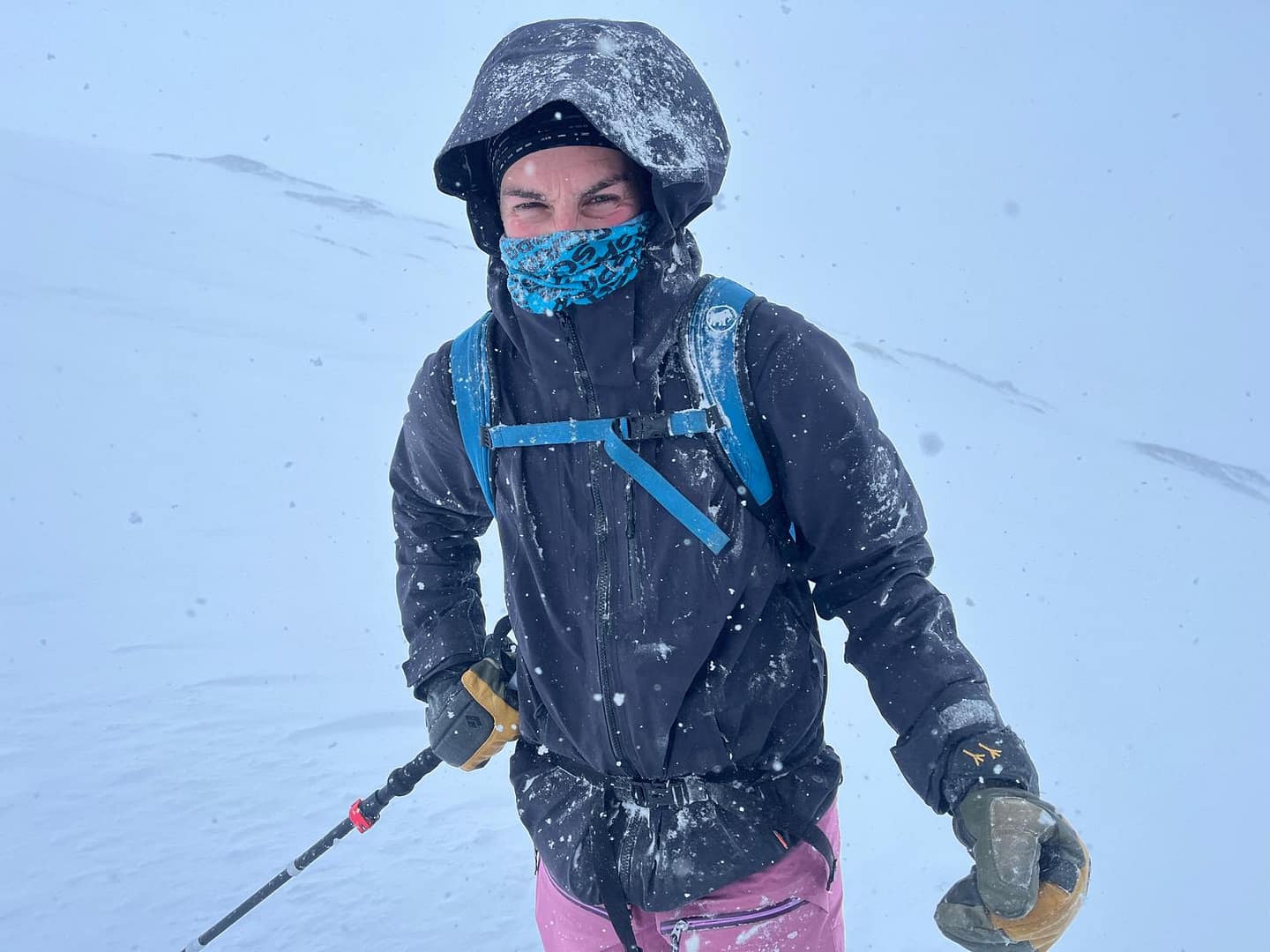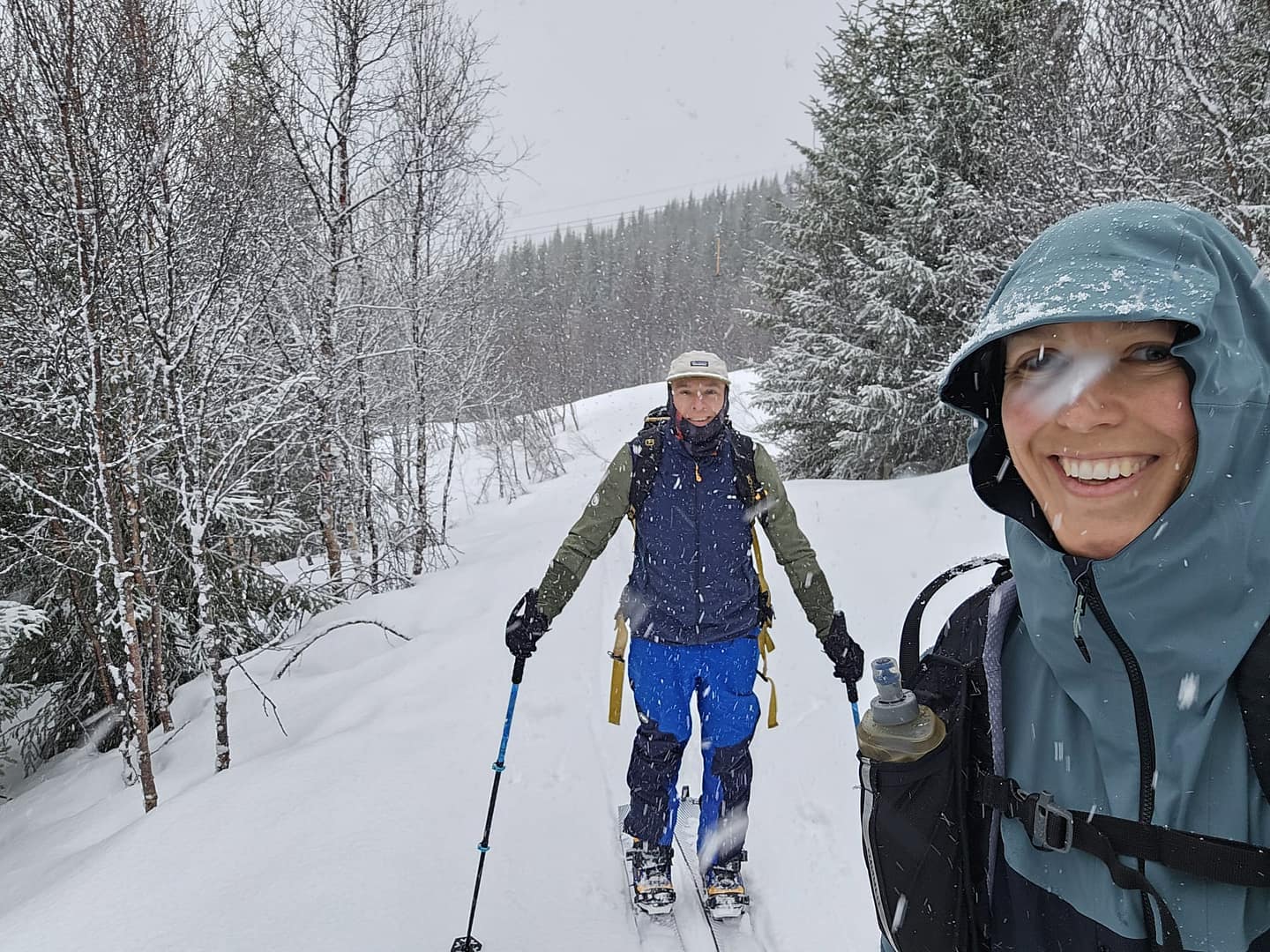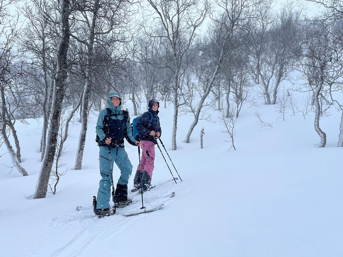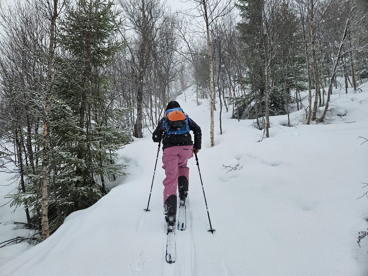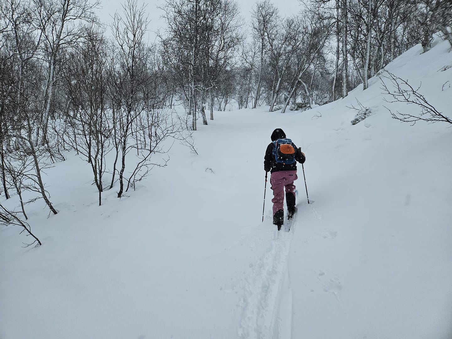 Unser Ziel war es, bis auf etwa 900 Höhenmeter aufzusteigen. Allerdings verschlechterten sich die Sichtverhältnisse zunehmend, der Wind nahm stark zu, und schließlich befanden wir uns praktisch im Whiteout. Daher entschieden wir uns, die Tour etwa 100 Höhenmeter oberhalb des Langvatnet-Sees abzubrechen.