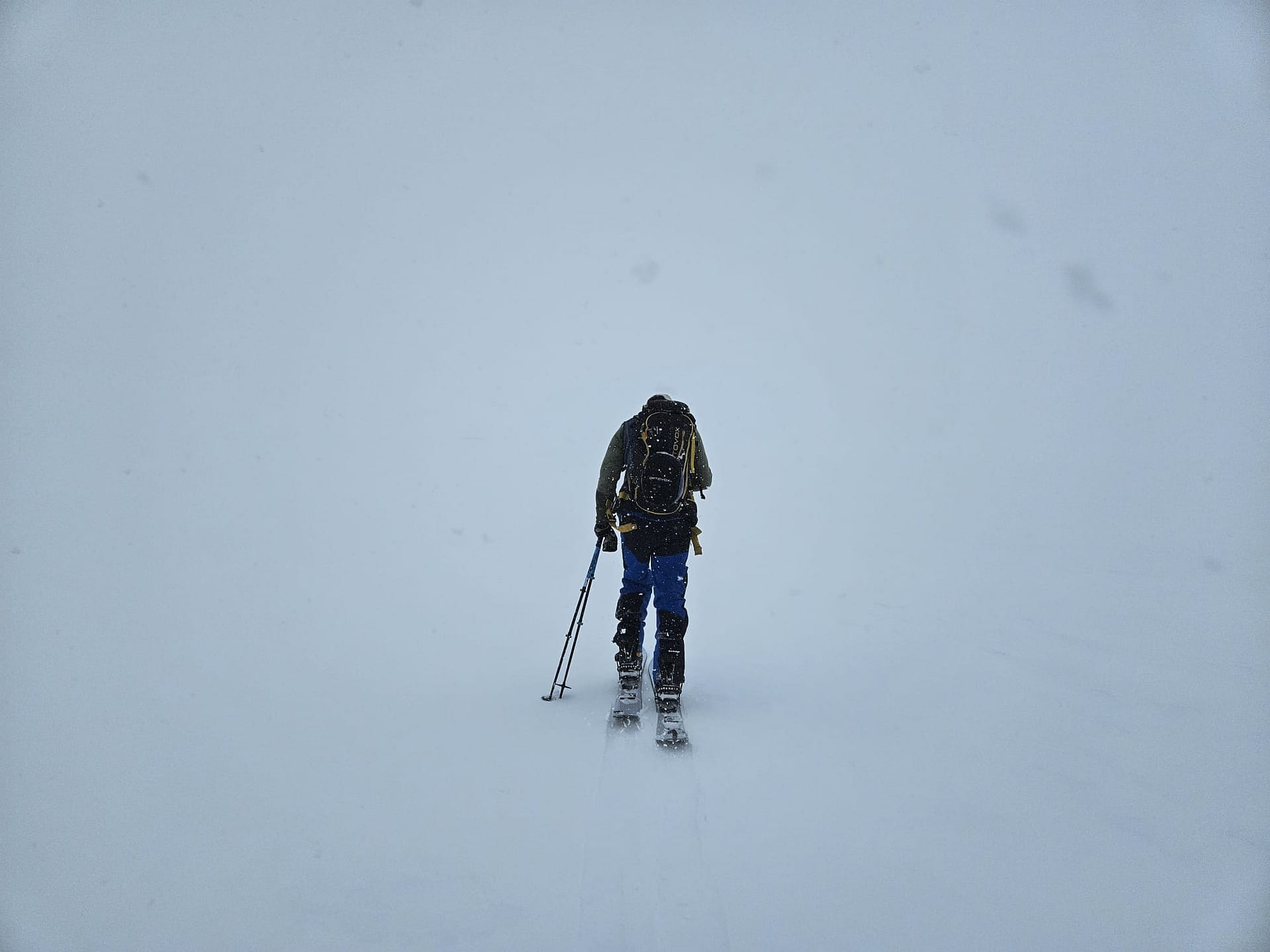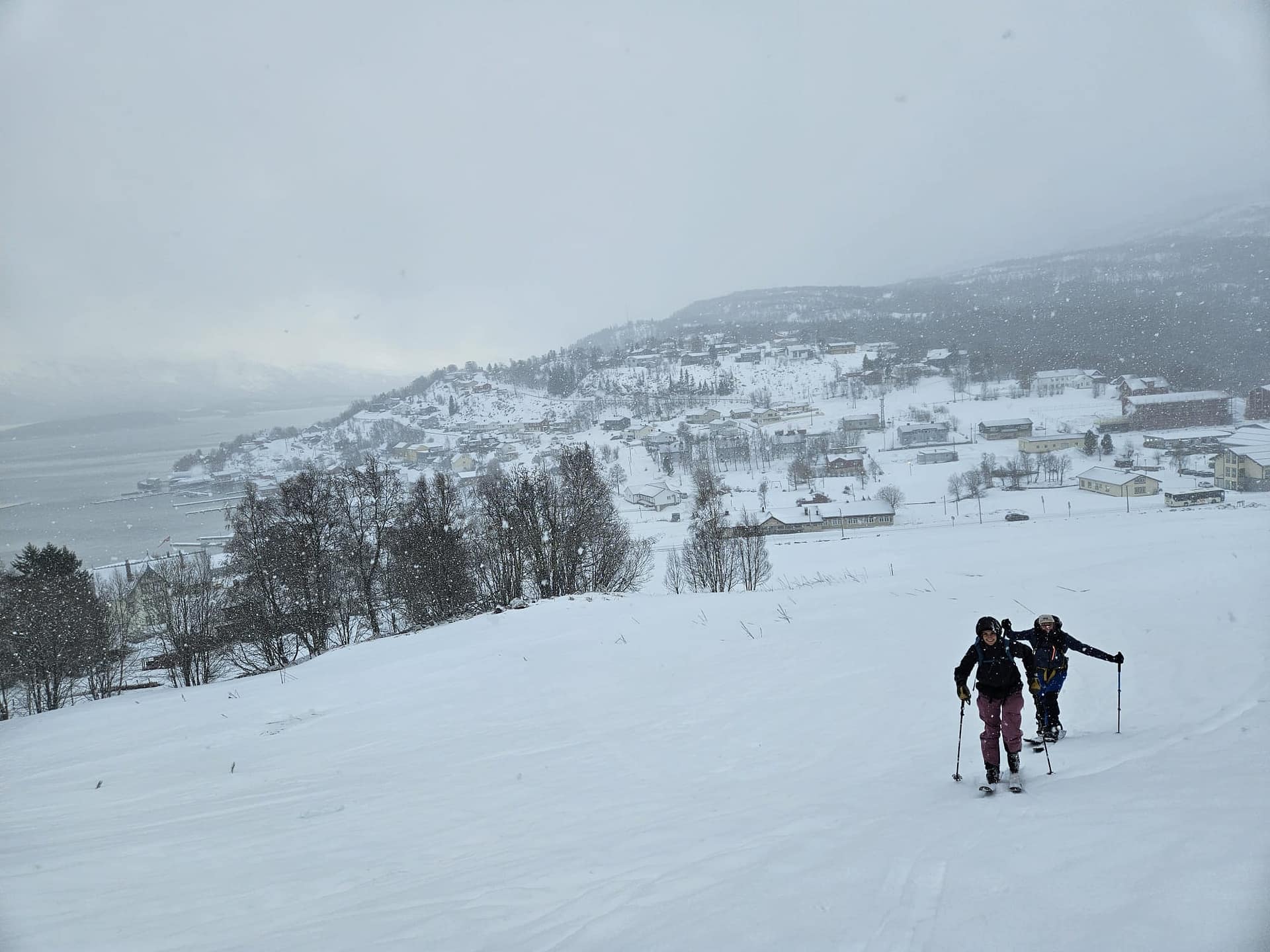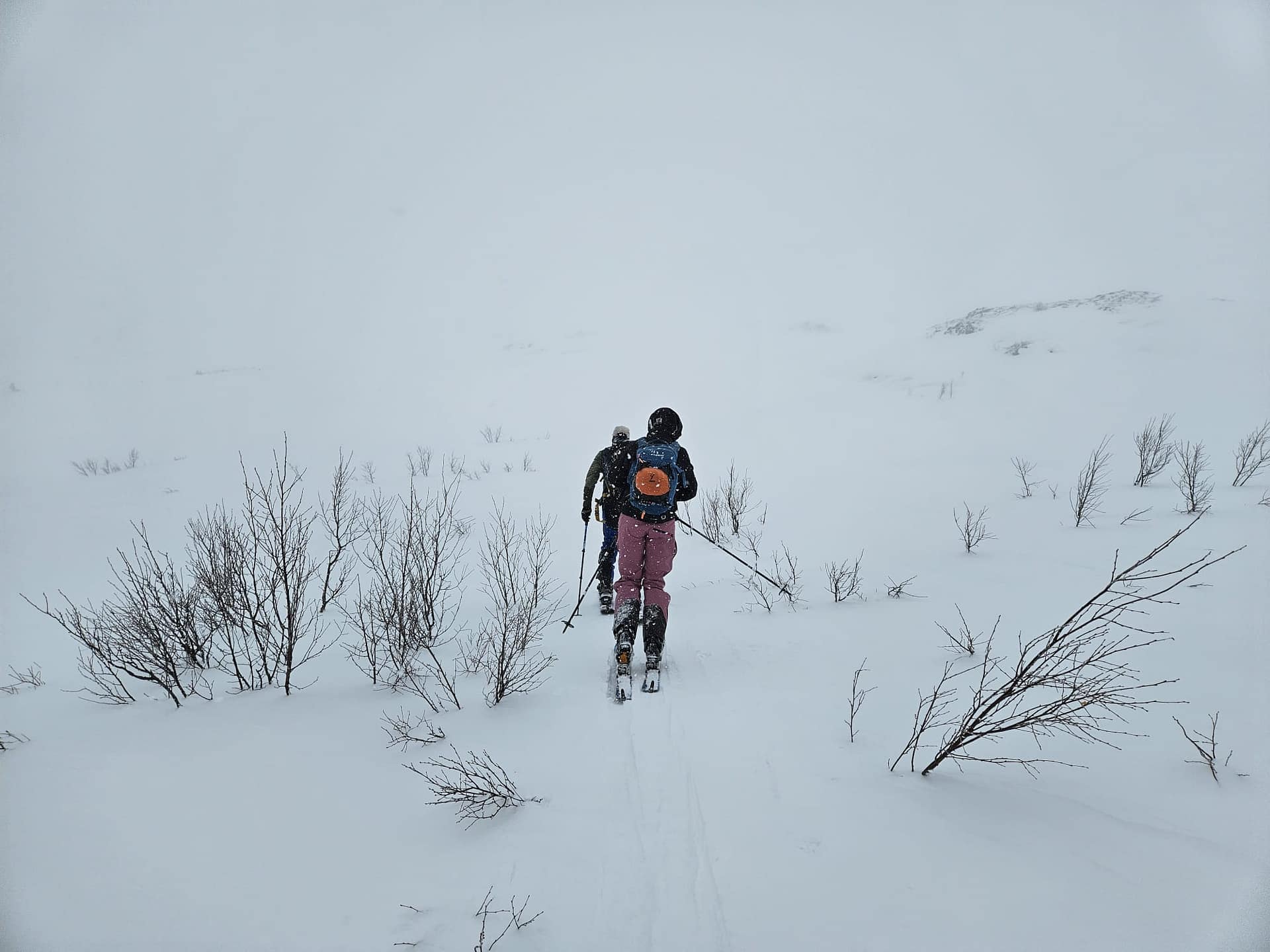 Unser Ziel war es, bis auf etwa 900 Höhenmeter aufzusteigen. Allerdings verschlechterten sich die Sichtverhältnisse zunehmend, der Wind nahm stark zu, und schließlich befanden wir uns praktisch im Whiteout. Daher entschieden wir uns, die Tour etwa 100 Höhenmeter oberhalb des Langvatnet-Sees abzubrechen.