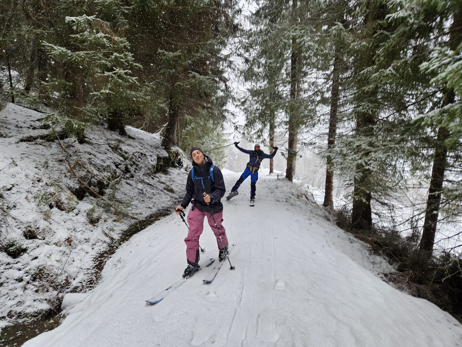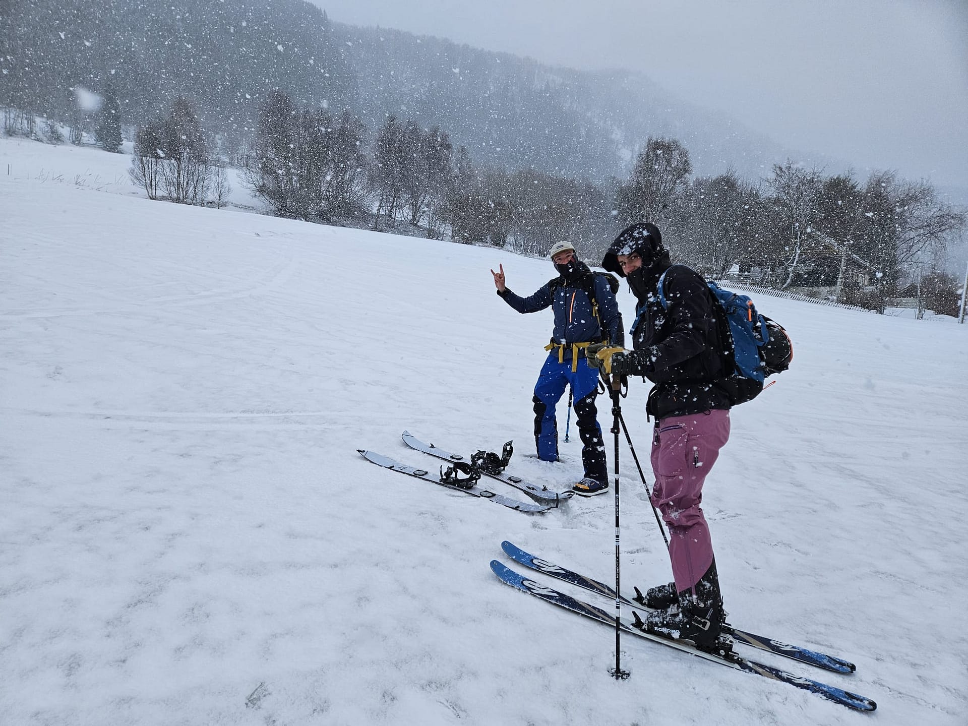 Insgesamt trafen wir auf sehr unterschiedliche Schneebedingungen – von Pulverschnee über Eisplatten bis hin zu stark windgepresstem Schnee. Die Abfahrt im oberen Hang hätte bei besserer Sicht sicher großen Spaß gemacht, denn es handelt sich um ein wirklich schönes Gelände. Aufgrund der schlechten Bedingungen mussten wir uns in den obersten Metern jedoch mithilfe von Handy und GPS vorsichtig nach unten orientieren, sodass wir die Abfahrt dort kaum genießen konnten.
