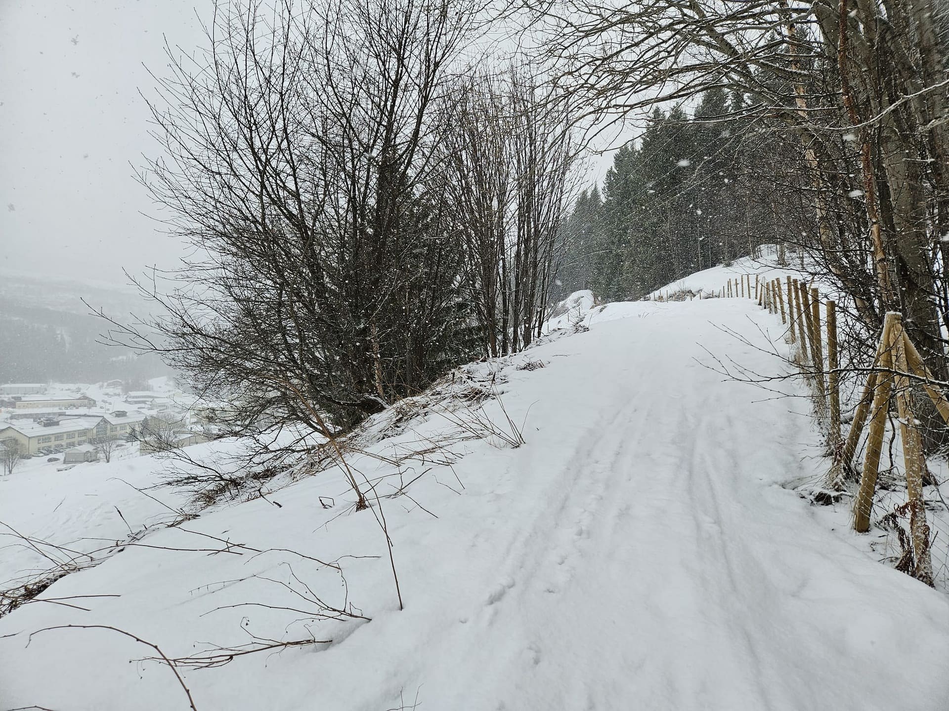 Die ersten etwa 150 Meter legten wir zu Fuß auf der Straße zurück, bis wir einen verschneiten Hang erreichten. Dort schnallten wir die Felle an und stiegen über den Hang die ersten rund 40 Höhenmeter bis zum Wanderweg „Verdens Ende“ auf. An einem Wegweiser folgten wir dem Pfad nach links und hielten uns weiter entlang des Wanderwegs.