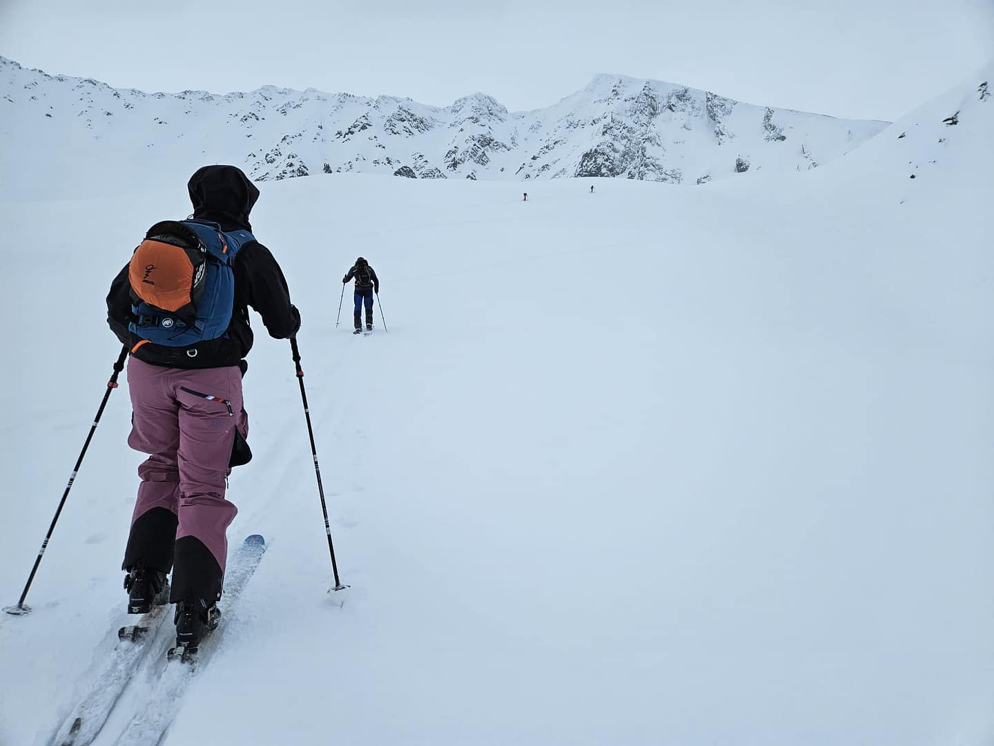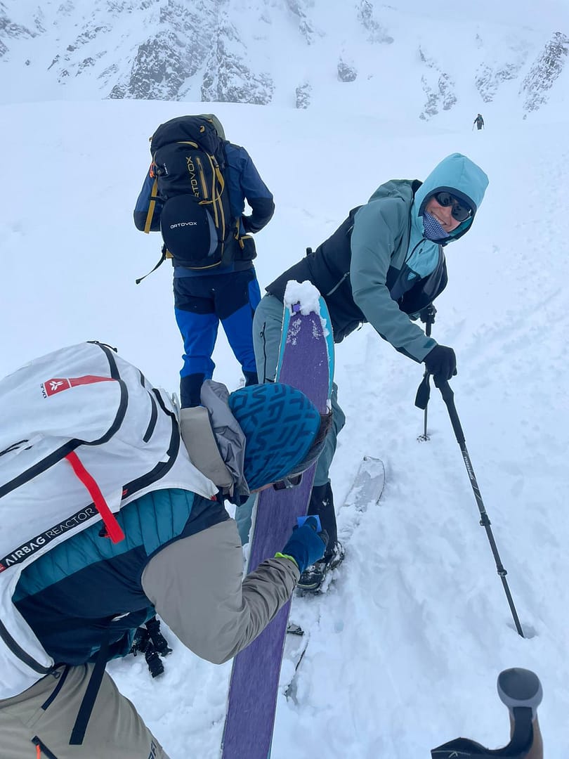 Der darüberliegende Bergrücken zeigte sich stark abgeblasen, während im oberen Bereich starker, stürmischer Wind herrschte. Aufgrund der Verhältnisse – insbesondere Triebschneeansammlungen in der Stufe sowie des starken Windeinflusses – wurde auf einen weiteren Aufstieg verzichtet.