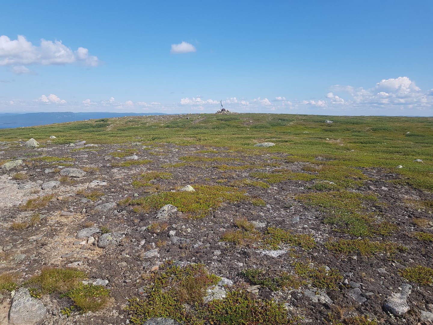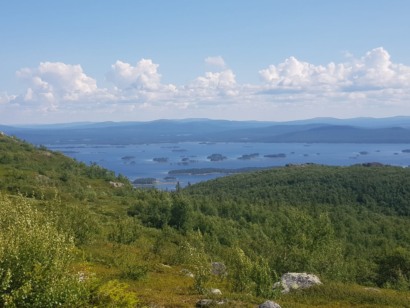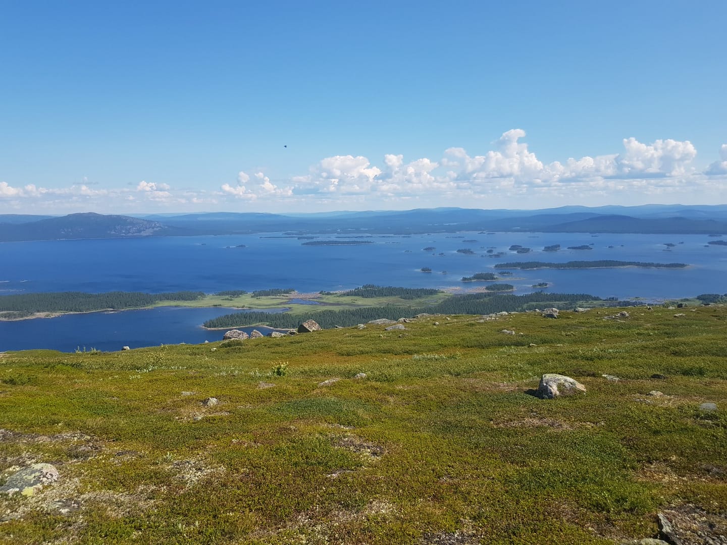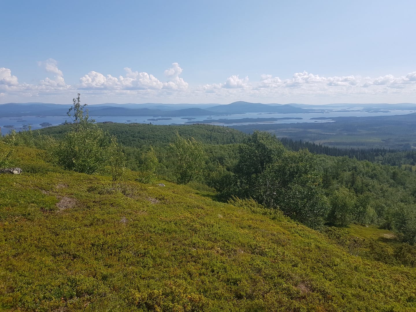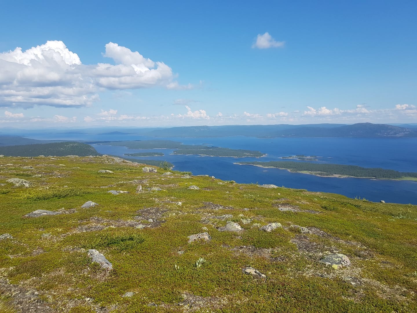 Der höchste Punk des Naturreservat um Arjeplog ist der niedrige Berg Akkelis mit seinen 760 m. Direkt am Parkplatz ausgeschrieben geht es in leichter Steigung einen schmalen, teilweise verwachsenen Pfad in einem großen Rechtsbogen hinauf. Im unteren Teil säumen sich noch die Nadelbäume, während diese im mittleren Teil durch Birken abgelöst werden. Zwischendrin gibt es eine offene Fläche, wo man Richtung Gipfel schauen kann (5. Bild). Der obere Teil ist nur noch mit bodennahen Pflanzen bewachsen und der Wind saust uns um die Ohren. Hier ist die Wegfindung etwas schwieriger, da teilweise kein Pfad sichtbar ist, aber die Markierungen führen uns schlussendlich zum Gipfel rauf. Vom Gipfel aus bietet sich ein weites Panorama auf die mit Seen rund um Arjeplog.