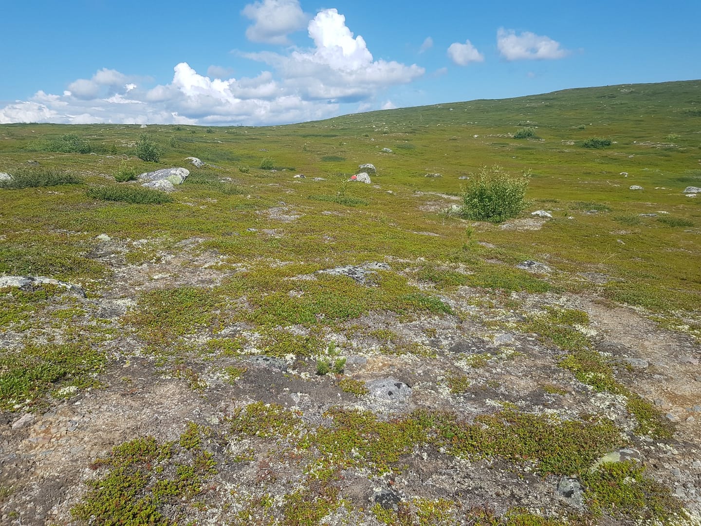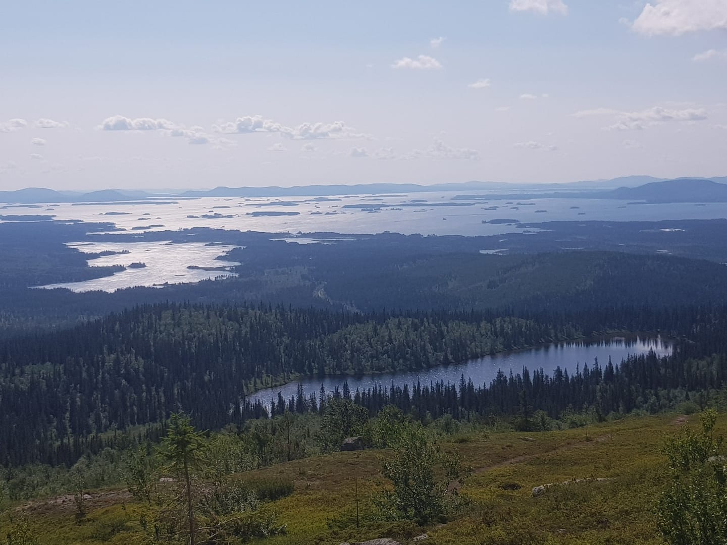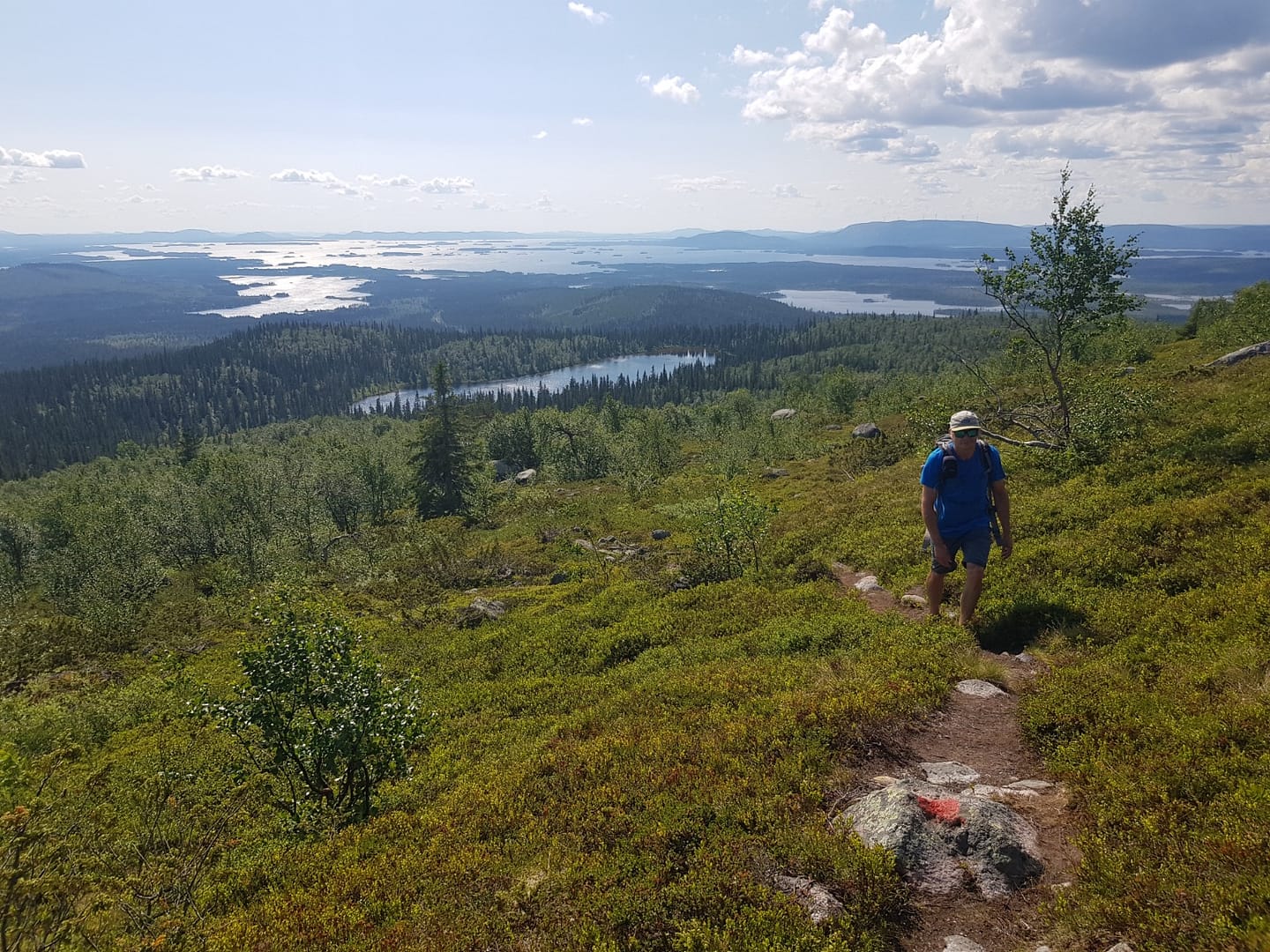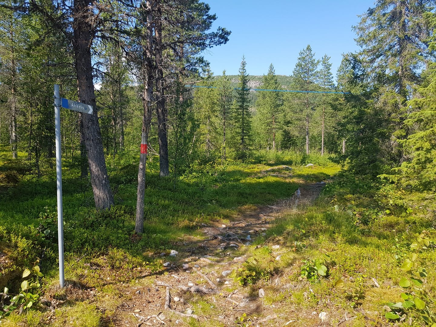 Der höchste Punk des Naturreservat um Arjeplog ist der niedrige Berg Akkelis mit seinen 760 m. Direkt am Parkplatz ausgeschrieben geht es in leichter Steigung einen schmalen, teilweise verwachsenen Pfad in einem großen Rechtsbogen hinauf. Im unteren Teil säumen sich noch die Nadelbäume, während diese im mittleren Teil durch Birken abgelöst werden. Zwischendrin gibt es eine offene Fläche, wo man Richtung Gipfel schauen kann (5. Bild). Der obere Teil ist nur noch mit bodennahen Pflanzen bewachsen und der Wind saust uns um die Ohren. Hier ist die Wegfindung etwas schwieriger, da teilweise kein Pfad sichtbar ist, aber die Markierungen führen uns schlussendlich zum Gipfel rauf. Vom Gipfel aus bietet sich ein weites Panorama auf die mit Seen rund um Arjeplog.