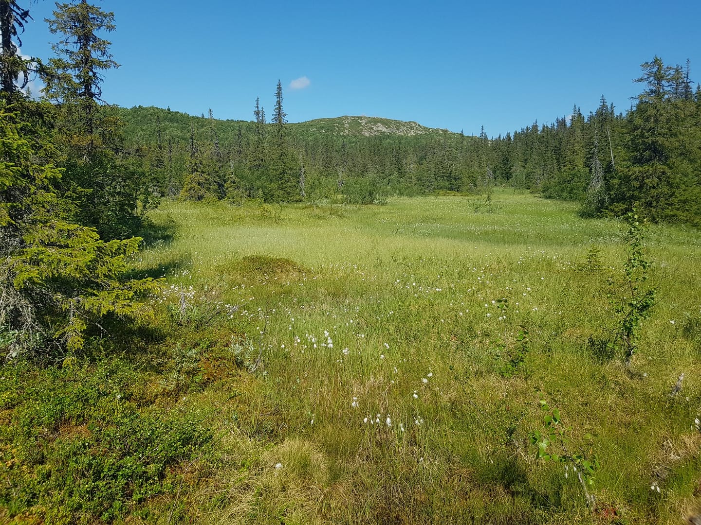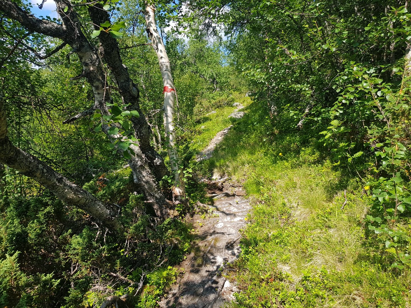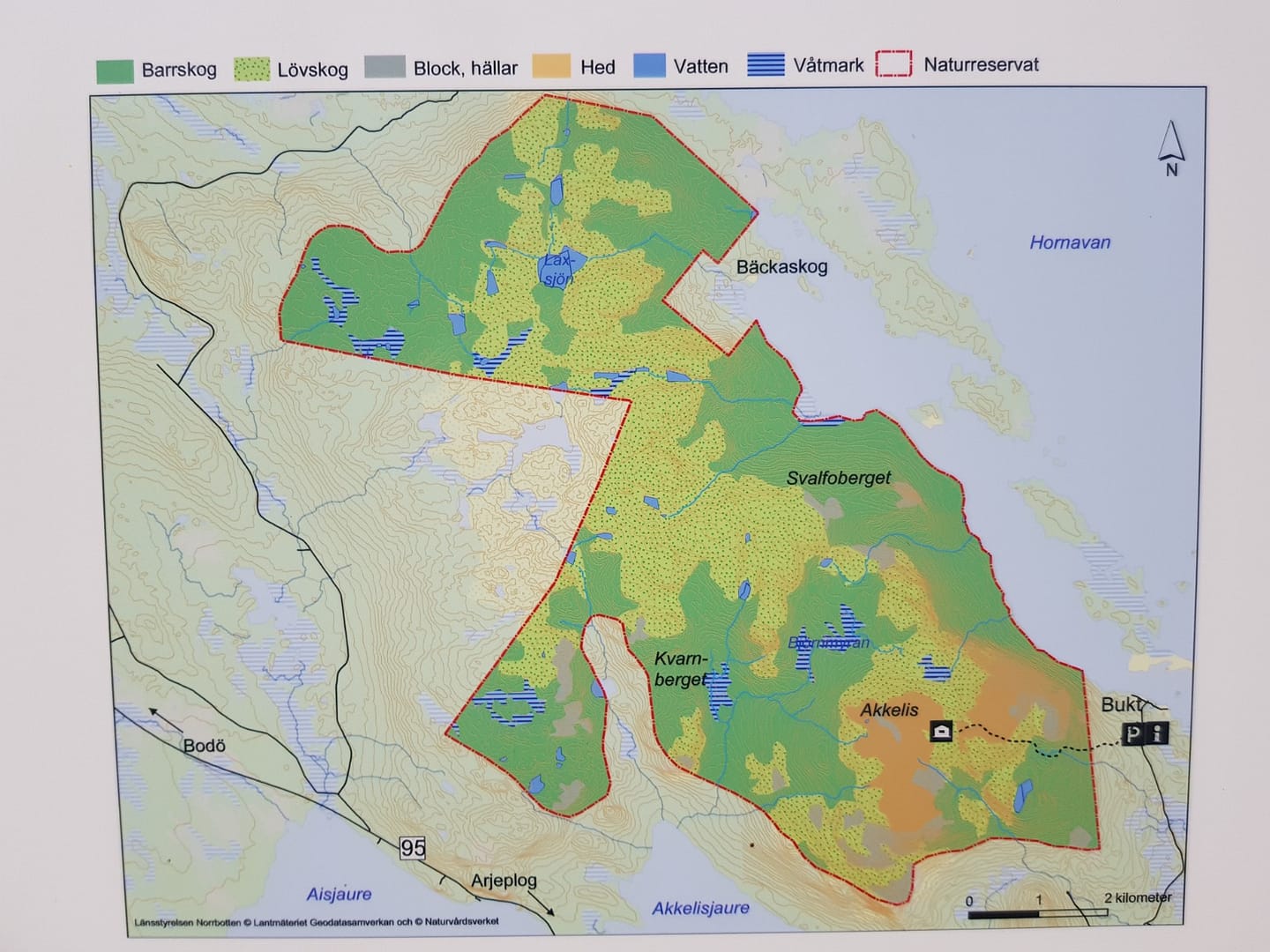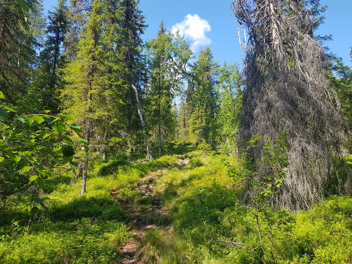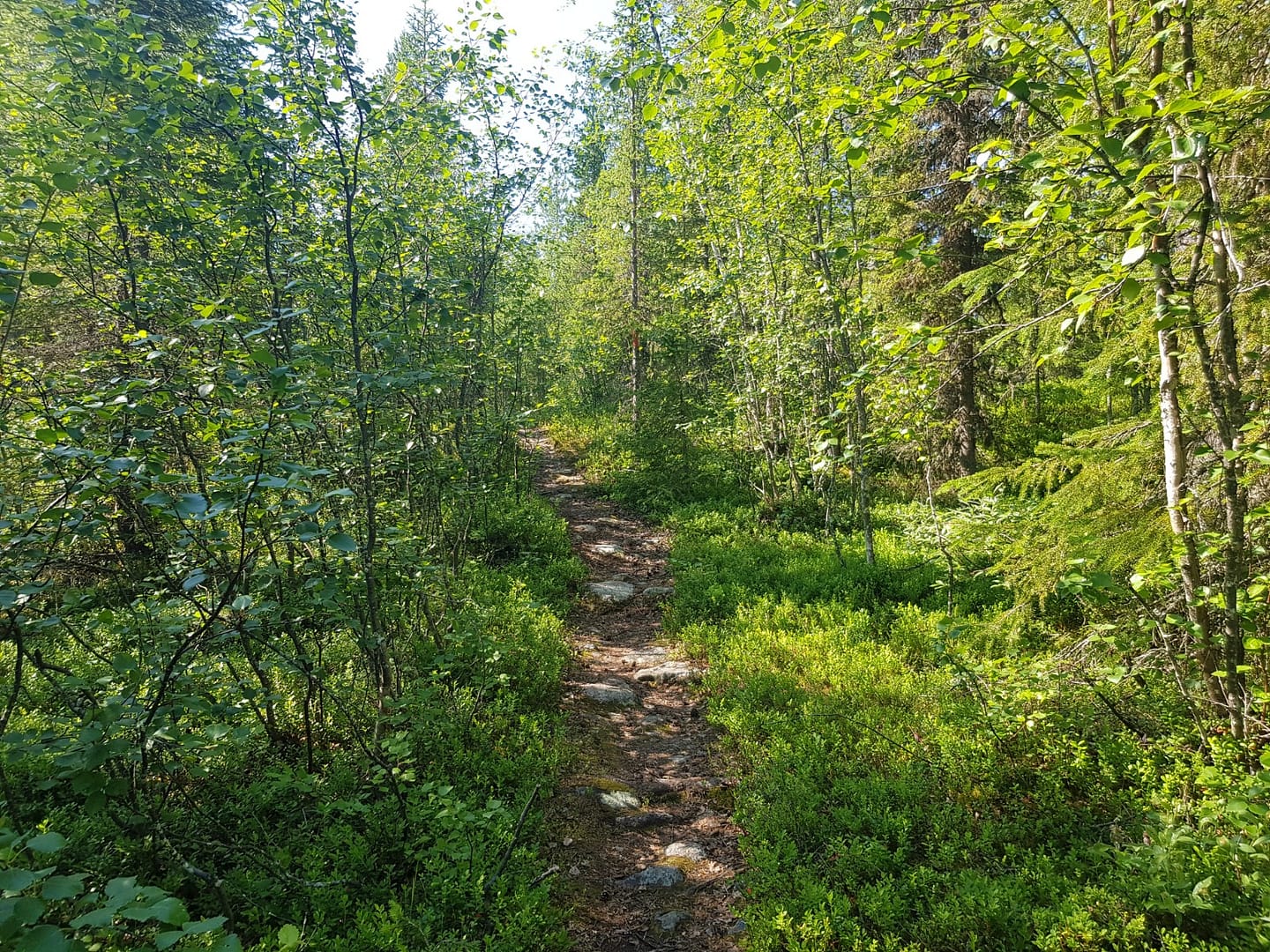 Der höchste Punk des Naturreservat um Arjeplog ist der niedrige Berg Akkelis mit seinen 760 m. Direkt am Parkplatz ausgeschrieben geht es in leichter Steigung einen schmalen, teilweise verwachsenen Pfad in einem großen Rechtsbogen hinauf. Im unteren Teil säumen sich noch die Nadelbäume, während diese im mittleren Teil durch Birken abgelöst werden. Zwischendrin gibt es eine offene Fläche, wo man Richtung Gipfel schauen kann (5. Bild). Der obere Teil ist nur noch mit bodennahen Pflanzen bewachsen und der Wind saust uns um die Ohren. Hier ist die Wegfindung etwas schwieriger, da teilweise kein Pfad sichtbar ist, aber die Markierungen führen uns schlussendlich zum Gipfel rauf. Vom Gipfel aus bietet sich ein weites Panorama auf die mit Seen rund um Arjeplog.