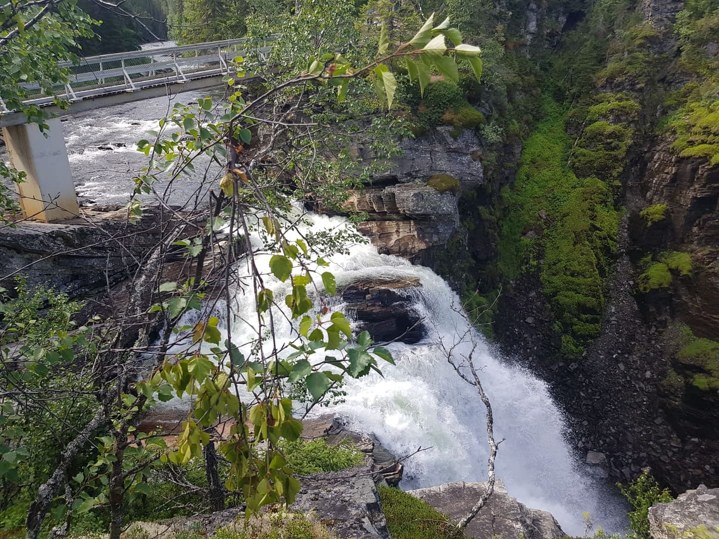 Der Hällingsåfallet ist ein beeindruckender Wasserfall, welchen man auf unterschiedlicher Art begegnen kann. Entweder startet man ganz unten am Parkplatz und „erkämpft“ sich die Sicht auf den Wasserfall, oder man startet auf halben Wege, wo man auch wunderbar auf den Waldweg einsteigen kann. Für die letzte Variante fährt man bequem bis ganz oben so wie wir, denn zu unserem Bedauern hatten wir eine dicke Regenwolke und Gewitter im Nacken. Von hier braucht man nur noch 5 Minuten um das Spektakel zu erleben.