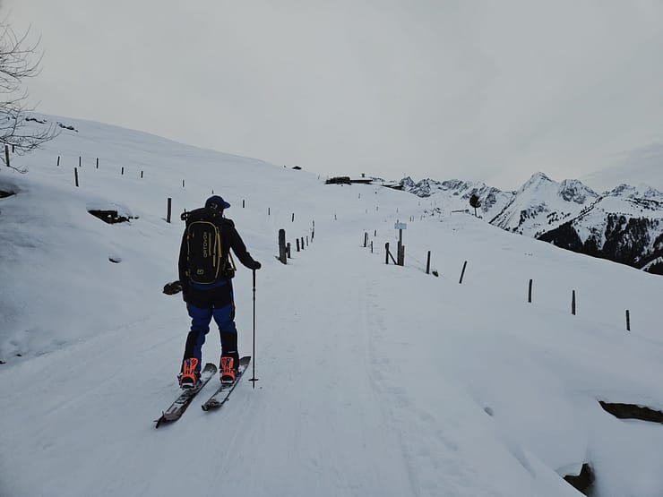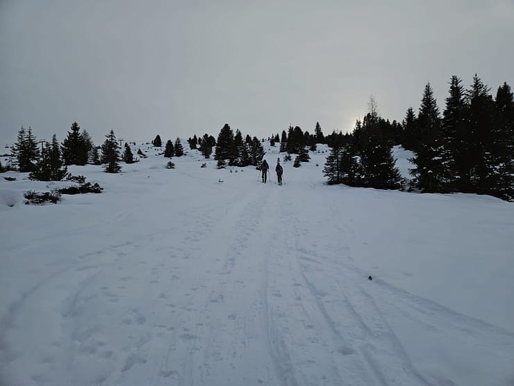 Vom Parkplatz aus halten wir uns rechts der Piste und steigen entlang der Skitourenroute in angenehmer Steigung über den Wiesenhang in Richtung Wald auf. Der schmale Waldgürtel ist rasch durchquert, danach geht es über eine weitläufige freie Fläche weiter bergauf. Die Wegfindung gestaltet sich im unteren Bereich aufgrund der geringen Schneelage und vereinzelter Eisplatten etwas anspruchsvoller, ist jedoch insgesamt problemlos machbar.