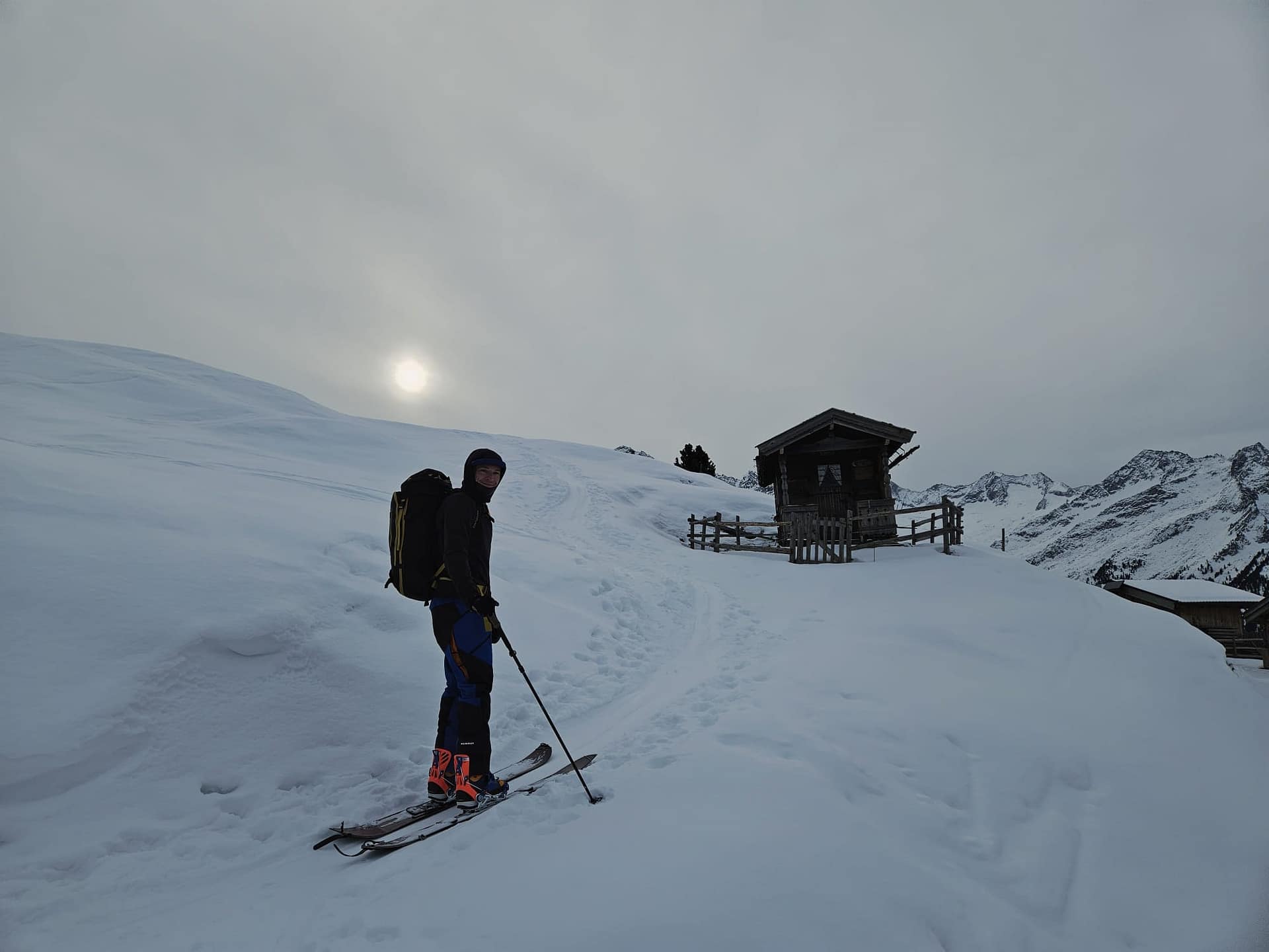 Auf etwa 1.840 m erreichen wir die Gletscherblickalm. Hier verlassen wir die Skitourenroute und steigen querfeldein in süd-südöstlicher Richtung weiter zur Bergstation des Plattenkogel X-Press 2 auf. Das Gelände weist einige tückische Passagen auf, weshalb die Routenwahl mit Bedacht erfolgen sollte, um Mulden möglichst zu umgehen. Oben angekommen werden wir mit einem tollen Ausblick belohnt, außerdem hat man die Möglichkeit zum Gipfel ‚Plattenkogel‘ zu gehen.