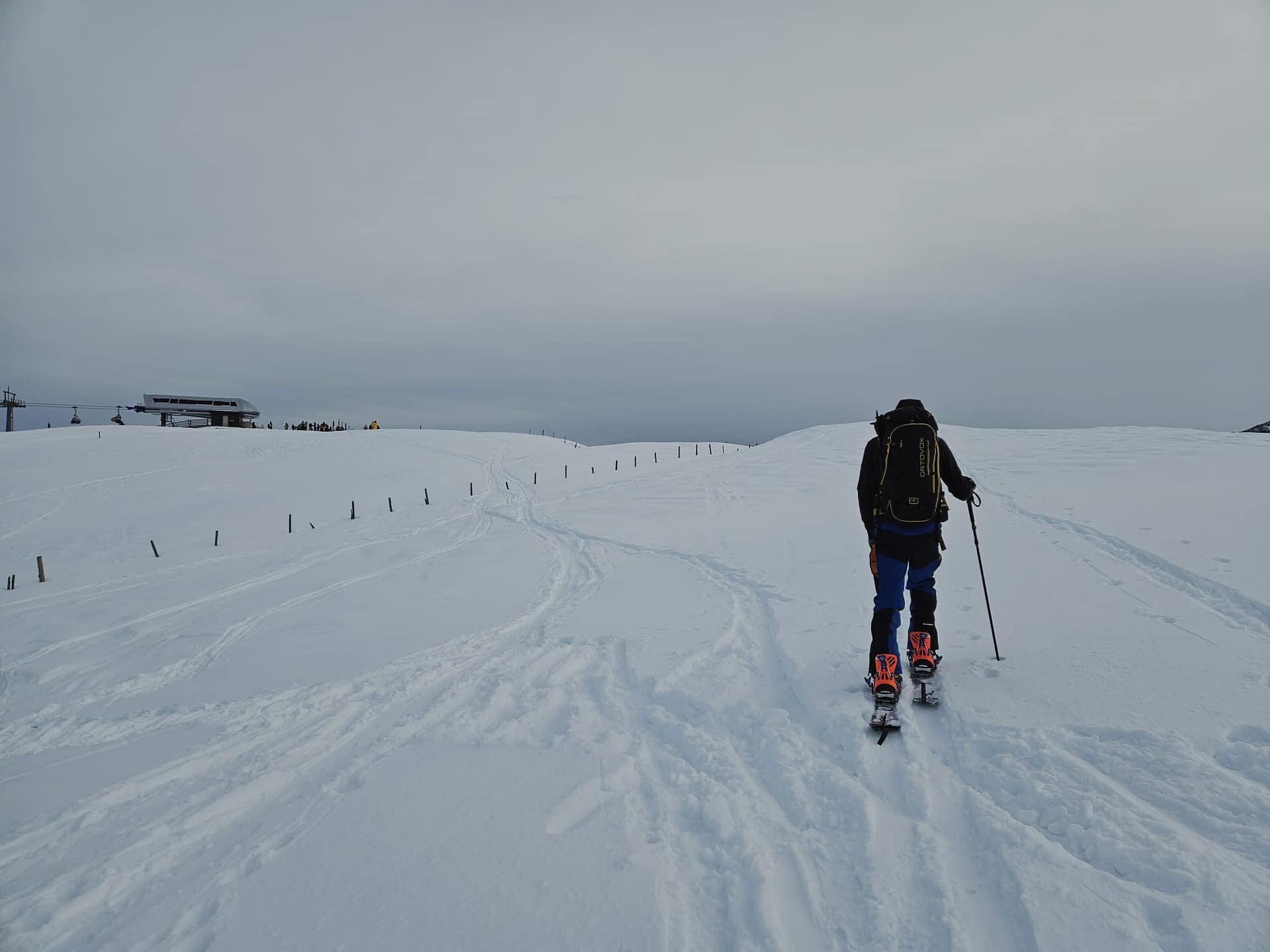 Vom Parkplatz aus halten wir uns rechts der Piste und steigen entlang der Skitourenroute in angenehmer Steigung über den Wiesenhang in Richtung Wald auf. Der schmale Waldgürtel ist rasch durchquert, danach geht es über eine weitläufige freie Fläche weiter bergauf. Die Wegfindung gestaltet sich im unteren Bereich aufgrund der geringen Schneelage und vereinzelter Eisplatten etwas anspruchsvoller, ist jedoch insgesamt problemlos machbar.