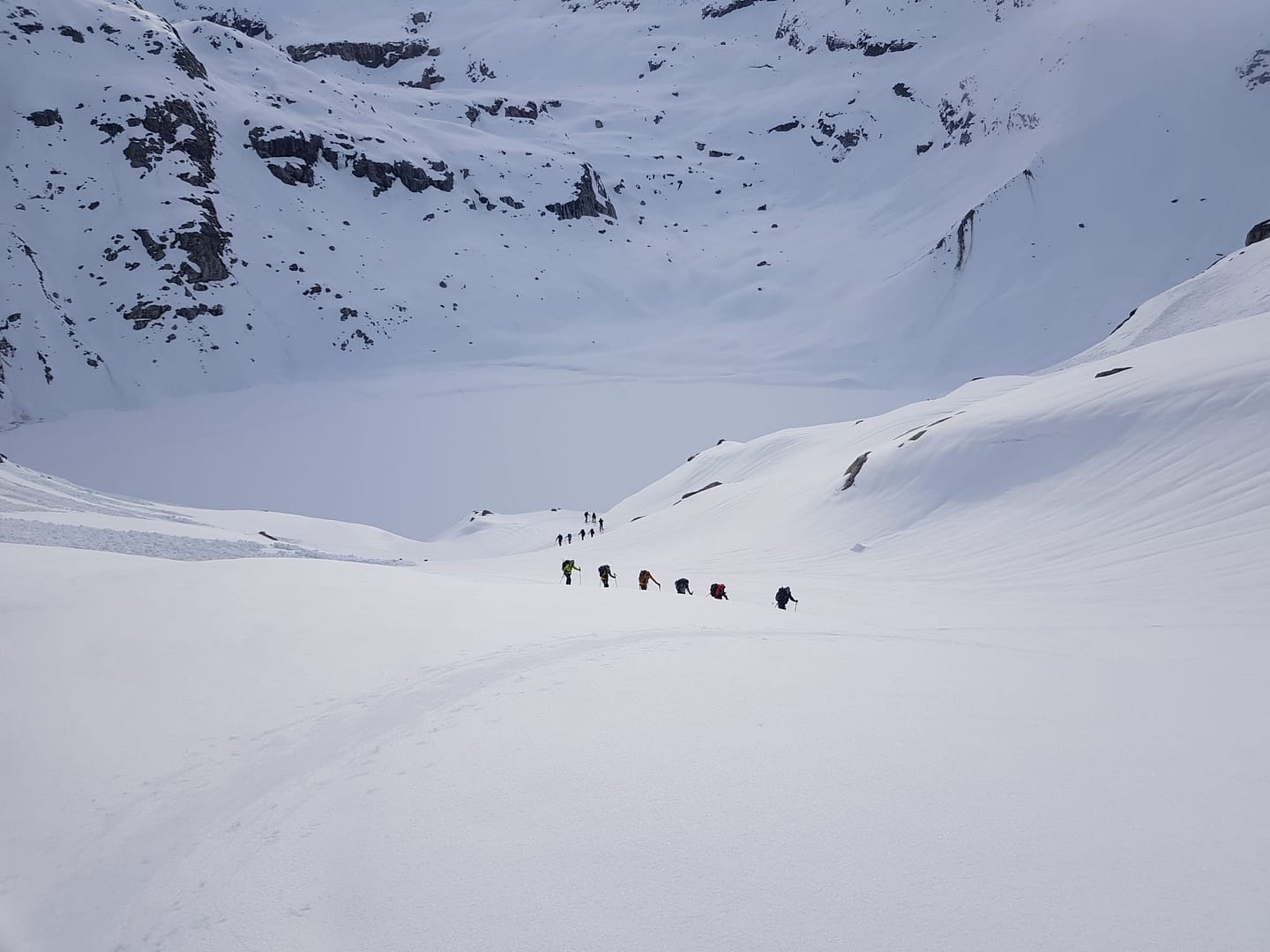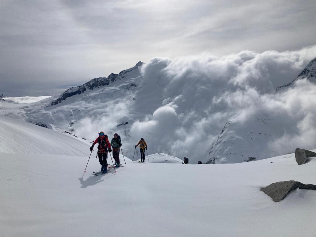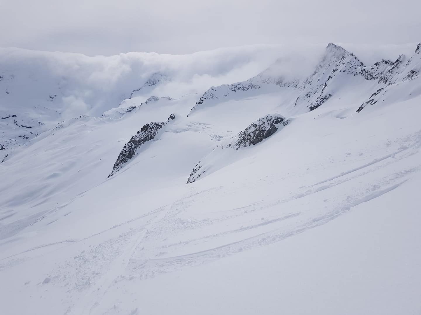Verschiedene Gruppen, verschiedene Wege. Während einige sich zu Fuß auf den Weg machten, haben wir an der Hütte angefellt und sind Richtung Osten die wenigen Höhenmeter (ca. 75) auf einer Länge von 500 Meter losmarschiert. Dann konnten wir in einem großen Bogen bis zum Gletschersee abfahren (Aufstiegsspur von vor drei Tagen). Wenn man genug Schwung hat, kommt man oberhalb vom See gut rum und kann am Gletscherarm, der vom Großen Geiger herunterkommt, aufsteigen. So unser ursprünglicher Plan.