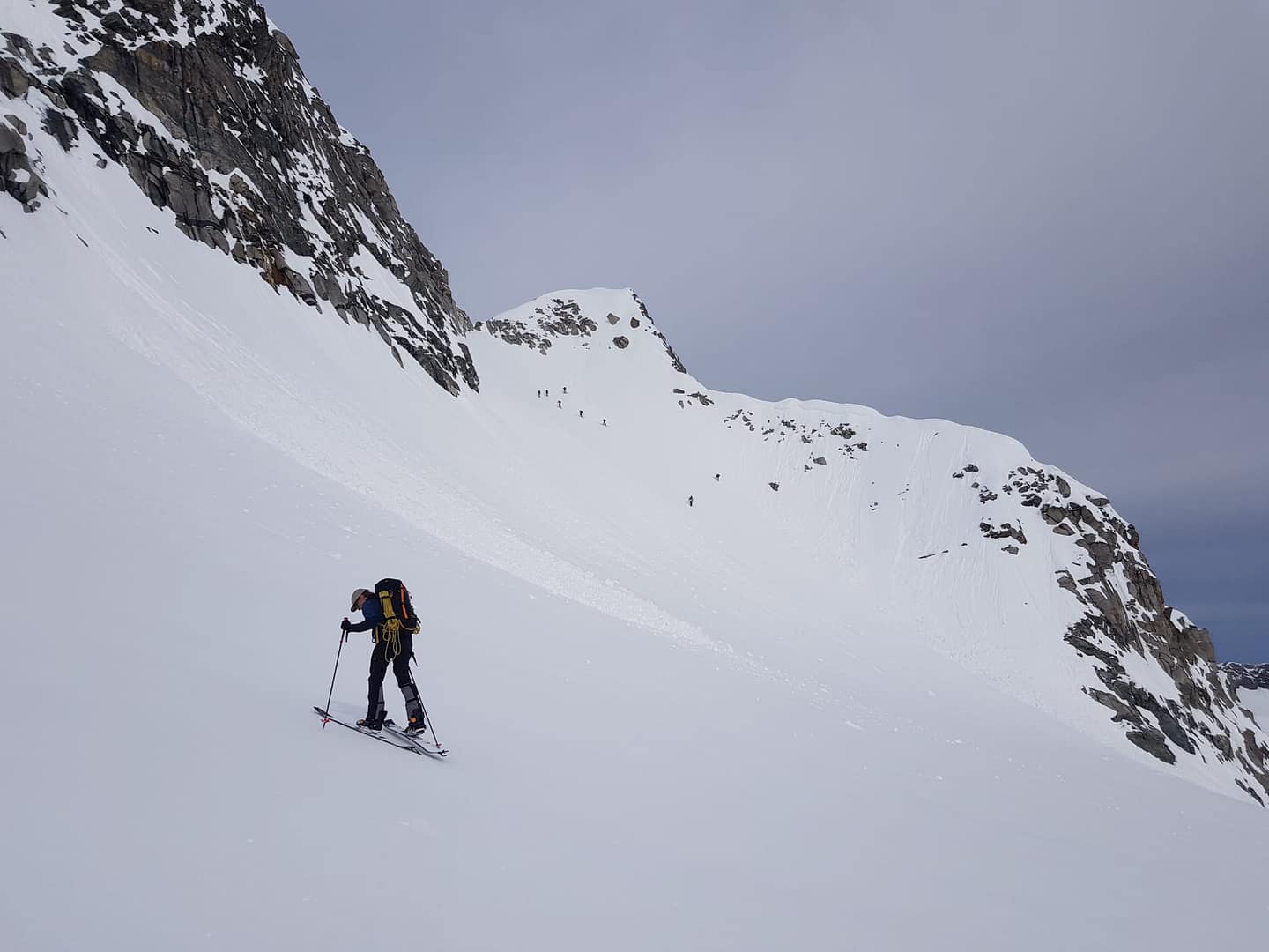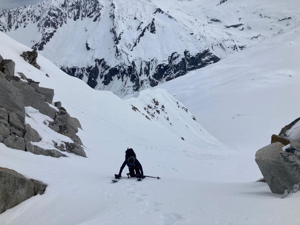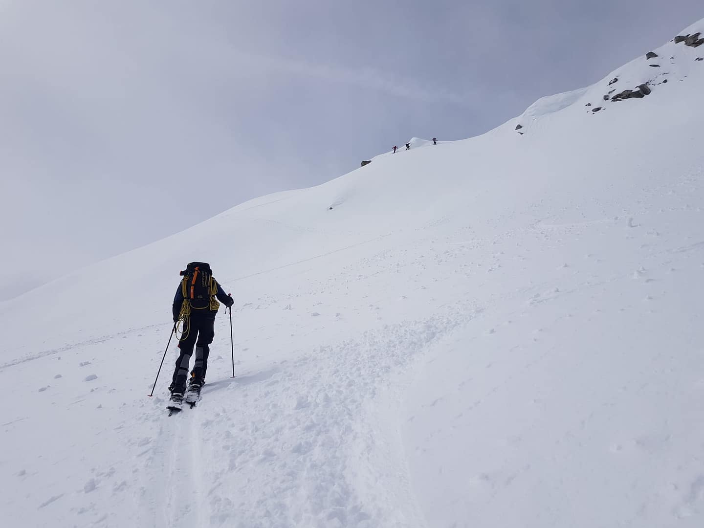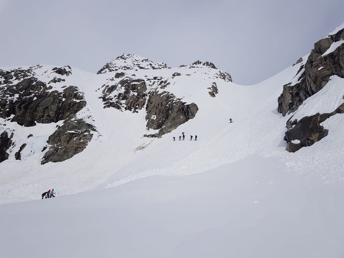 Auf einer Höhenlinie queren wir das Sonntagskees unter den Firnhängen der Sonntagsköpfe bis zur nächsten steilen Rinne unterhalb der Schliefertürme. Die letzten Meter bis auf den Sattel hat die Gruppe mit Bergführer zu Fuß zurück gelegt, von unserem Standpunkt sah es gar nicht so steil aus, aber wir wurden eines besseren belehrt. Nach zwei weiteren Serpentinen auf Ski haben wir auch „aufgegeben“ und sind die letzten Meter zu Fuß hoch. Ich hatte Angst das ganze Geraffel zu verlieren und bin mehr „hochgekrochen“ also alles andere hahaha.