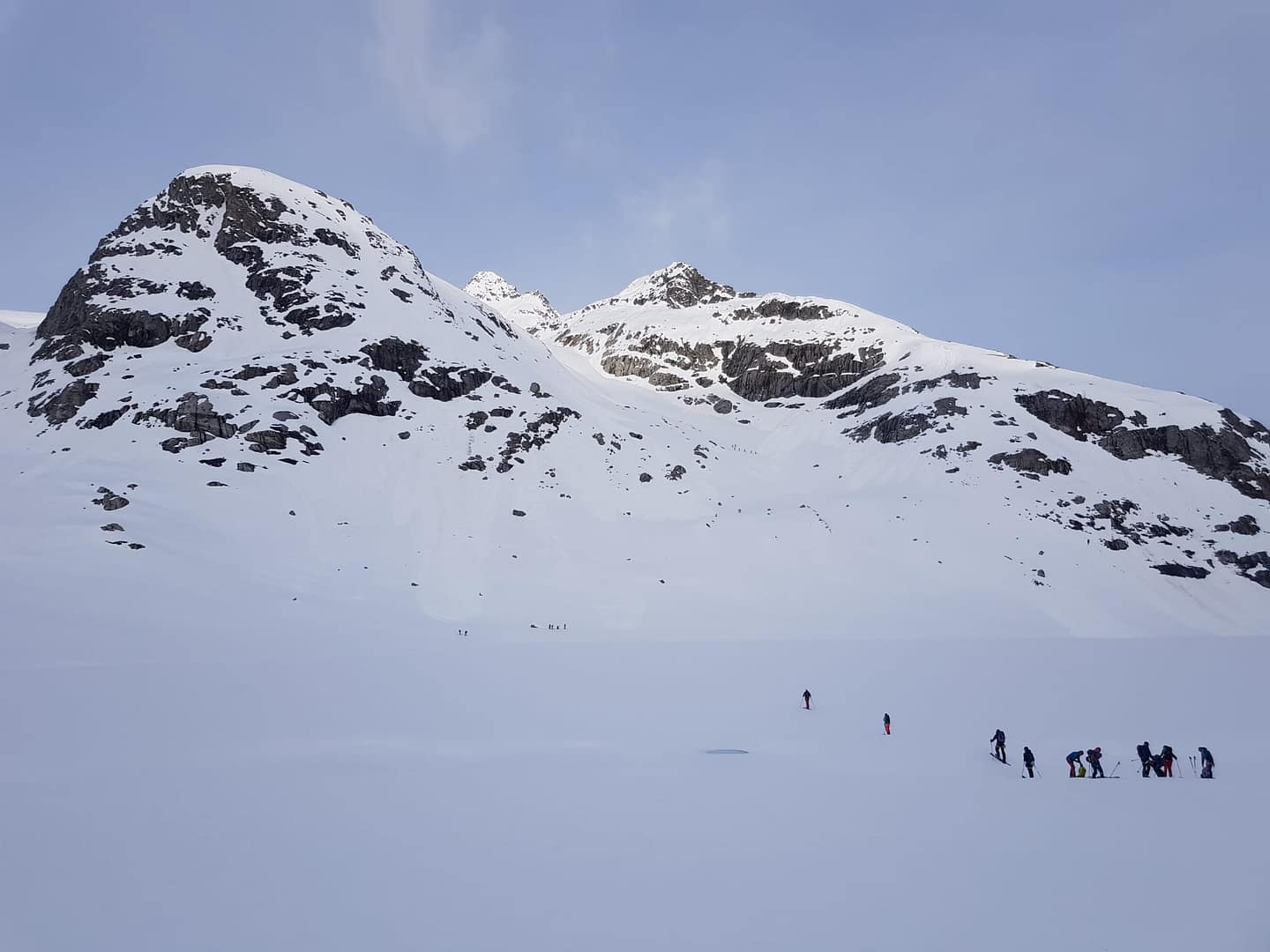 - Skitourenausrüstung: LVS, Sonde, Schaufel, Stöcke, Felle, evtl. Harscheisen