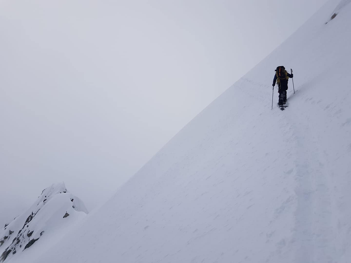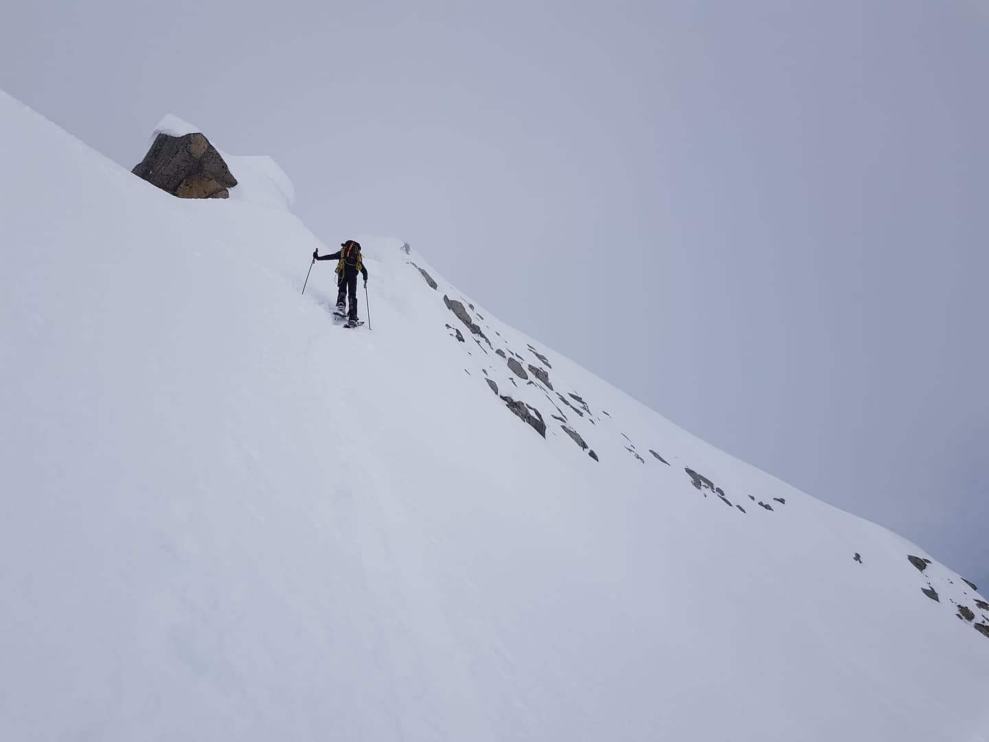 In geringer Steigung geht es weiter Richtung Schlieferspitze. Auf der Höhe des Gipfels wenden wir uns nach Westen und gehen in einigen Kehren rauf. Das letzte Stück bis auf den Grat war sehr steil und dann hat mich dieser stark überwechtete Grat abgeschreckt, so dass wir an dieser Stelle abgebrochen haben. nur drei weitere Personen haben es versucht, aber die Bedingungen sahen schon sehr gruslig aus, leider haben sie es auch nicht bis zum Gipfel selbst geschafft.