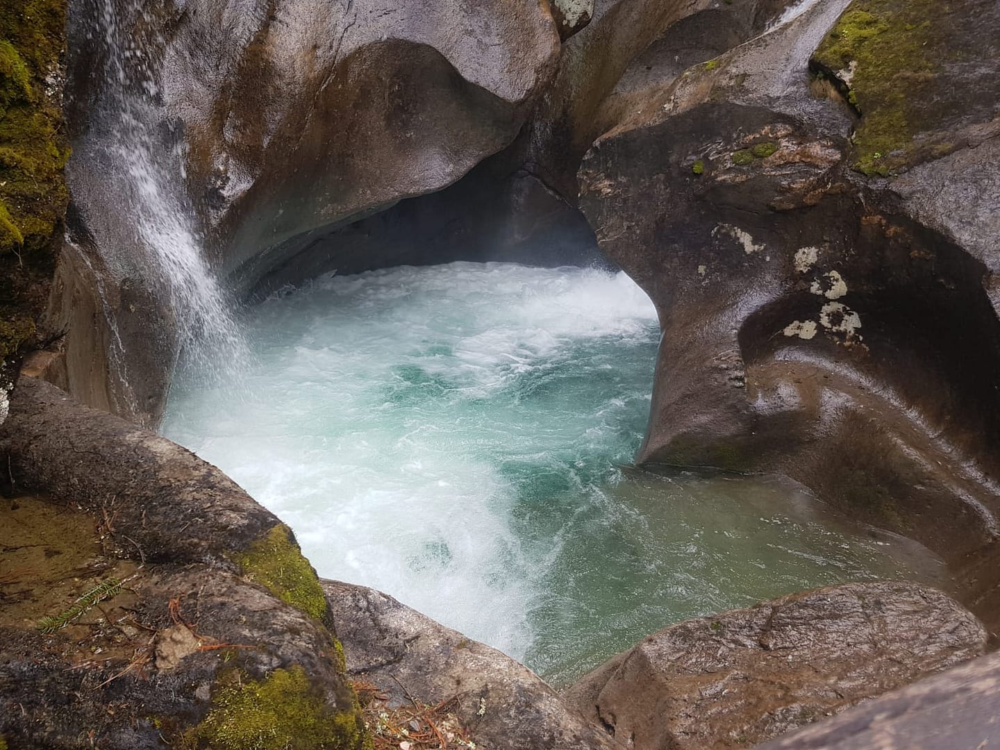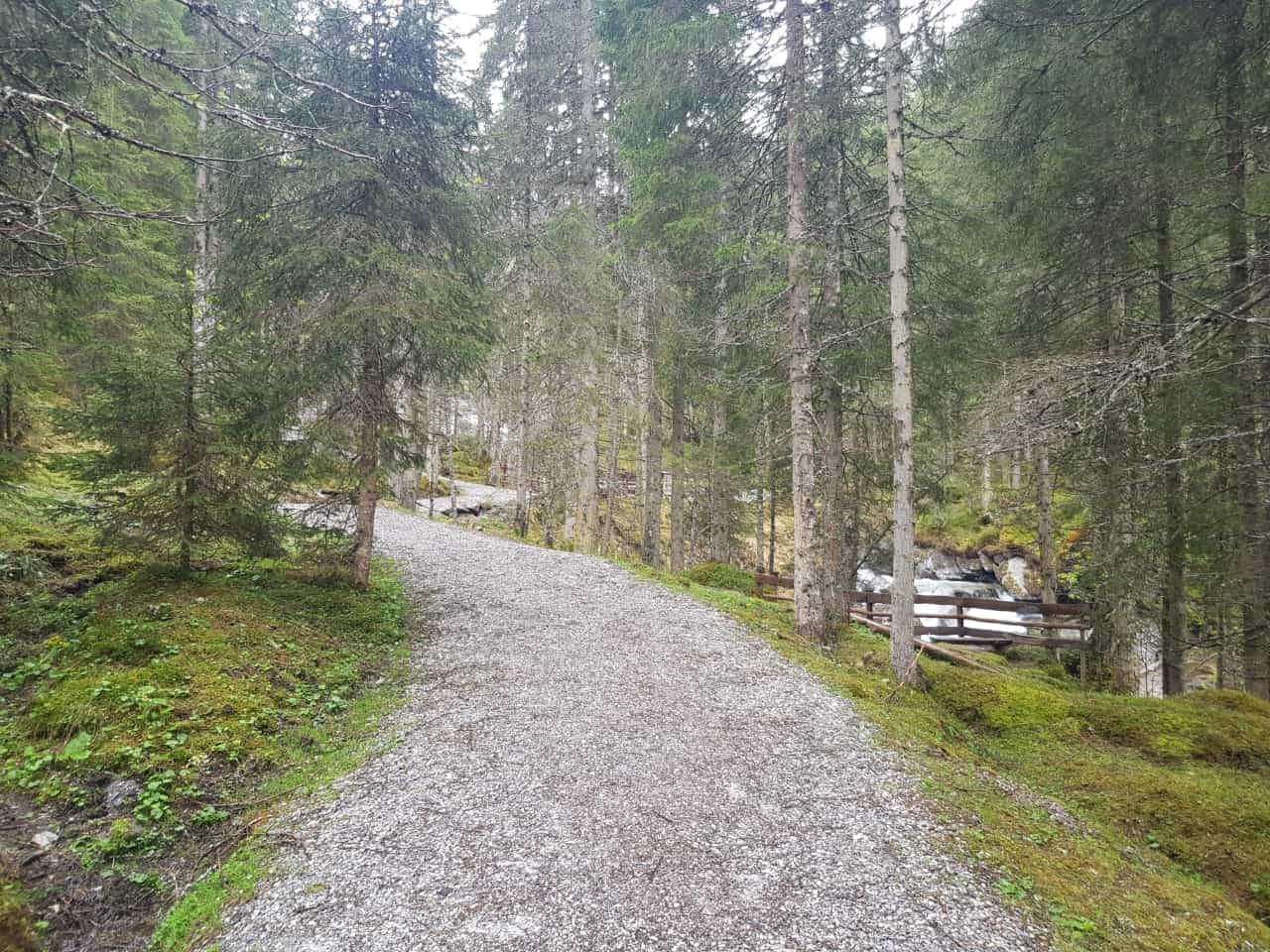 Vom Alpengasthof Finkau geht es über eine Forstraße bis zum Fluss Gerlos, wo wir rechts auf den Weg zur Leitenkammerklamm abbiegen. Der Pfad schlängelt sich parallel zur Forststraße, die im Winter als Rodelbahn dient, durch den moosbewachsenen Wald und bietet dabei einen herrlichen Blick auf die Klamm.