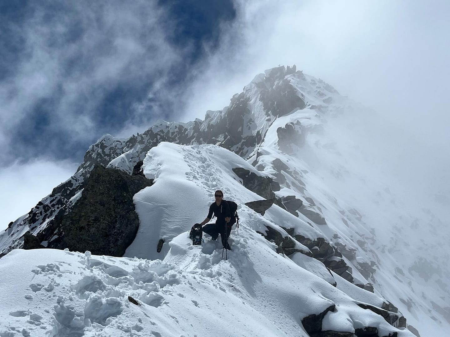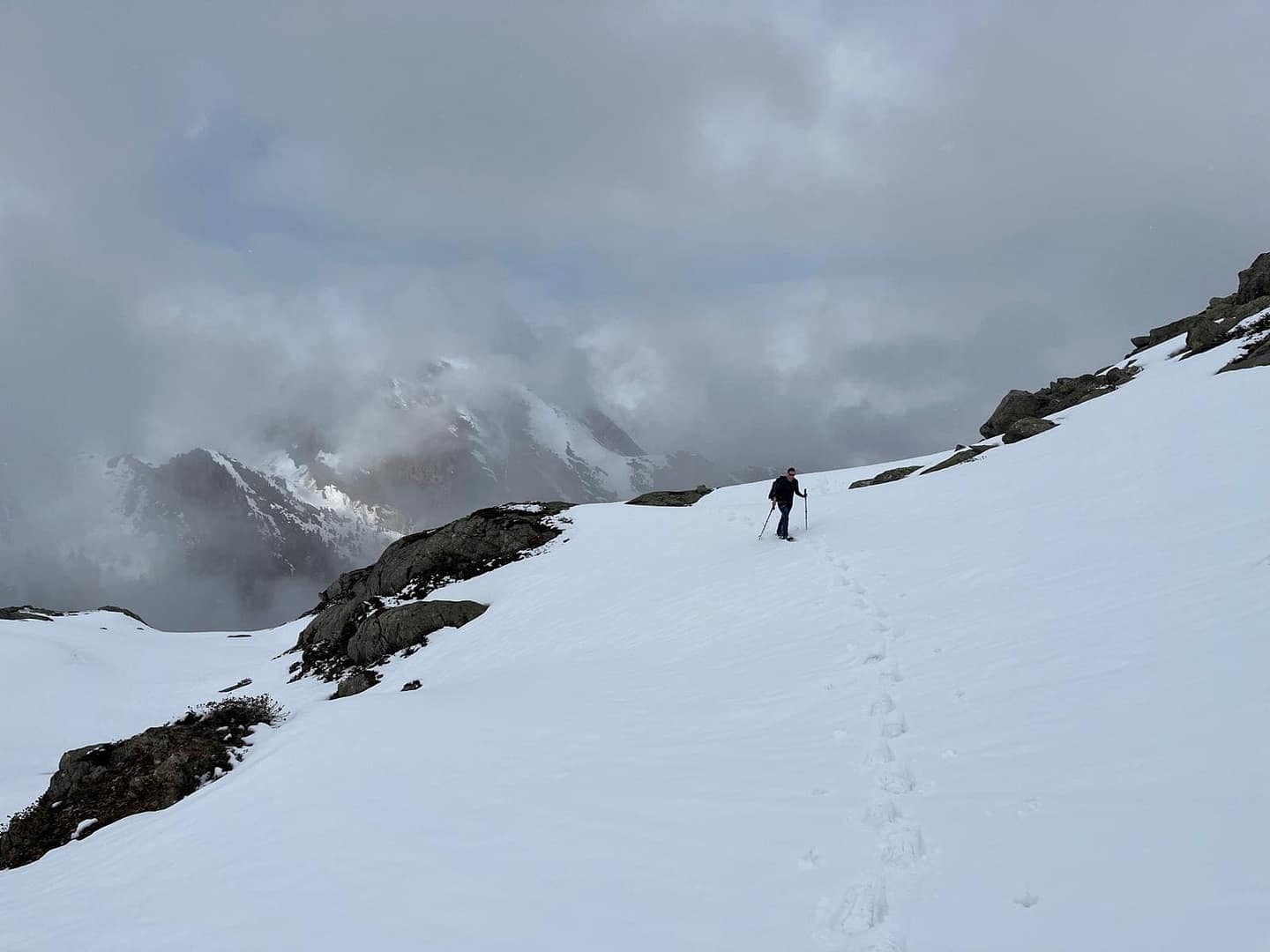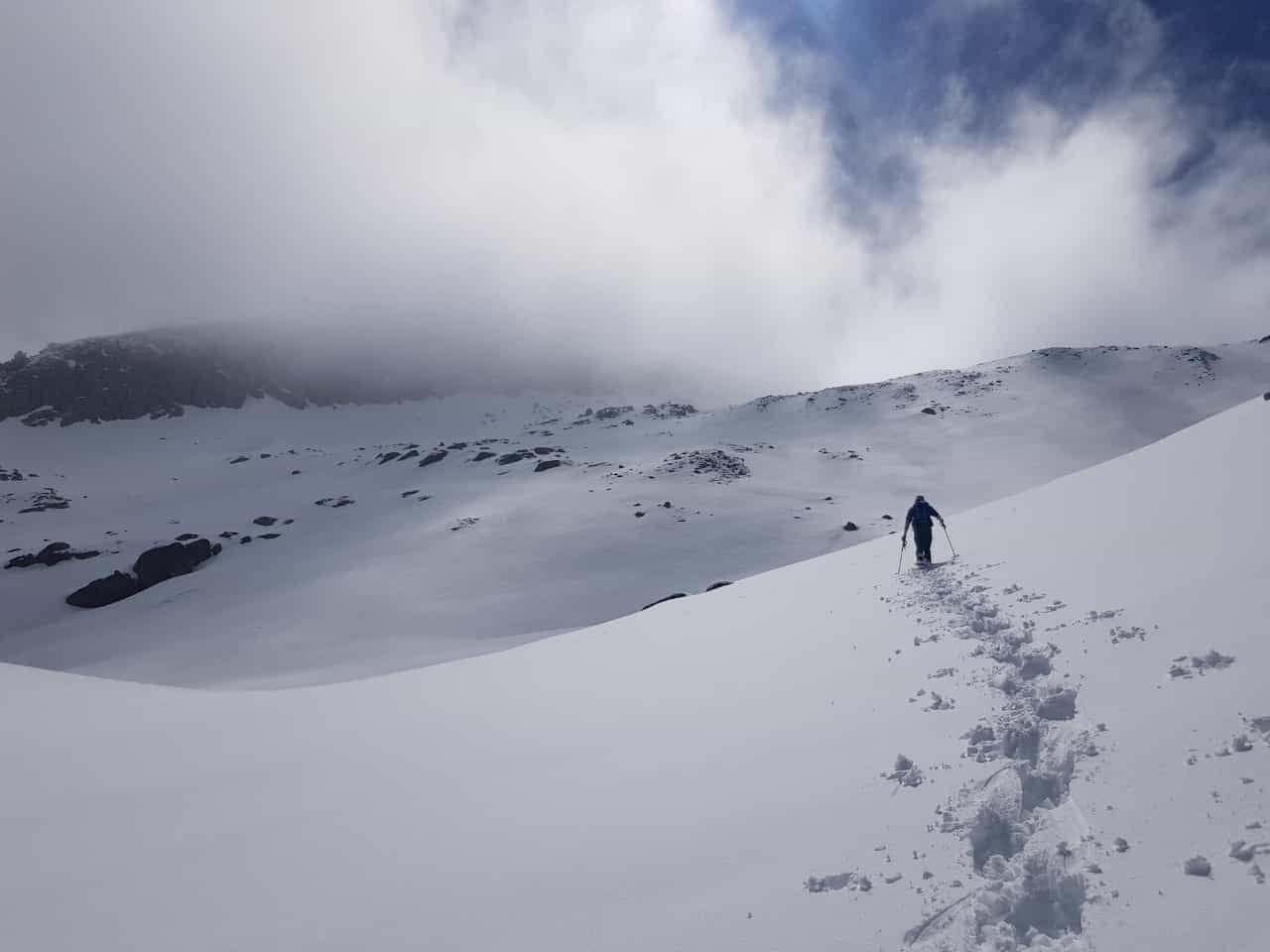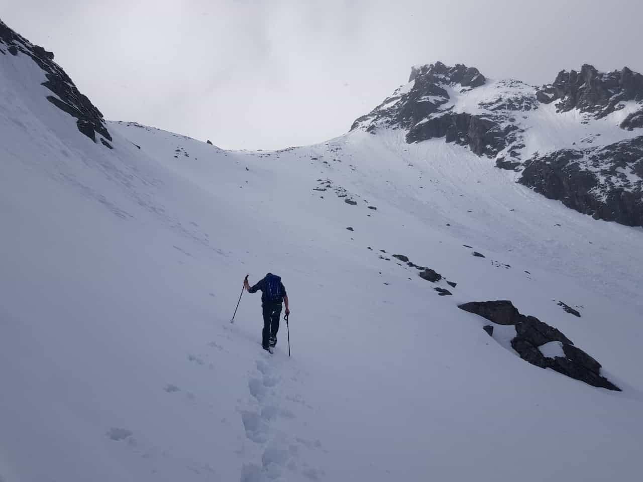 - Je nach Bedingungen: Schneeschuhe, LVS, Sonde, Schaufel, Stöcke,