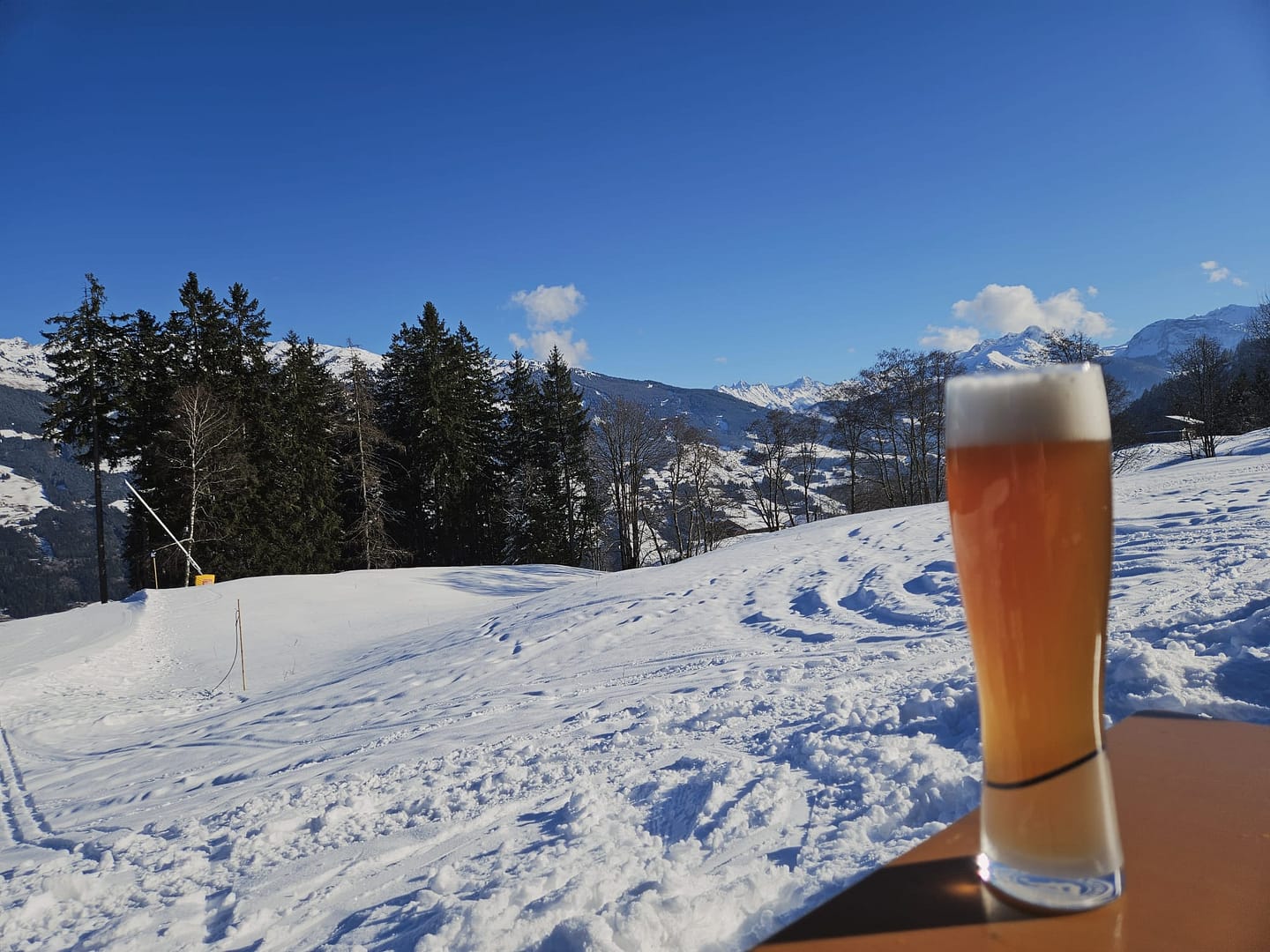 Am Ende erreicht man die Abfahrtshütte, von der aus man einen großartigen Blick ins Tal genießt. Je nach Jahreszeit laden ein paar sonnige Minuten auf der Terrasse zum Verweilen ein, ansonsten ist auch das Innere der urigen Hütte sehr gemütlich. Die Hütte ist wirklich absolut empfehlenswert! 😊