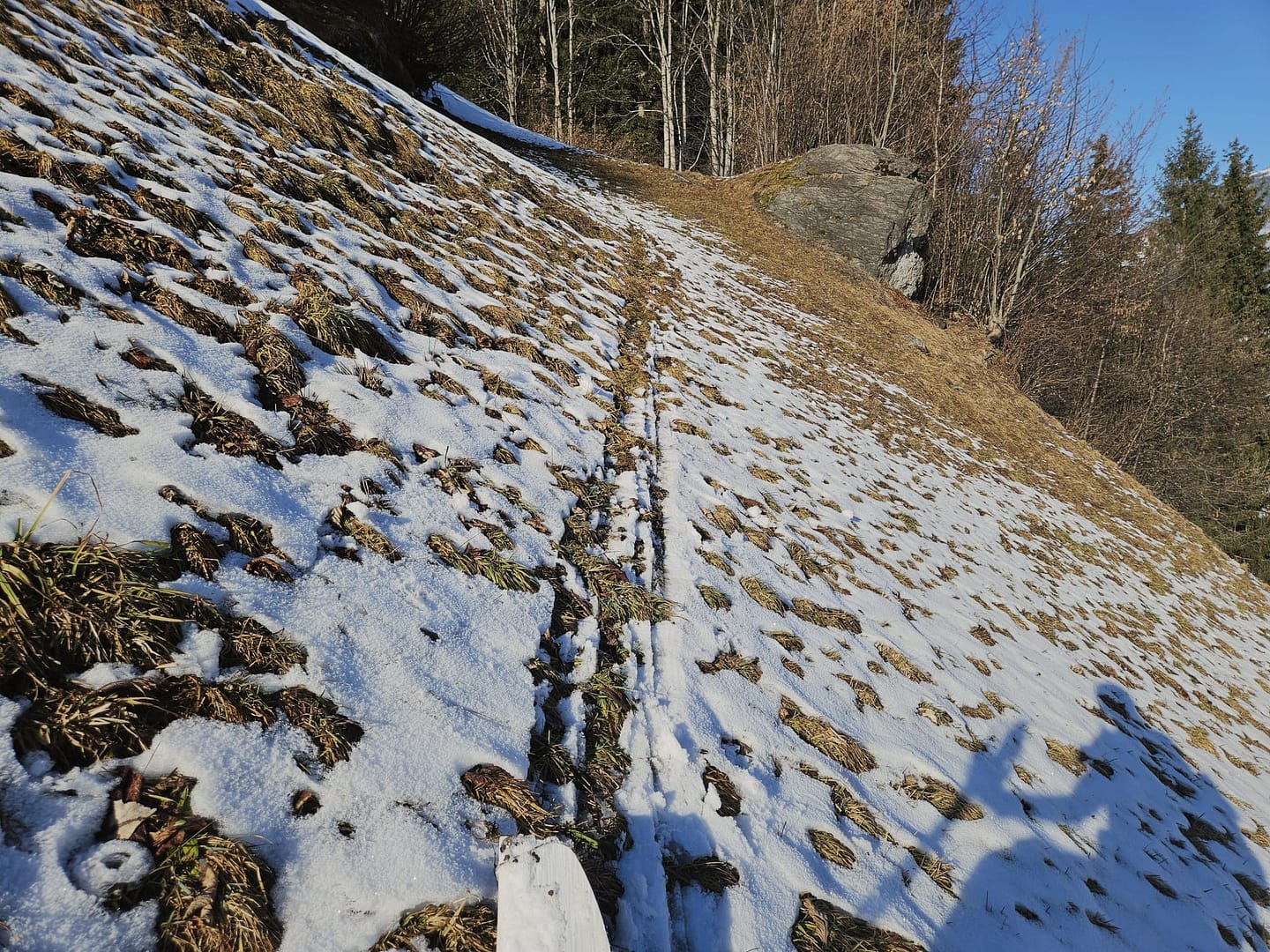 Bei ausreichender Schneelage kann man das erste Stück auf der rechten Seite durch den Wald gehen. Liegt jedoch zu wenig Schnee, bleibt nur der Aufstieg über die Piste selbst. Diese ist an einigen Stellen recht steil und aufgrund von Kunstschnee sowie der Exposition oft eisig – daher sind Harscheisen hier sehr zu empfehlen.