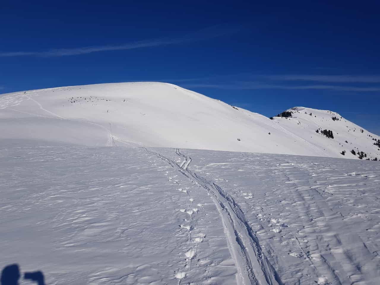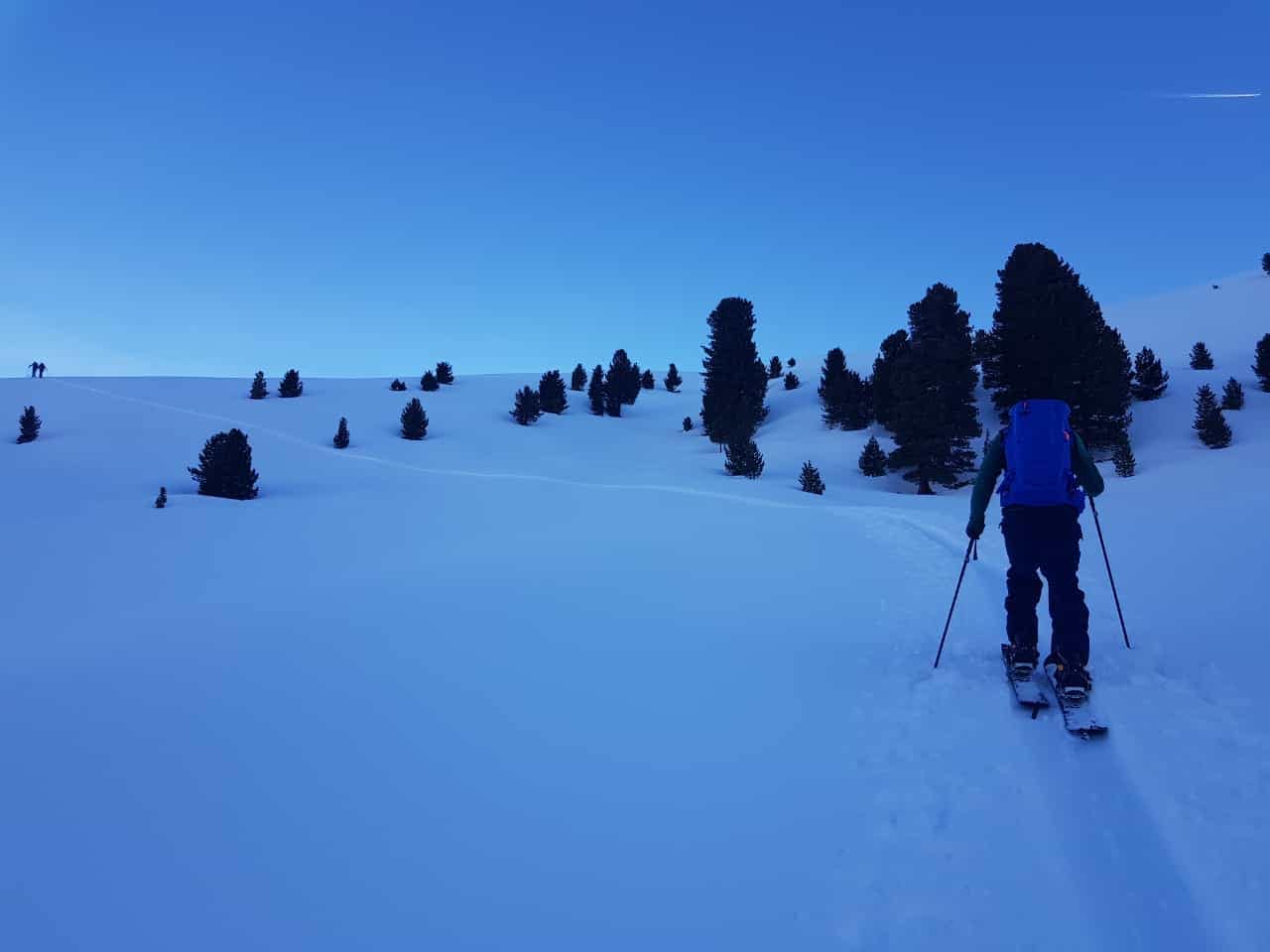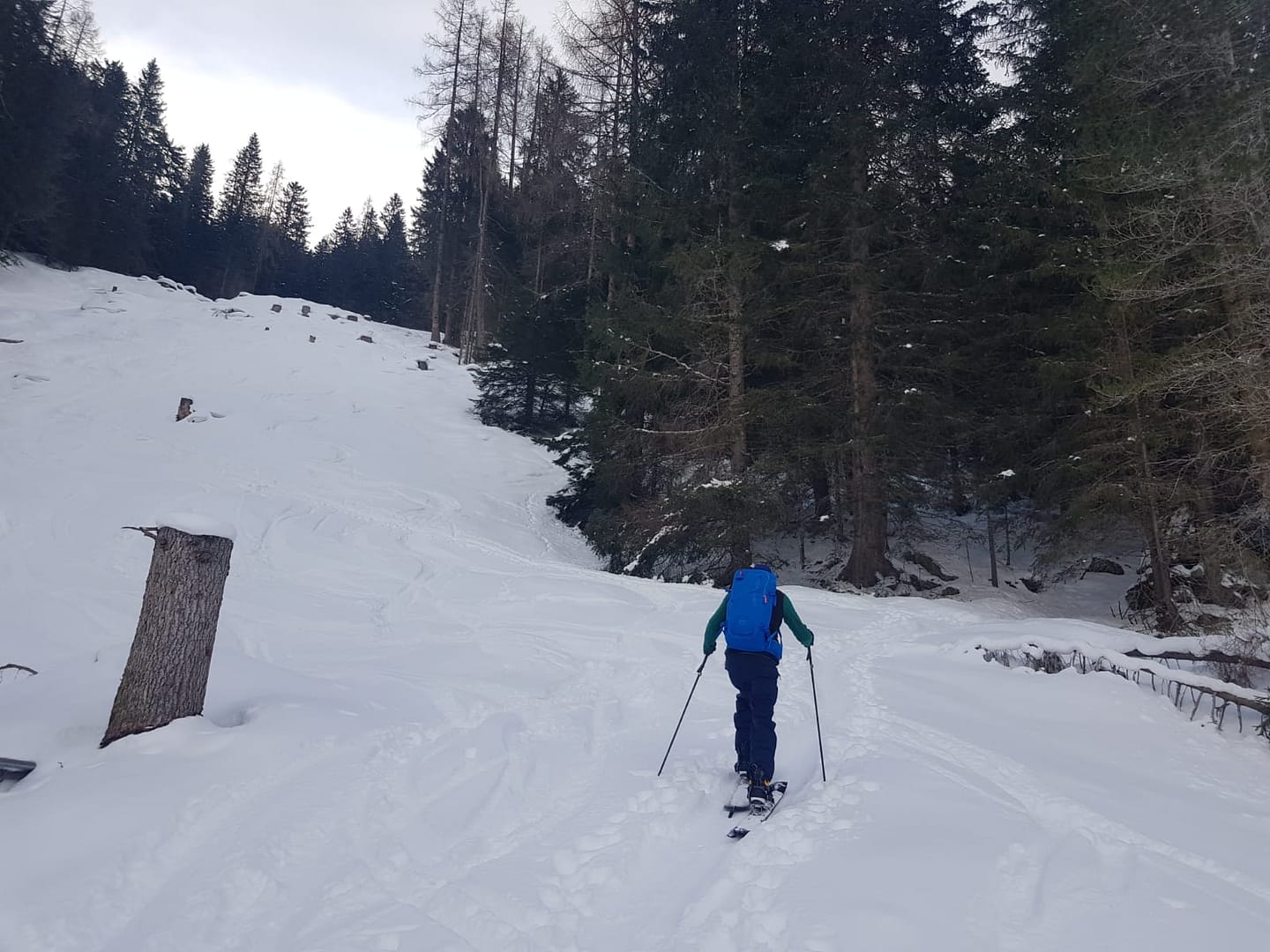 Rechts an der Hütte vorbei gehen wir über den flachen Almboden in den Talschluss und über eine Stufe durch den lichten Wald links haltend in den Rotboden. In Richtung Osten führt uns eine recht flache Mulde über mehrere kurze, mittelsteile Stufen, bis zu einem lichten Wald auf der linken Seite, welcher uns auf den freien Südwesthang bringt. Bis hier ist es eine sehr schattige und kalte Angelegenheit. 🙂