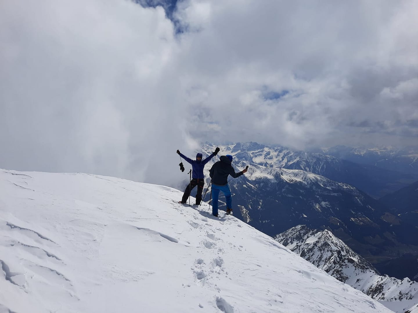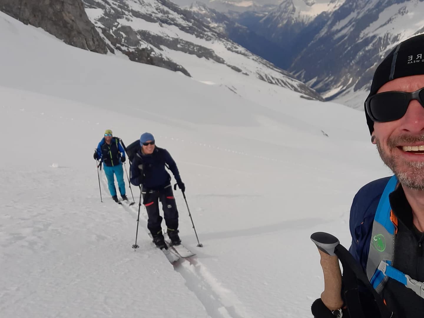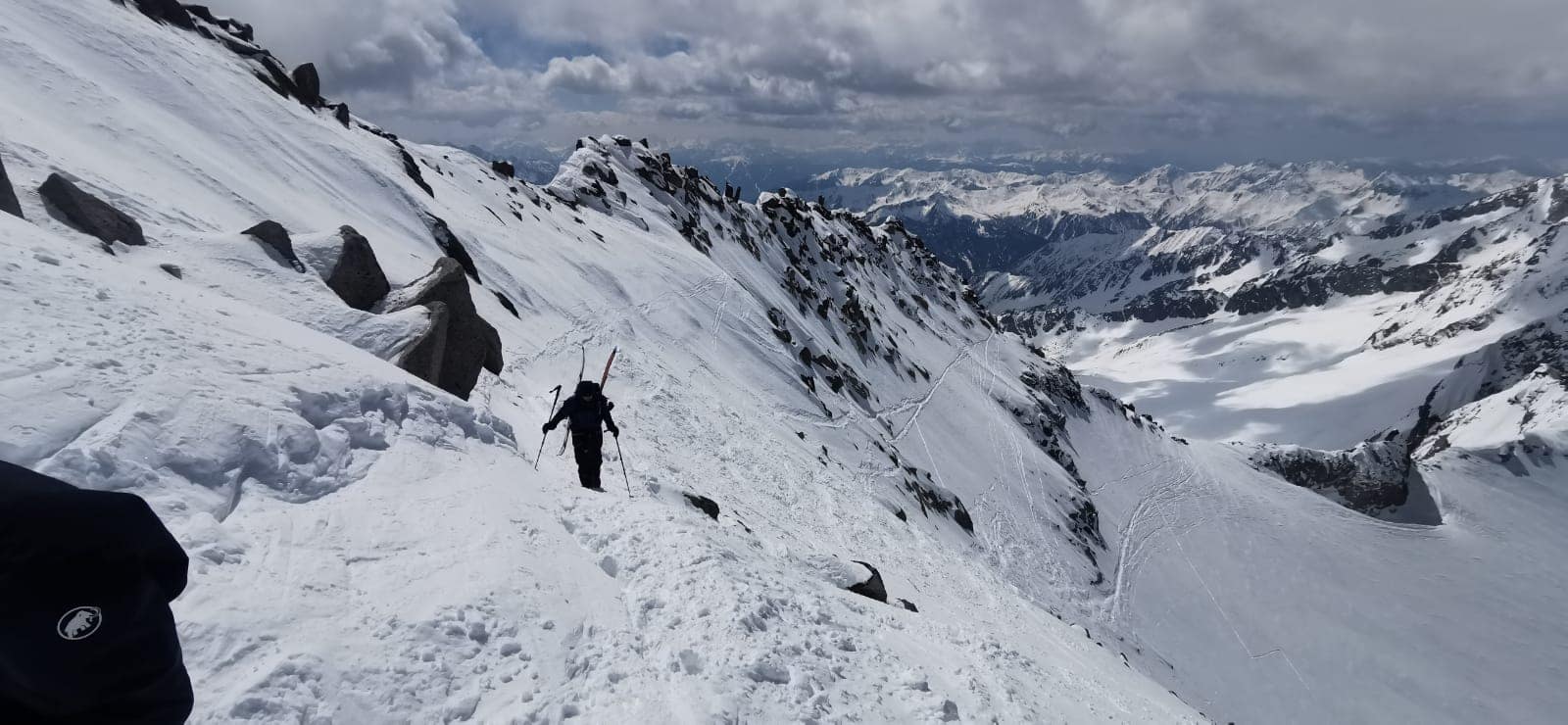 Von der Greizer Hütter sind wir, wie schon gestern, mit Harscheisen losgegangen, da der Schnee über Nacht gut gefroren war. Es geht wieder in südöstliche Richtung, leicht ansteigend zum Floitenkees. Am Floitenkees haben wir ein Depot von unseren Hüttenübernachtungssachen gemacht, da wir nicht mehr zurück zur Hütte abfahren, sondern bereits früher die schönen Hänge nutzen wollten.