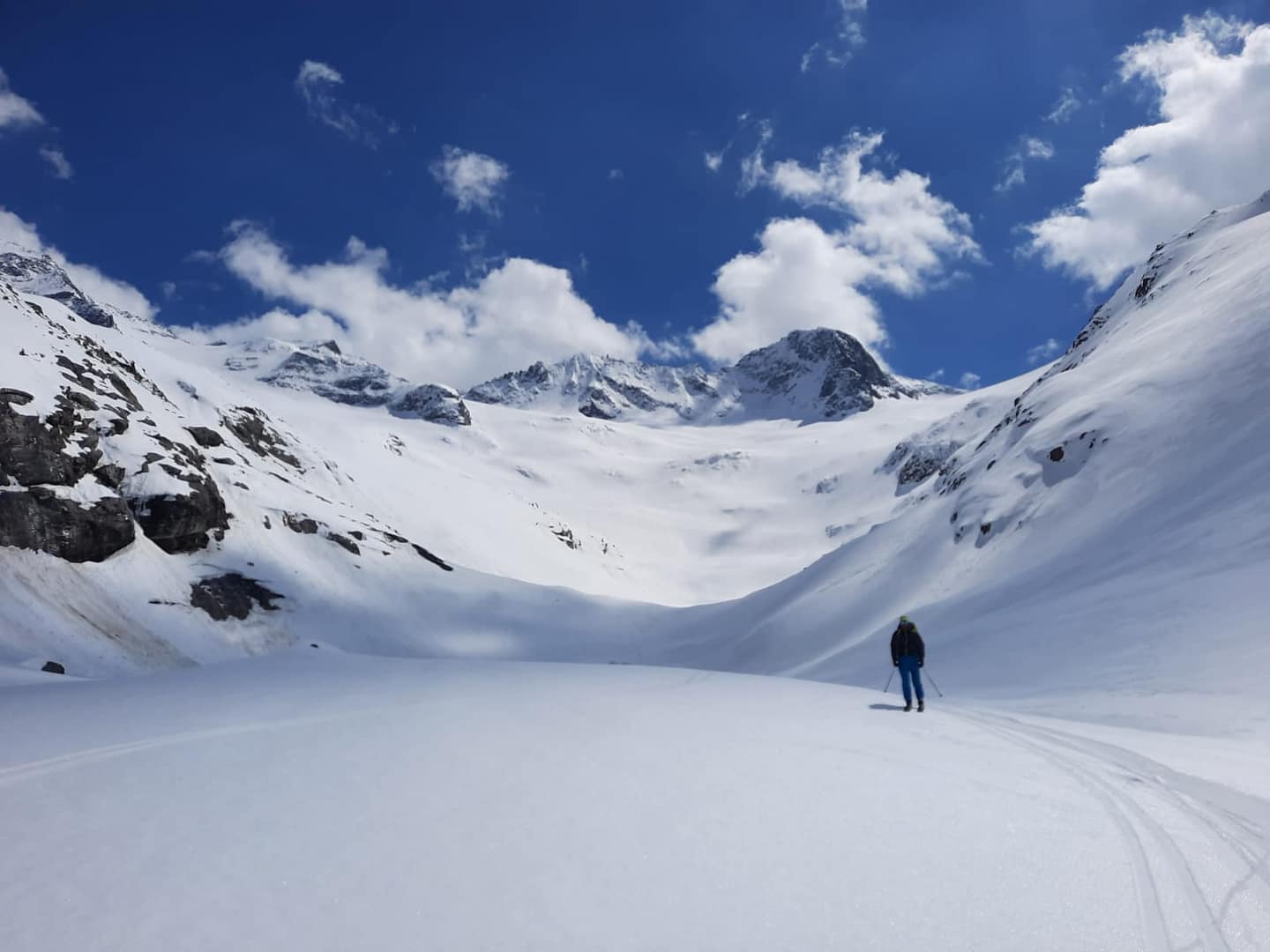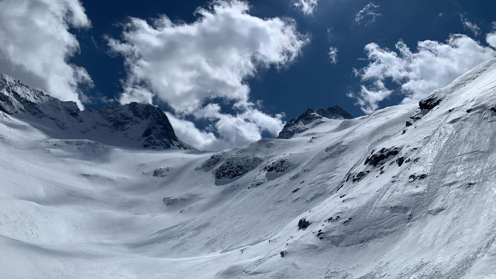 Die Abfahrt führt entlang der Aufstiegsroute zurück zu unserem Klamotten-Depot zum Floitenkees. Ab hier geht es über herrliche Hänge zurück zur Talstation der Materialseilbahn.
