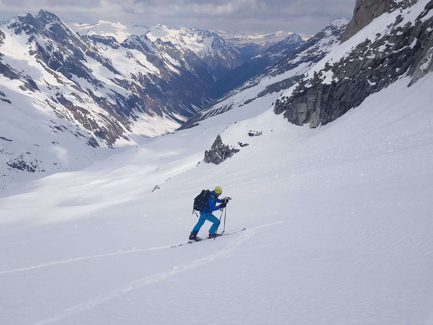 Von der Materialseilbahn kann man noch ca 200 hm relativ gut mit den Skiern abfahren, wobei man auch hier immer wieder Lawinenkegel sowie schneefreien Stellen queren muss. Auf ca. der Hälfte vom Floitengrund haben wir wieder aufgefellt und sind zurück zum Auto gelaufen.