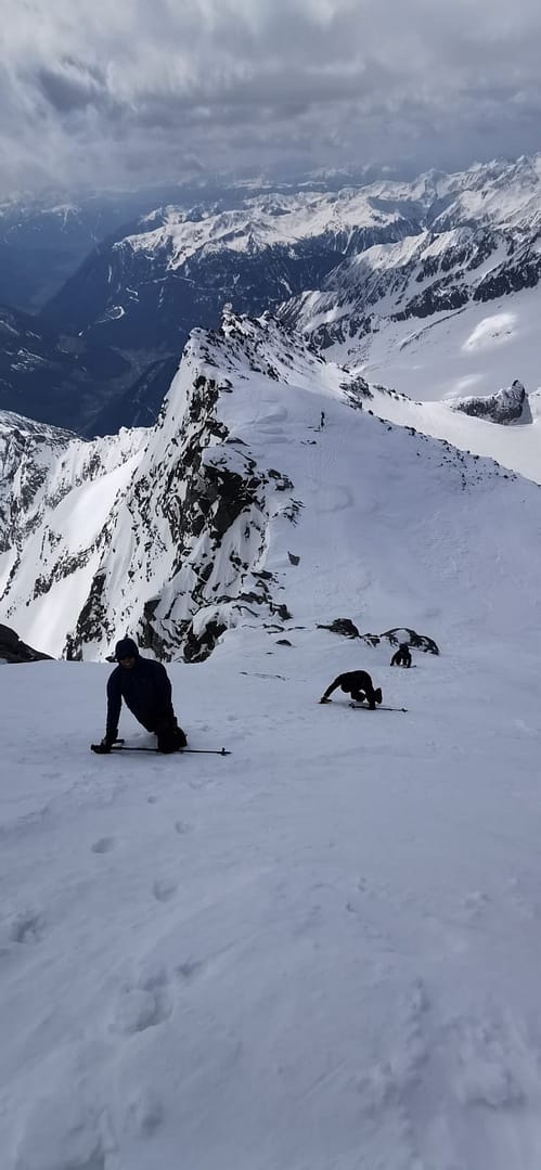 An der Trippachspitze wieder runter geklettert, sind wir die ersten Meter enlang des Hanges wieder mit Ski gegangen nur um wenig später zu merken, dass der nächste steile Hang zu eisig war. Hier sind wir wieder auf Steigeisen umgestiegen, die wir aber auch spätestens für die 45° steile Eisfanke am großen Löffler benötigt haben. Oben angekommen, geht man in einem kleinen Rechtsbogen rauf zum Gipfel.
