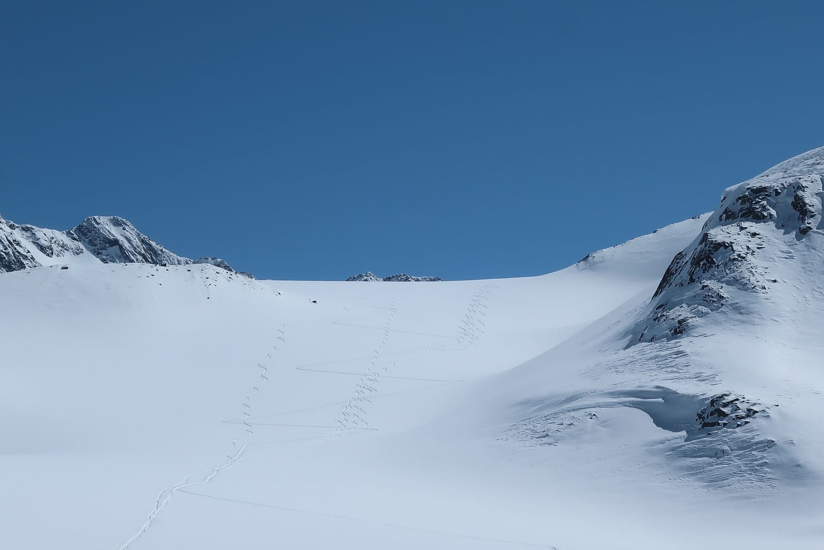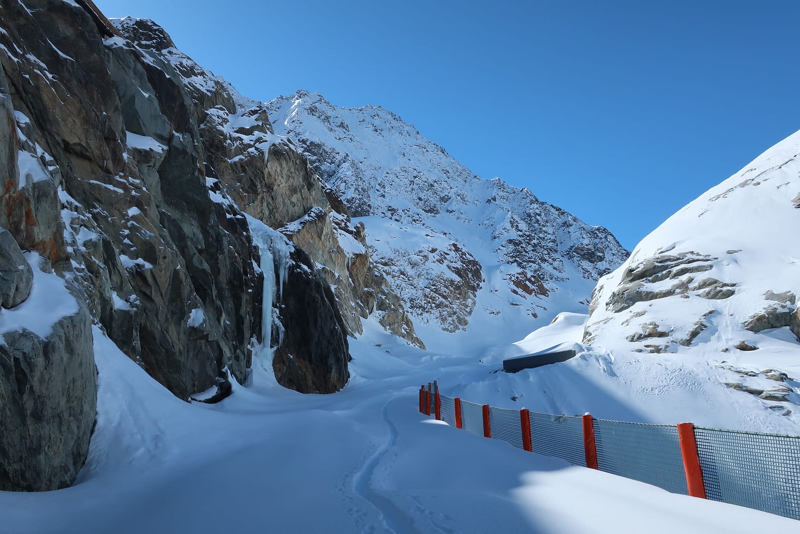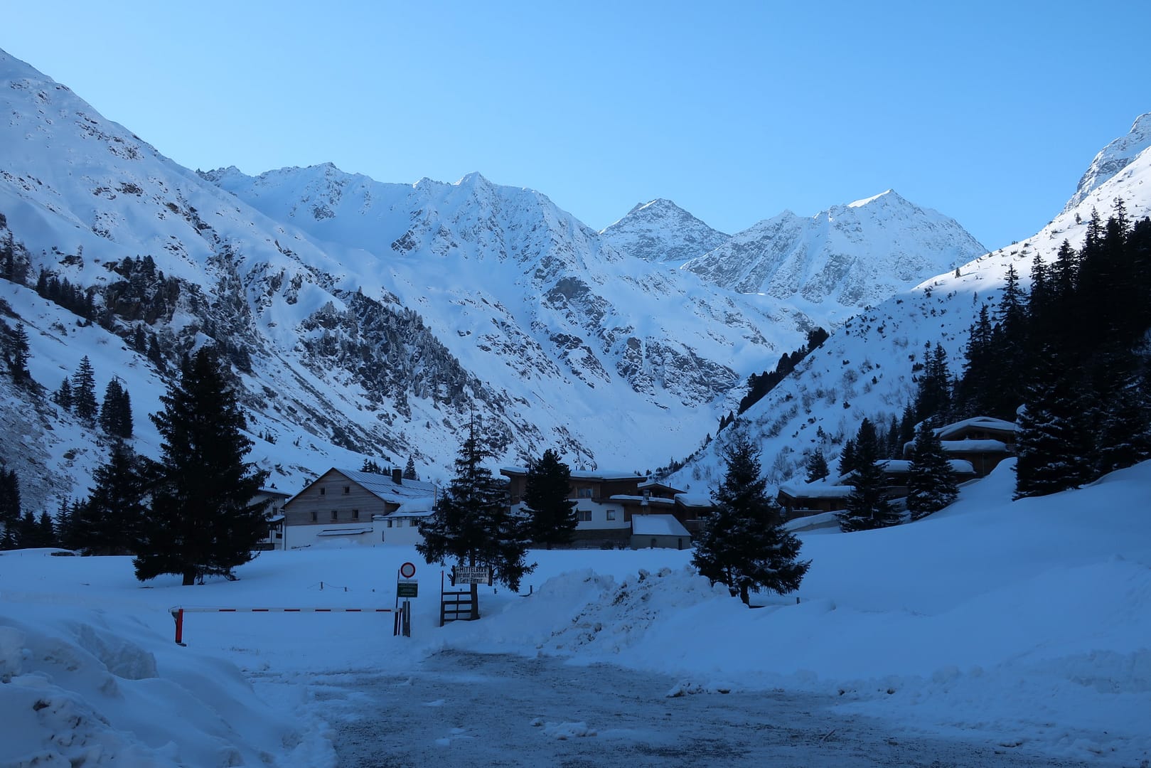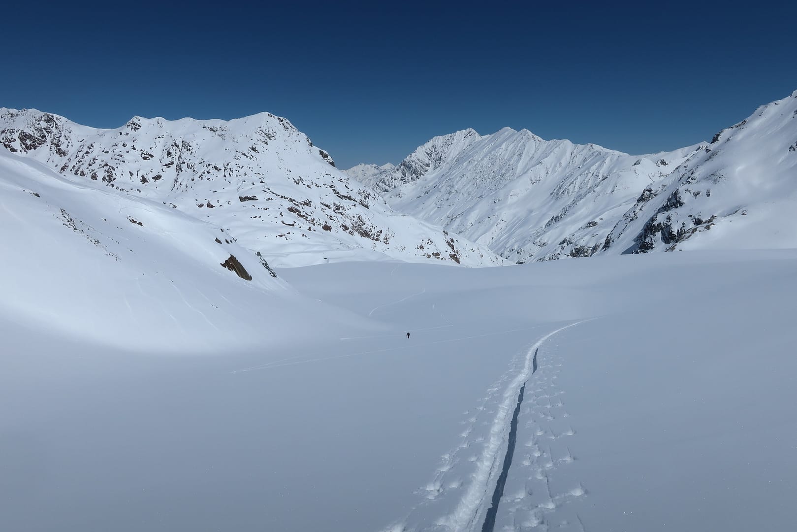 Wir starten in Mittenberg, bei dem obersten Parkplatz links, und gehen in das leicht ansteigende Tal Richtung Mittelbergferner. Vorbei am Gletscher-Stüberl kommen wir am Ende es Tals auf der rechten Seite an die erste Steilstufe. Da die Skispur sehr schmal war, musste ich halbseitig mitspuren, was die Tour bereits von Anfang an sehr anstrengend gemacht hat.