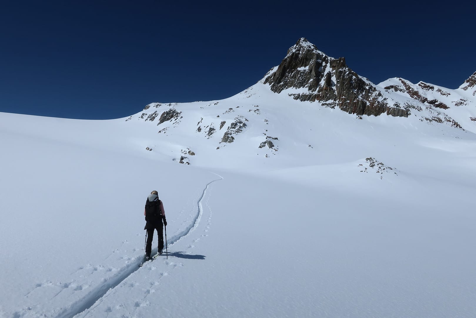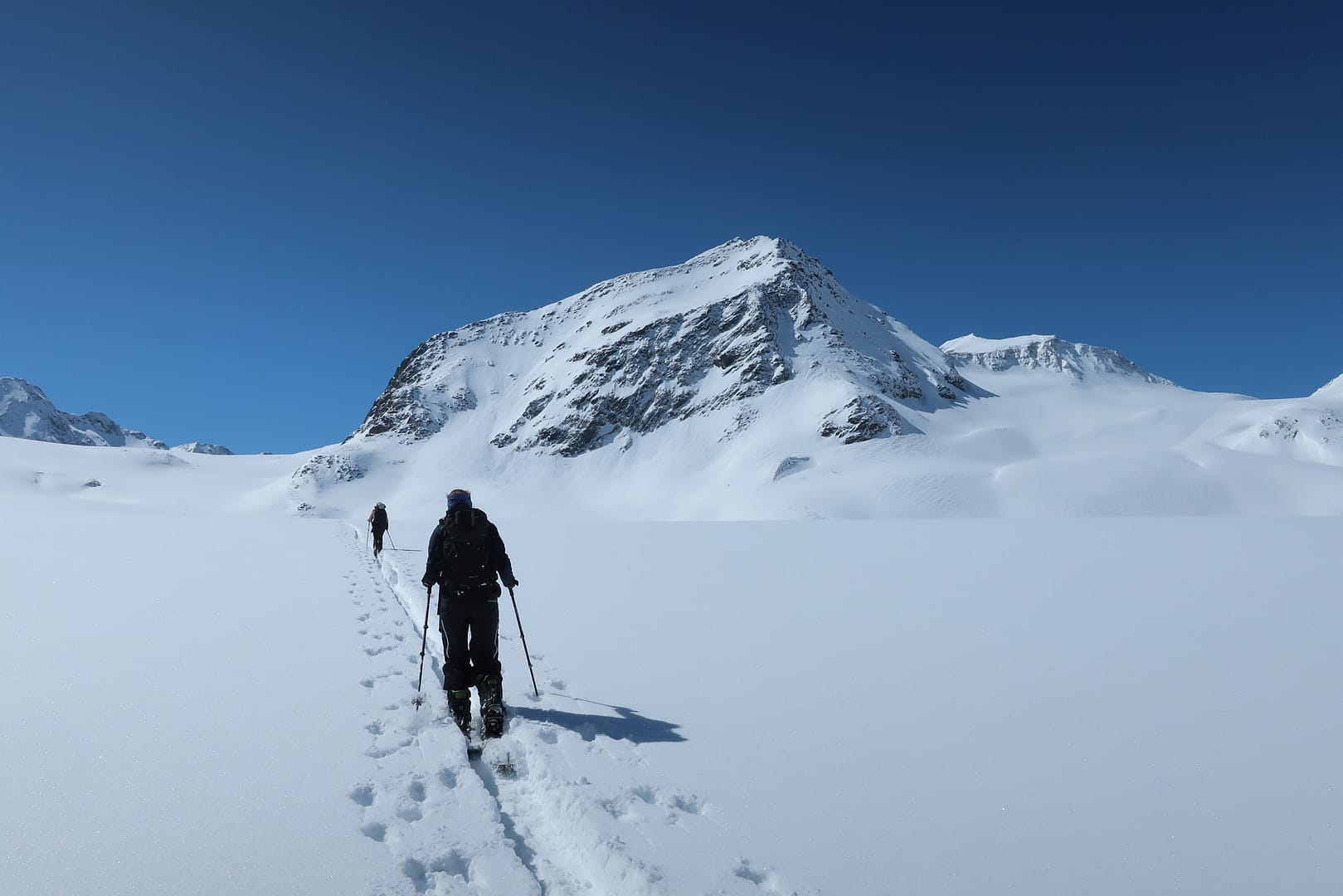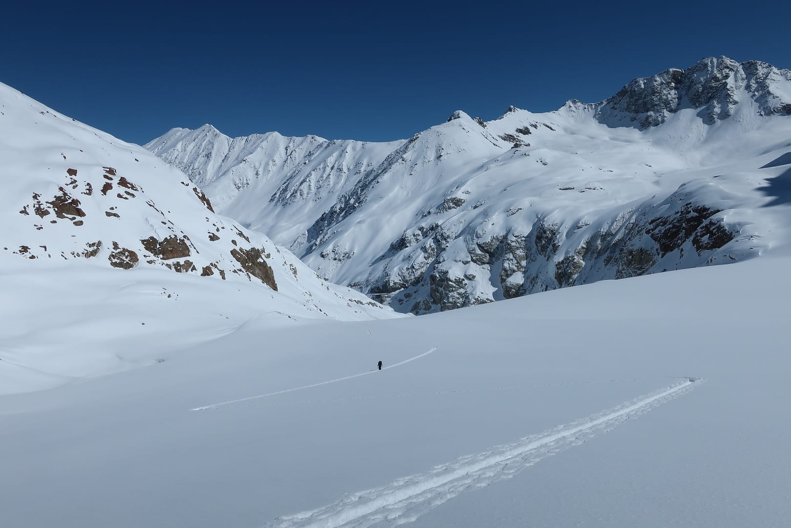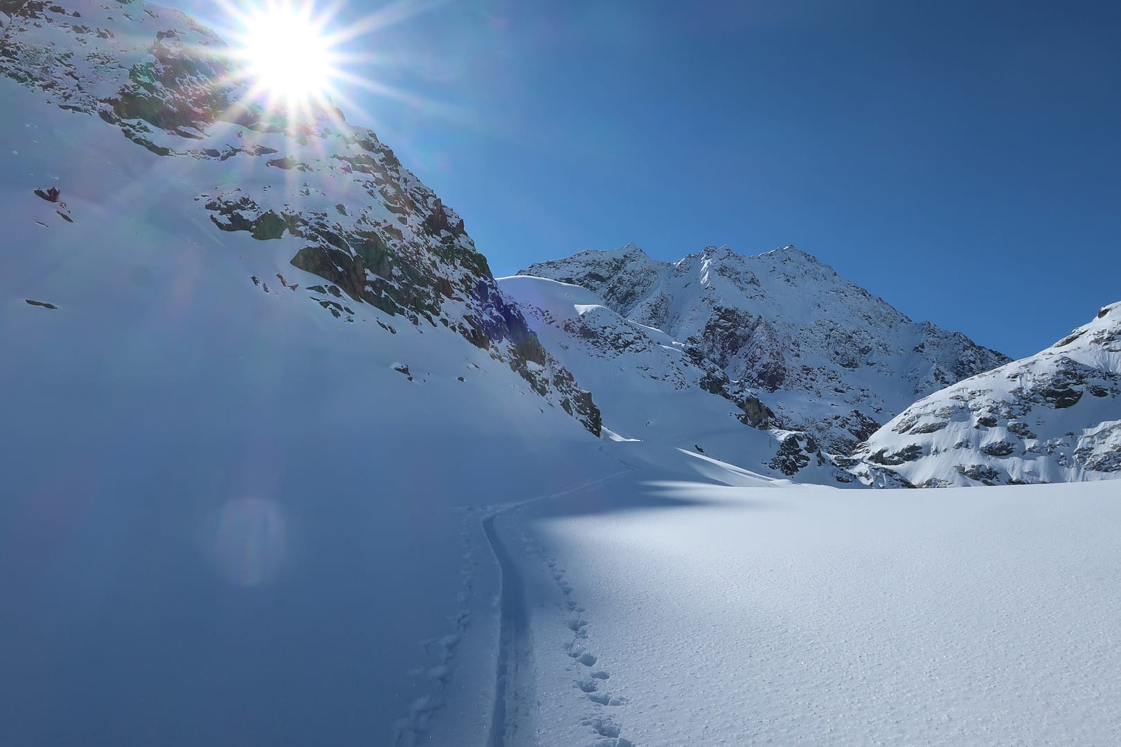Wir starten in Mittenberg, bei dem obersten Parkplatz links, und gehen in das leicht ansteigende Tal Richtung Mittelbergferner. Vorbei am Gletscher-Stüberl kommen wir am Ende es Tals auf der rechten Seite an die erste Steilstufe. Da die Skispur sehr schmal war, musste ich halbseitig mitspuren, was die Tour bereits von Anfang an sehr anstrengend gemacht hat.