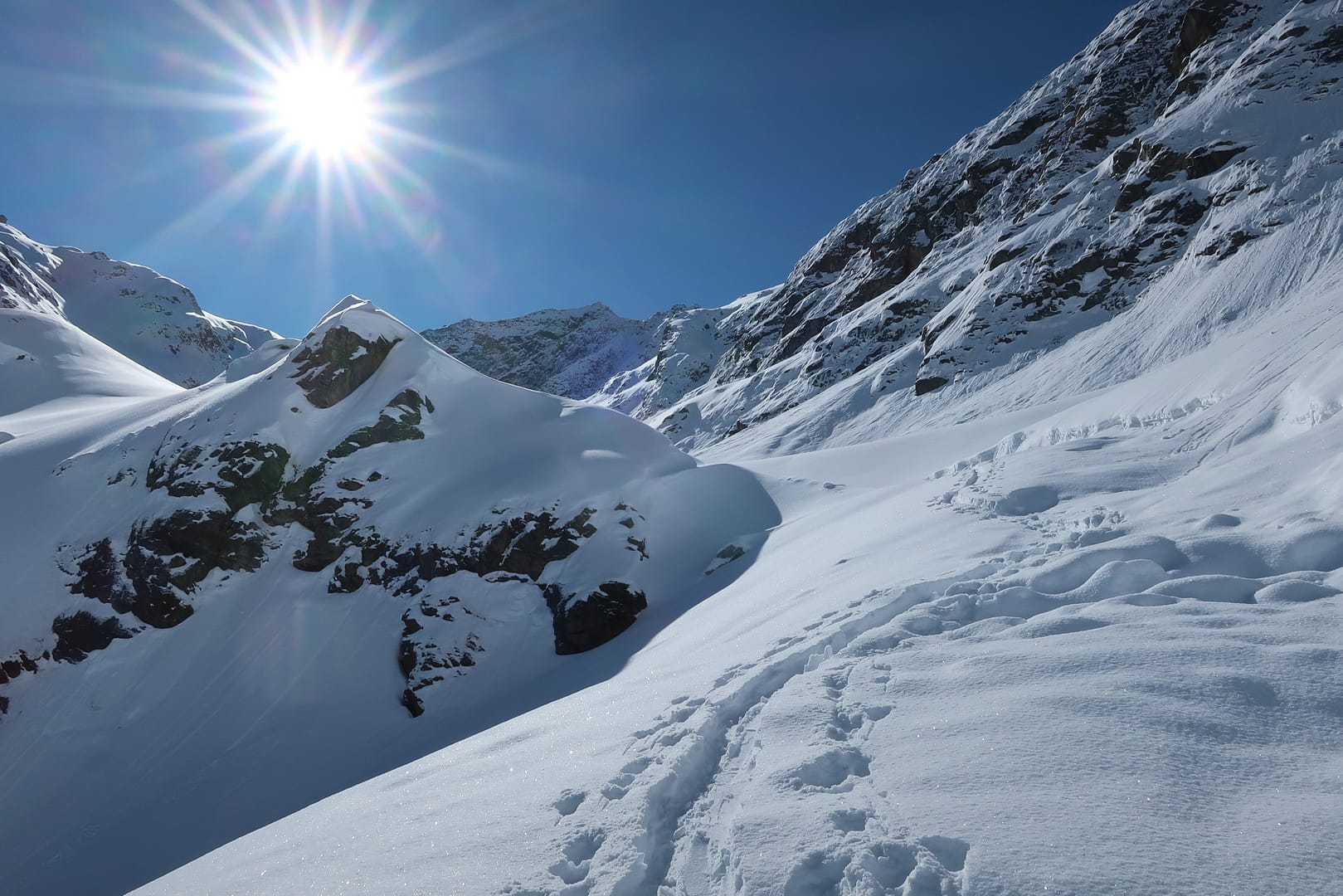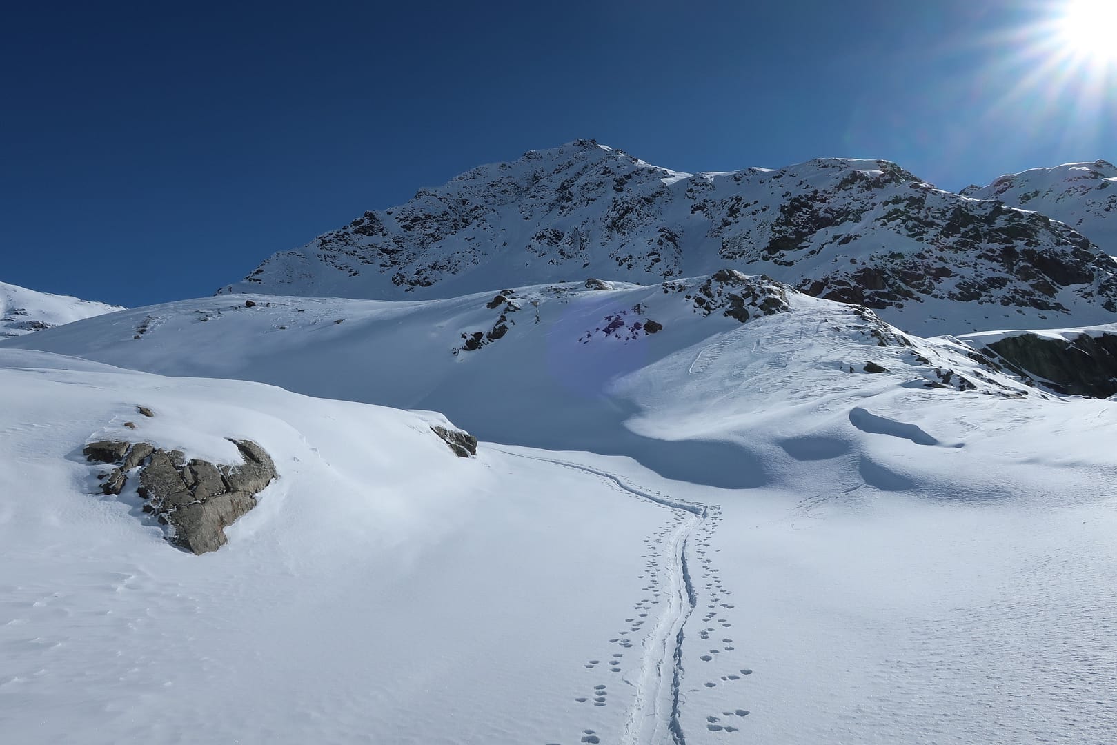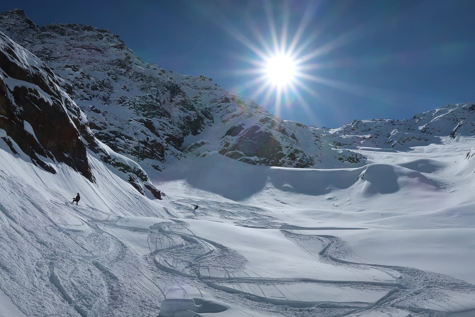 Die Abfahrt führt entlang der Aufstiegsroute zurück. Neben tollen Powderhängen hat die Tour bei Frischschnee auch ihre Tücken, denn einige Stücke sind sehr flach, so dass ich als Snowboarder irgendwann die Stöcke wieder rausgeholt habe und mich ein paar Mal anschieben musste. Trotzdem hat die Tour sich absolut gelohnt, die Landschaft ist einfach traumhaft schön.