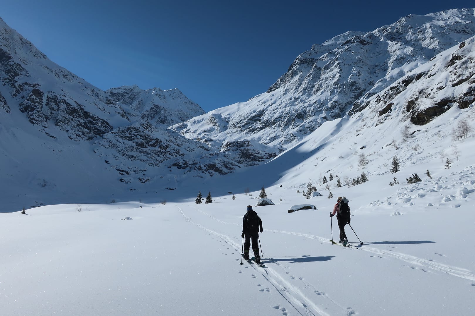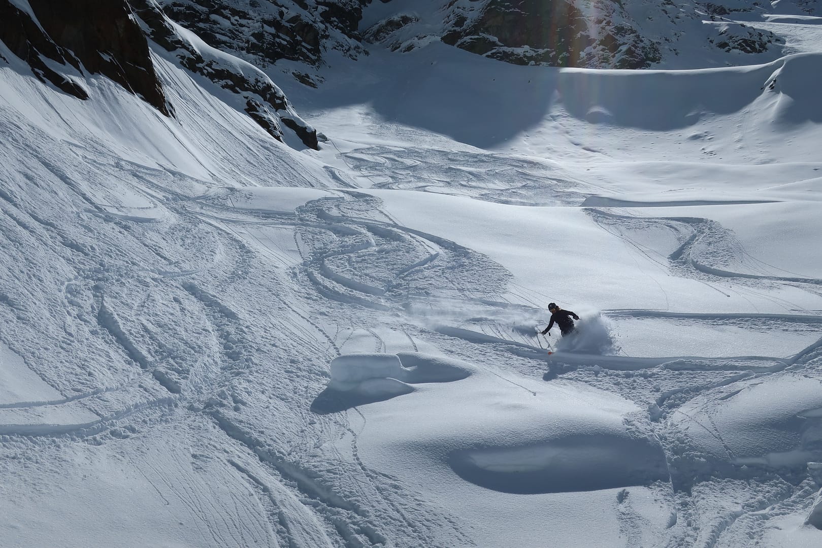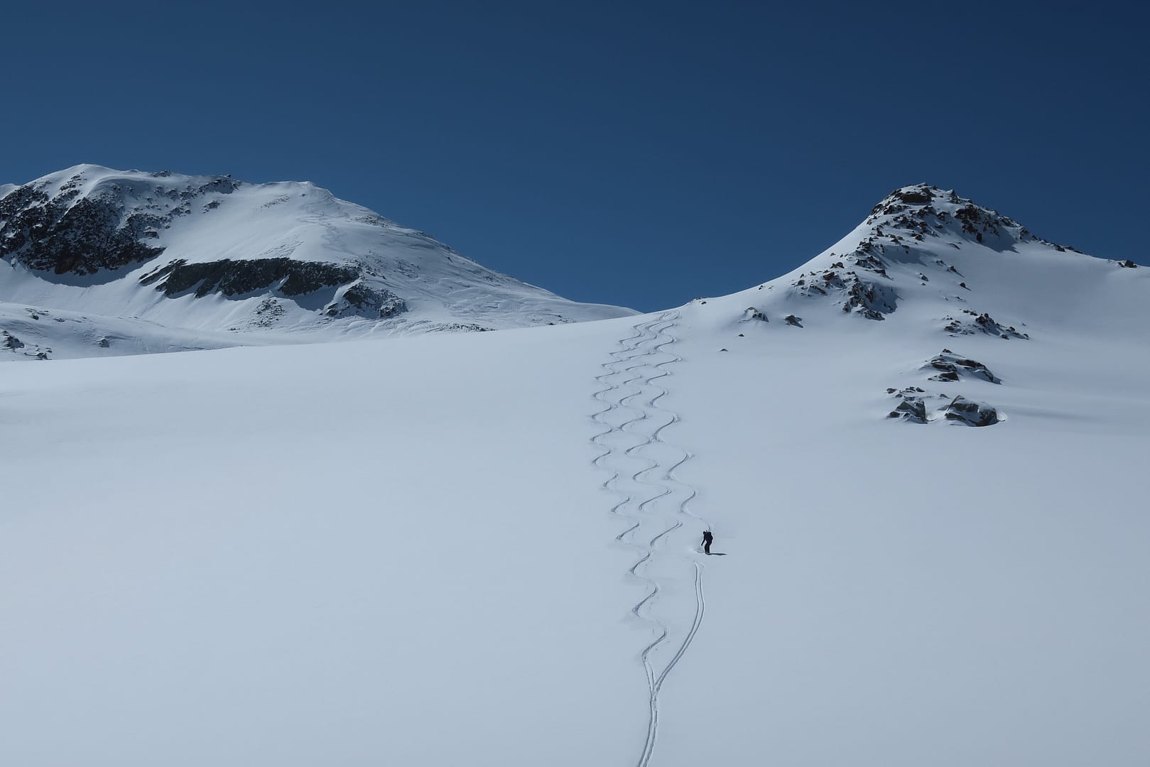 Die Abfahrt führt entlang der Aufstiegsroute zurück. Neben tollen Powderhängen hat die Tour bei Frischschnee auch ihre Tücken, denn einige Stücke sind sehr flach, so dass ich als Snowboarder irgendwann die Stöcke wieder rausgeholt habe und mich ein paar Mal anschieben musste. Trotzdem hat die Tour sich absolut gelohnt, die Landschaft ist einfach traumhaft schön.