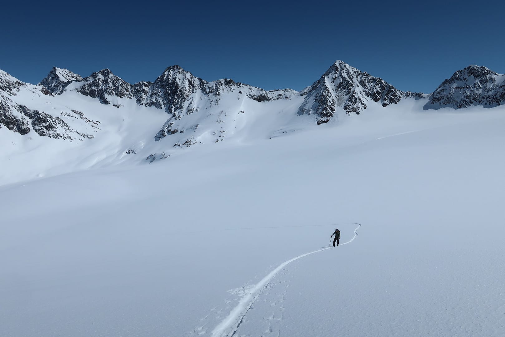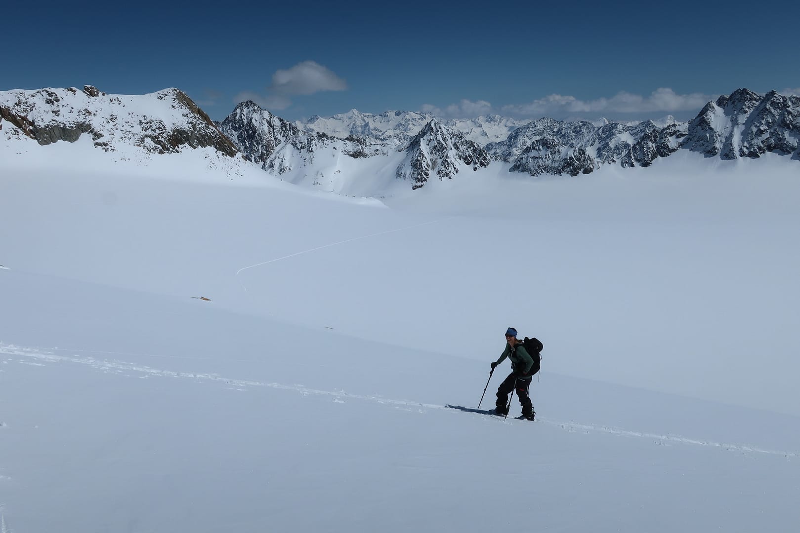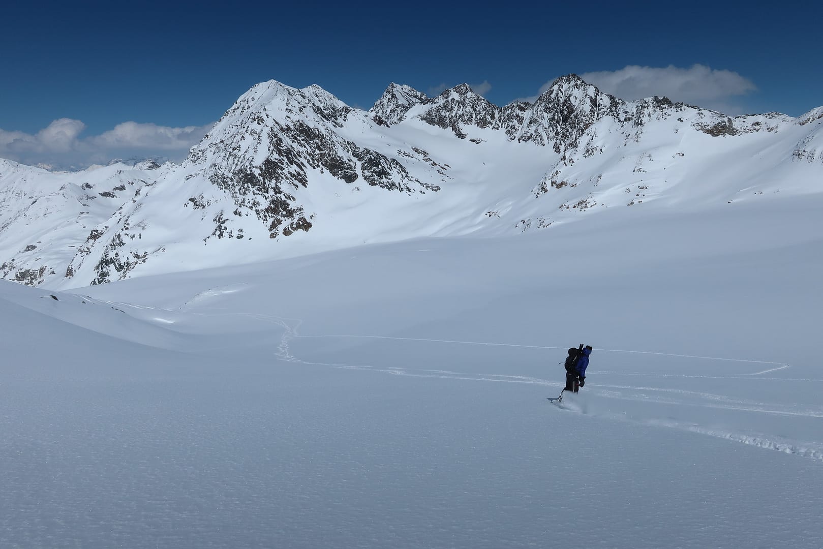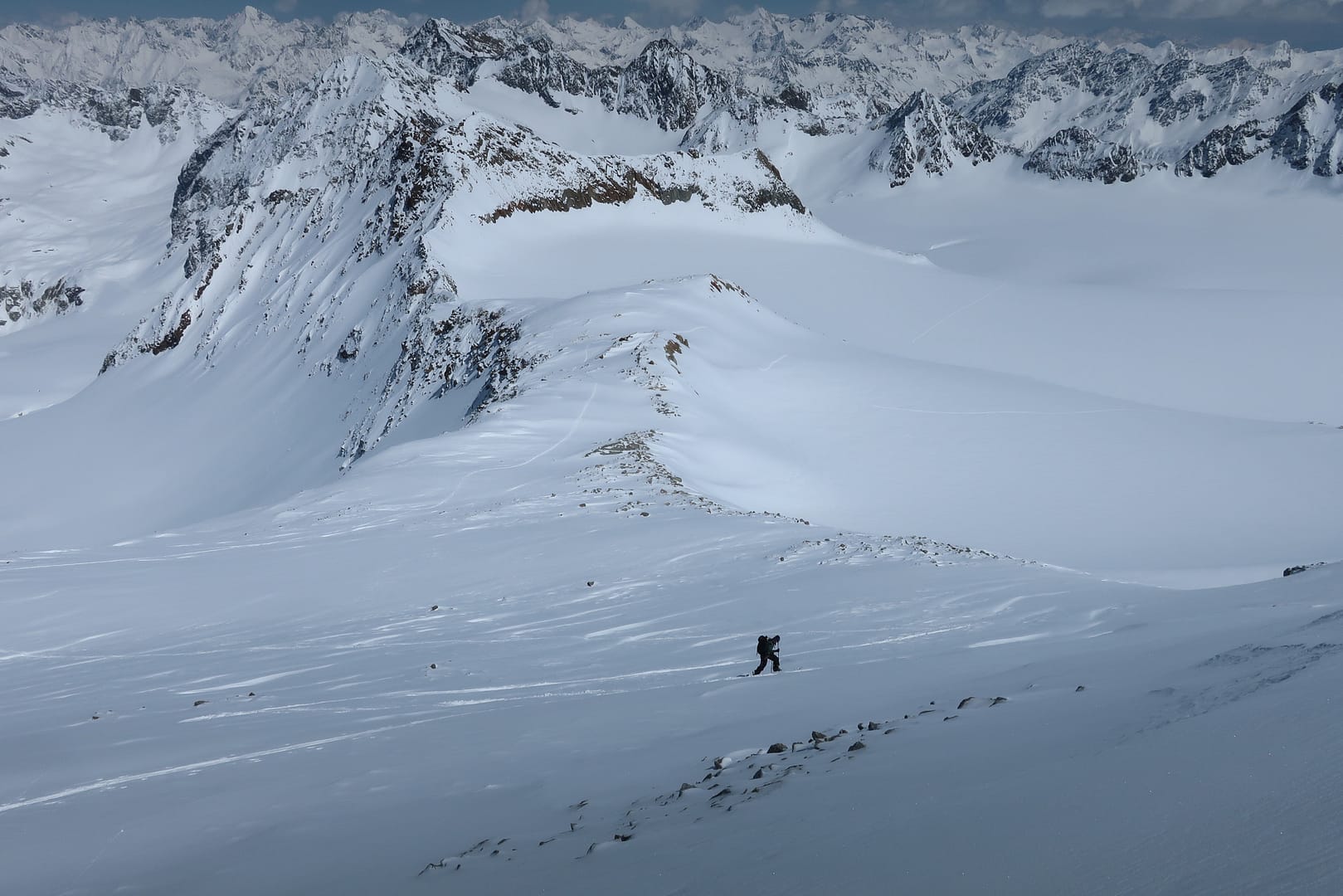 Das Gletscherbecken hat mich mächtig beeindruckt, die Weite und Ruhe waren einfach gigantisch, denn bis auf unsere Gruppe waren nur zwei weitere Tourengeher unterwegs. Zum Glück wurde ich ab dem Gletscher von meinen Tourenpartnern unterstützt, sie haben die schmale Spur für mich verbreitet. Auf dem doch eher flachen Ferner halten wir uns eher am rechten Rand, vorbei am rechten Fernerkogel Gipfel, wo wir nochmal eine steilere Stufe hinauf gehen.