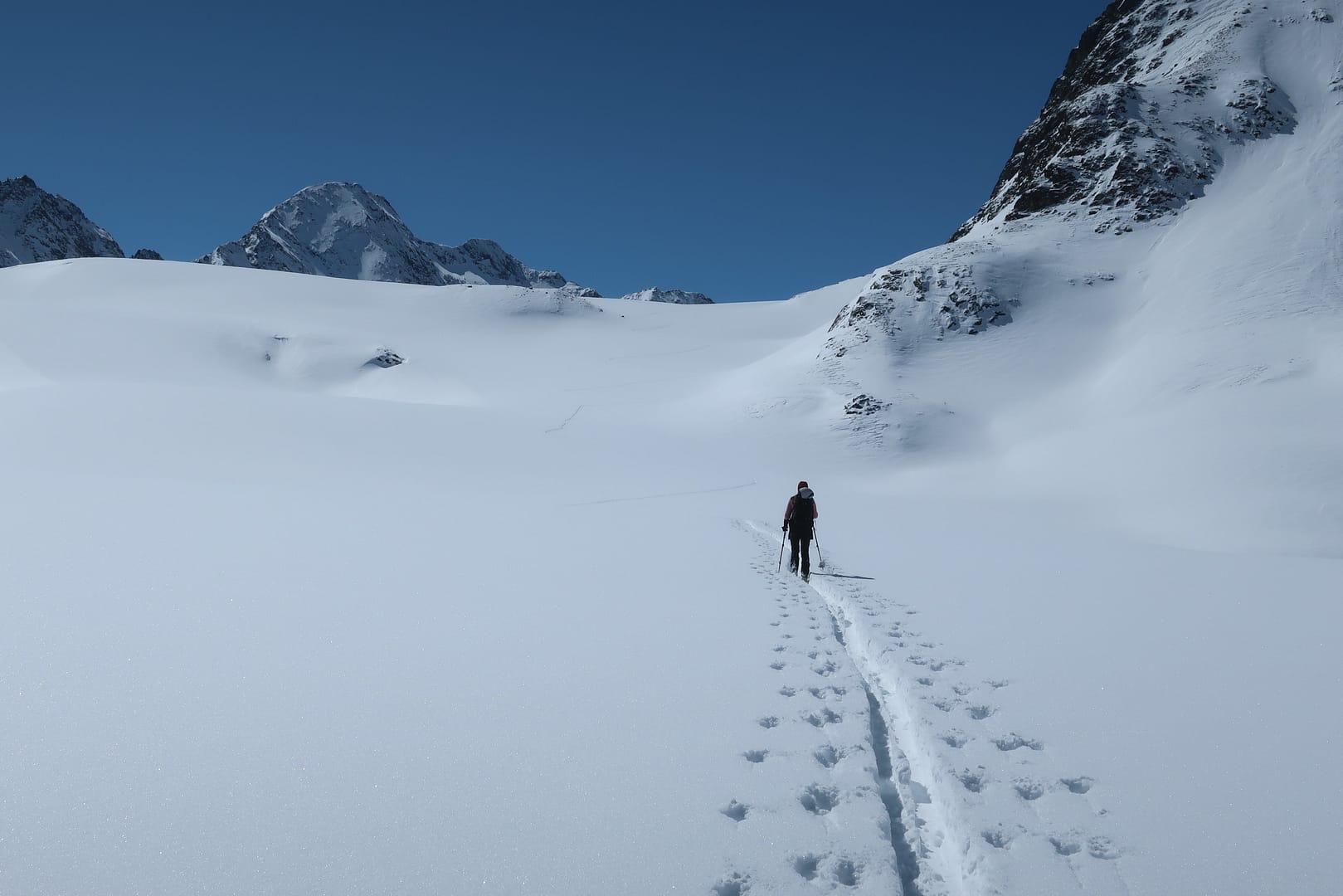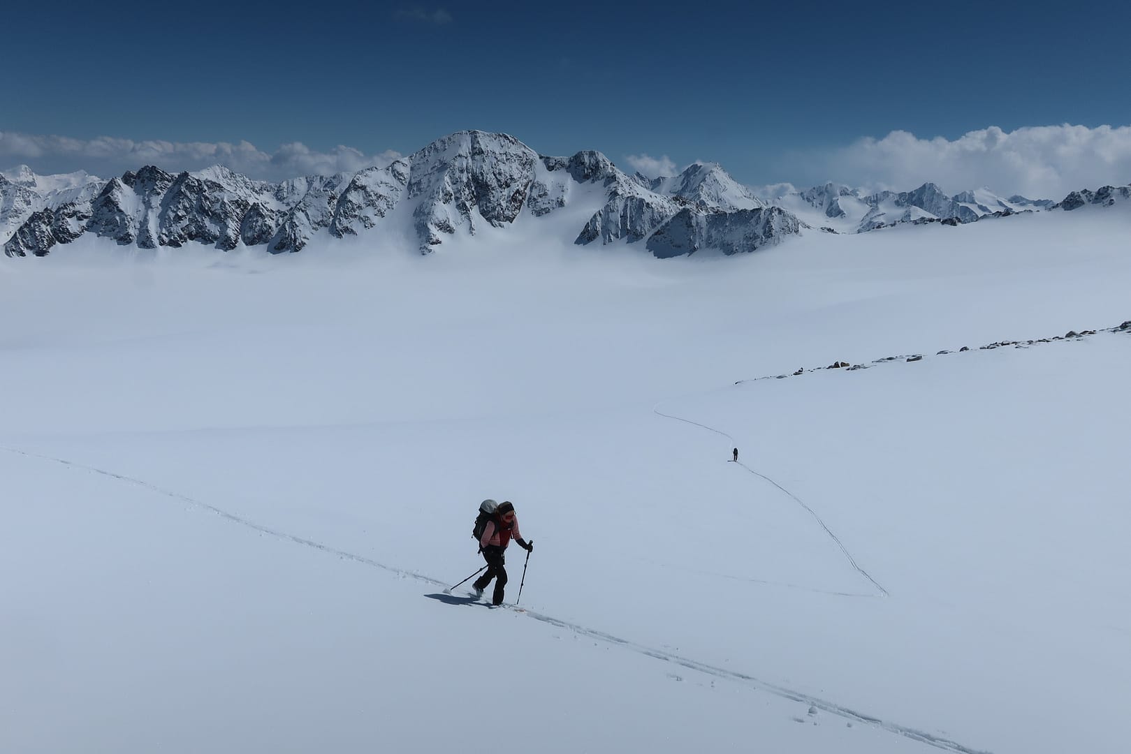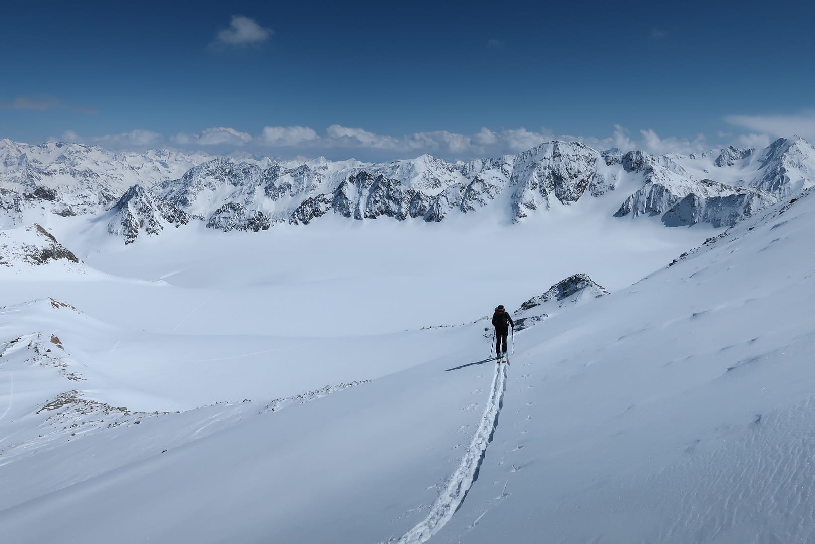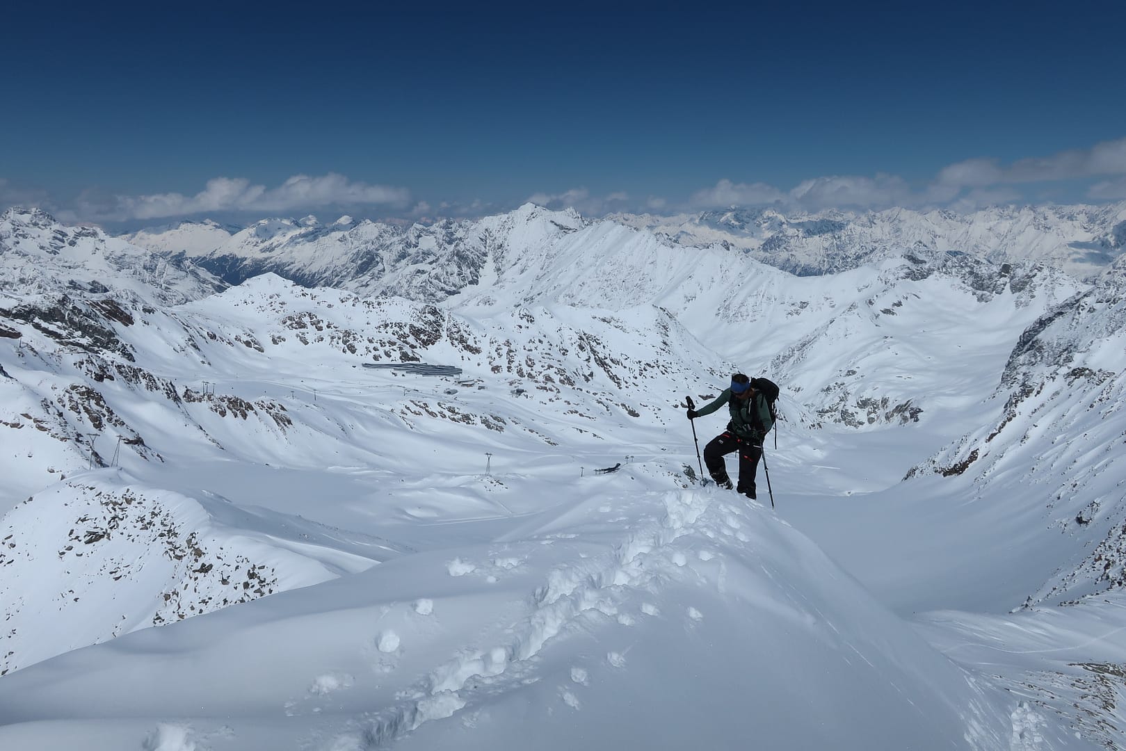Das Gletscherbecken hat mich mächtig beeindruckt, die Weite und Ruhe waren einfach gigantisch, denn bis auf unsere Gruppe waren nur zwei weitere Tourengeher unterwegs. Zum Glück wurde ich ab dem Gletscher von meinen Tourenpartnern unterstützt, sie haben die schmale Spur für mich verbreitet. Auf dem doch eher flachen Ferner halten wir uns eher am rechten Rand, vorbei am rechten Fernerkogel Gipfel, wo wir nochmal eine steilere Stufe hinauf gehen.
