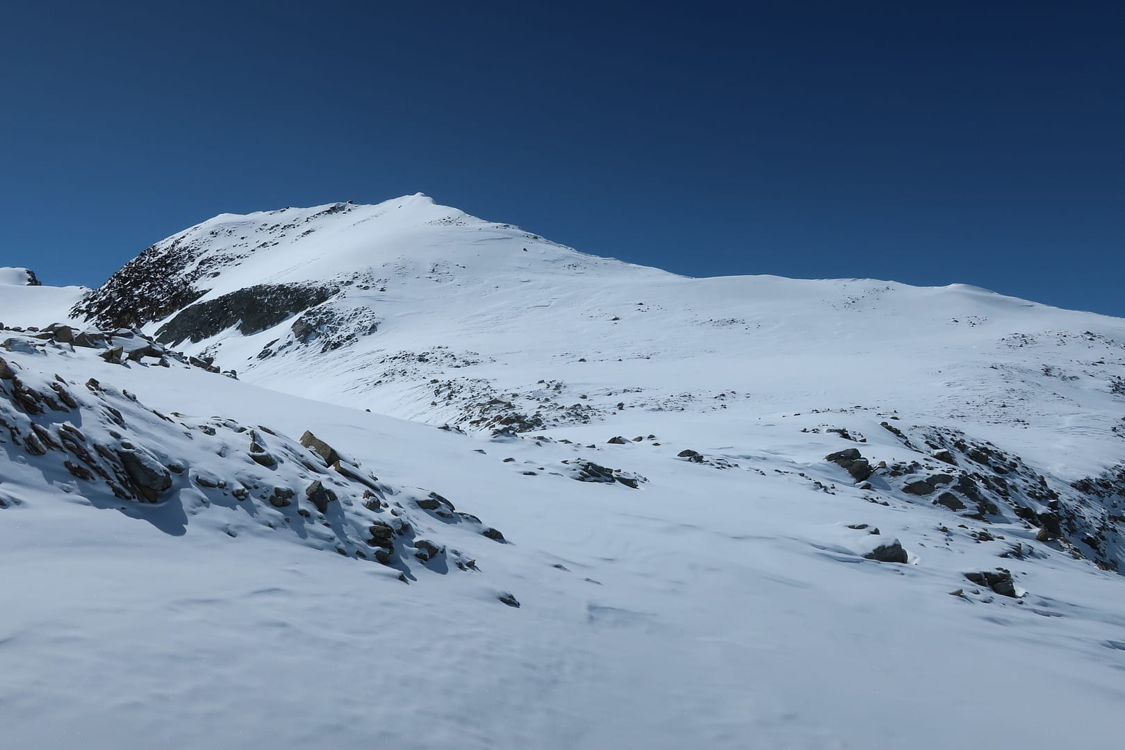 Den Gipfel besteigen wir über die steile nord-östliche Flanke, aufgrund der Bedingungen haben wir für die letzten Höhenmeter die Harscheisen drauf gemacht bzw. sind die letzten 15 Höhenmeter zu Fuß hoch gestapft.