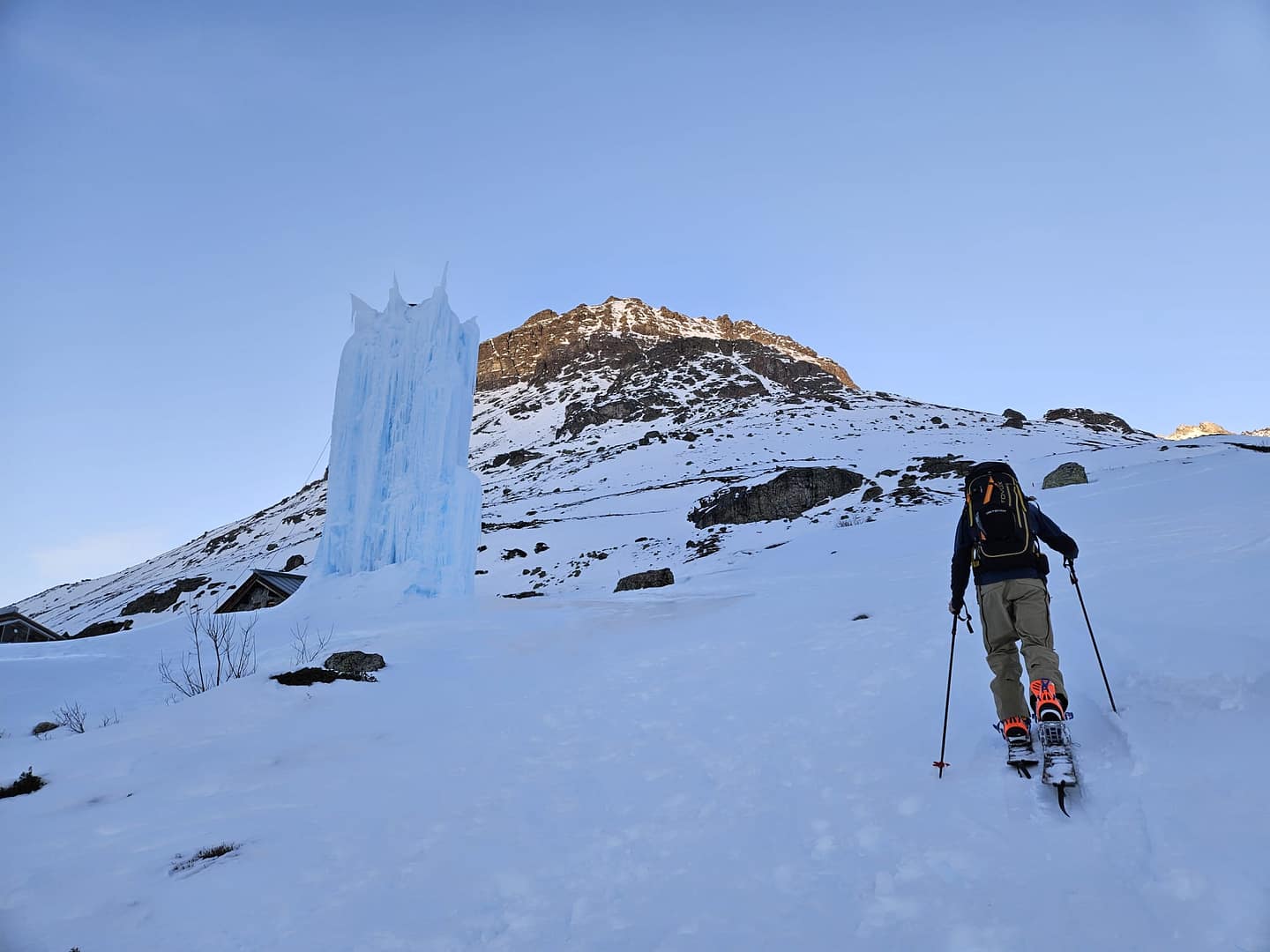 - Skitourenausrüstung: LVS, Sonde, Schaufel, Stöcke, Felle, evtl. Harscheisen