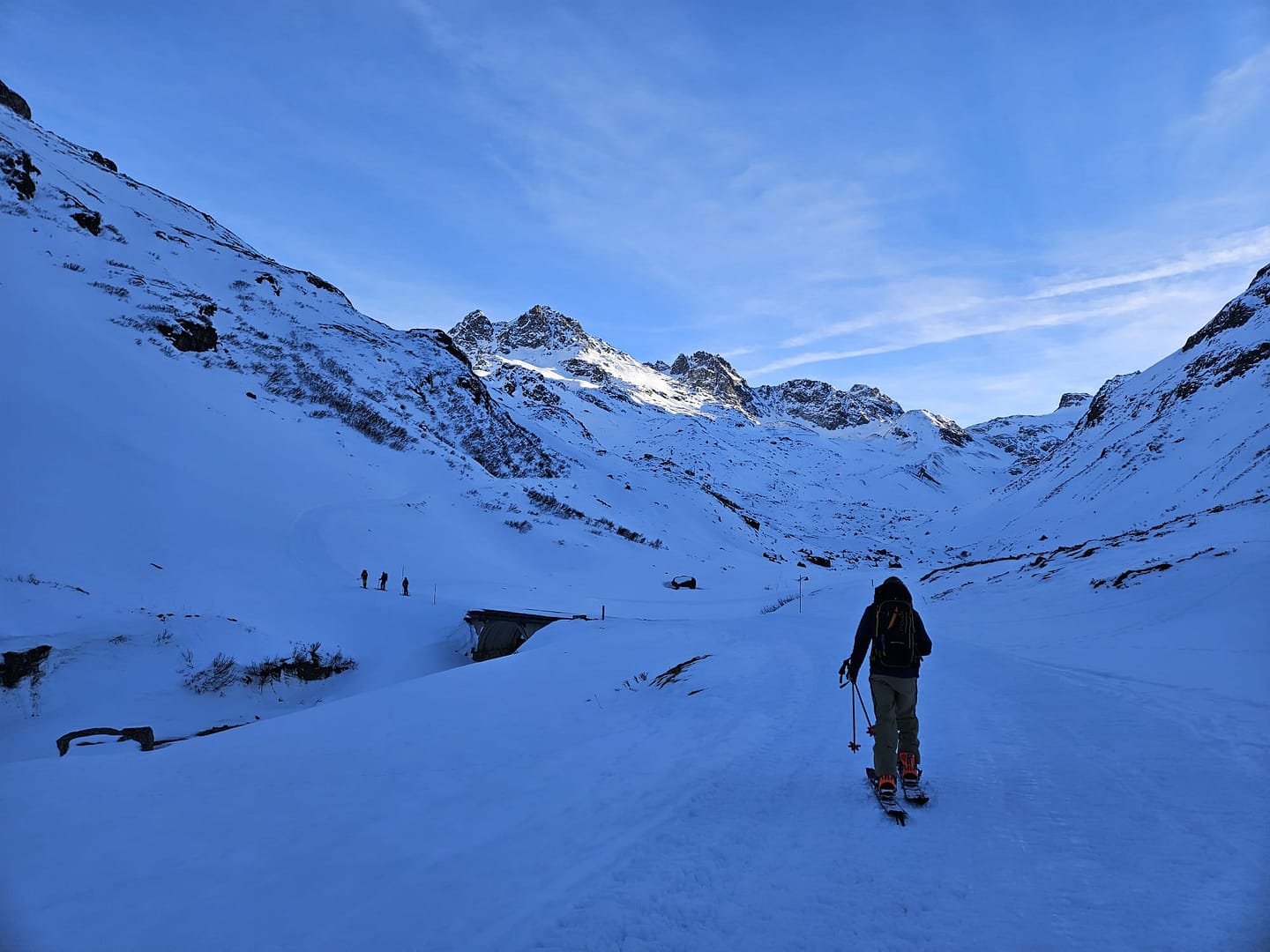 Vom Parkplatz aus steigen wir zunächst nach Süden auf und passieren die letzten Häuser von Galtür am Eingang des Jamtals. Entlang der linken Talseite folgen wir der gut erkennbaren Ratracspur ins Tal hinein. Nach etwa 3,1 Kilometern wird das Gelände enger, und wir überqueren den Jambach über eine Brücke, um auf der rechten Talseite weiter taleinwärts zu gehen.