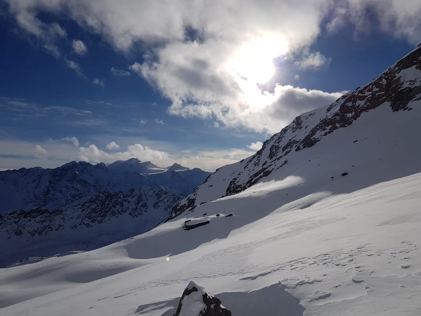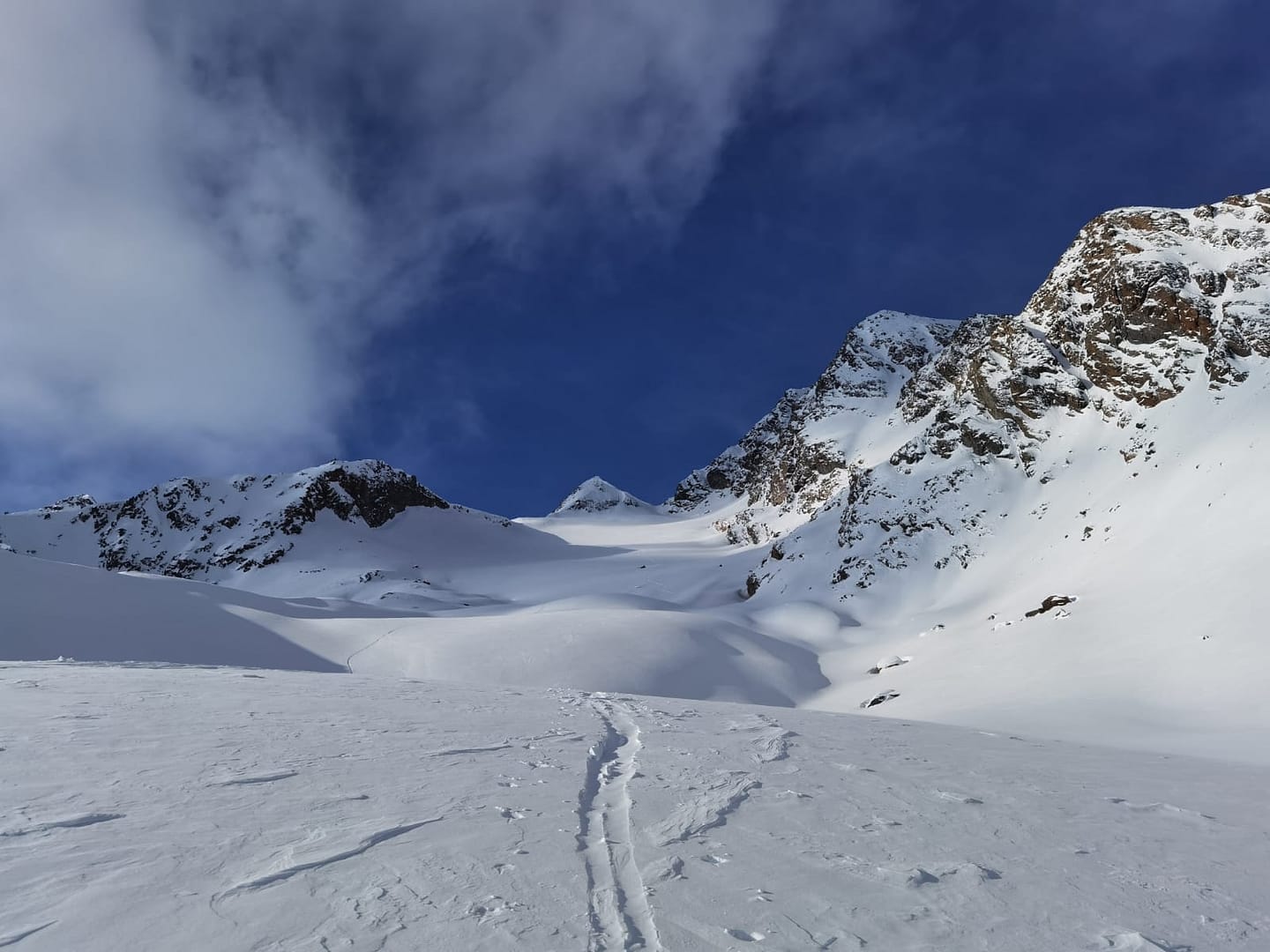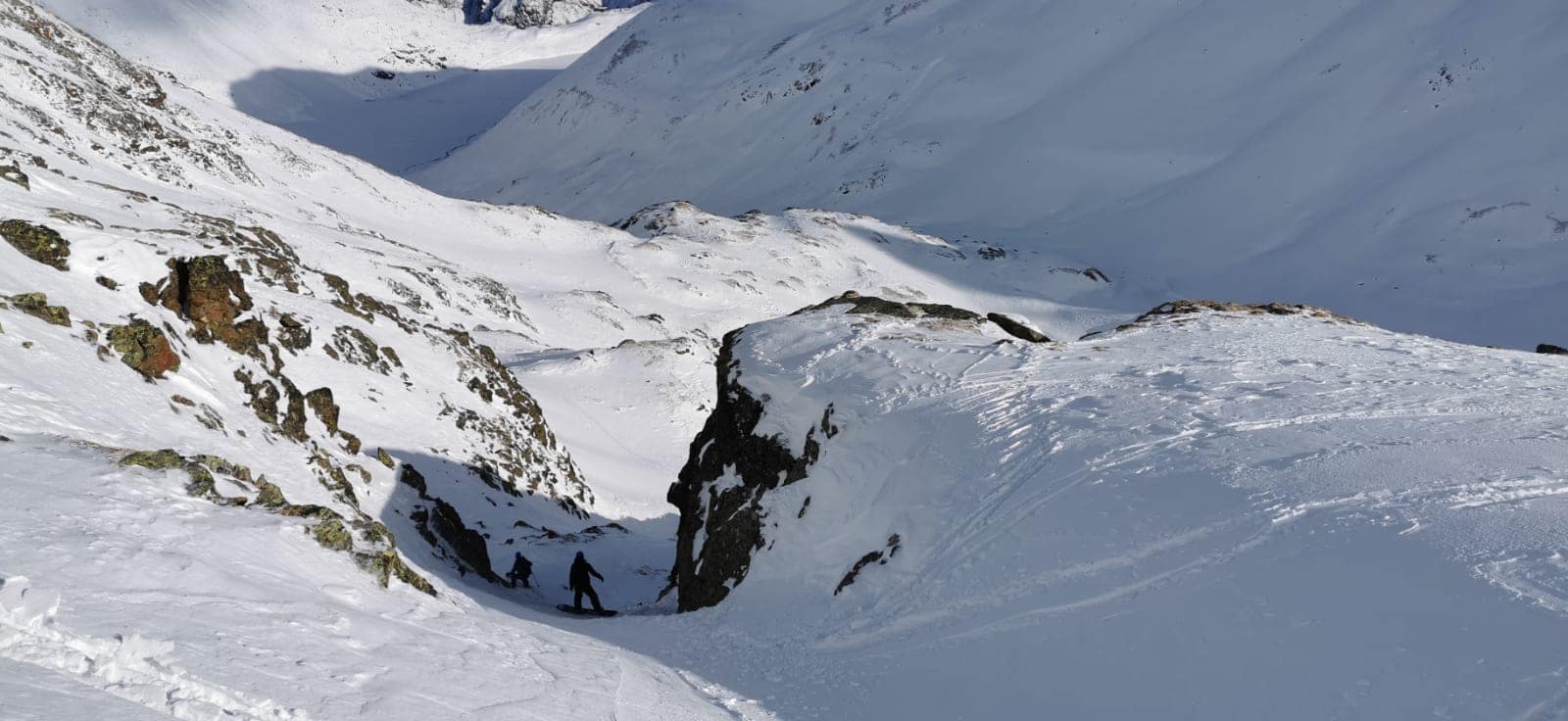 Erst einmal sind wir mit der Gondel zur Bergstation hochgefahren, somit spart man sich 600 Höhemeter im Aufstieg. Da man von der Bergstation ein paar Höhenmeter abfährt, braucht man zuvor noch nicht auffellen. Rechts am See vorbei umrunden wir den See, wenn ihr genug Schwung mitnimmt, müsst ihr erst später die Felle aufziehen. Hinten im Tal angekommen halten wir uns links und gehen über felsiges Gelände gerade auf den Wurmtaler Kopf zu. Ca. 1,5 km nach dem See zweigt der Weg zum K2 nach rechts ab und wir müssen eine kurze Steilstufe überwinden, die bei uns sehr abgeblasen und eisig war (3.-5. Bild).