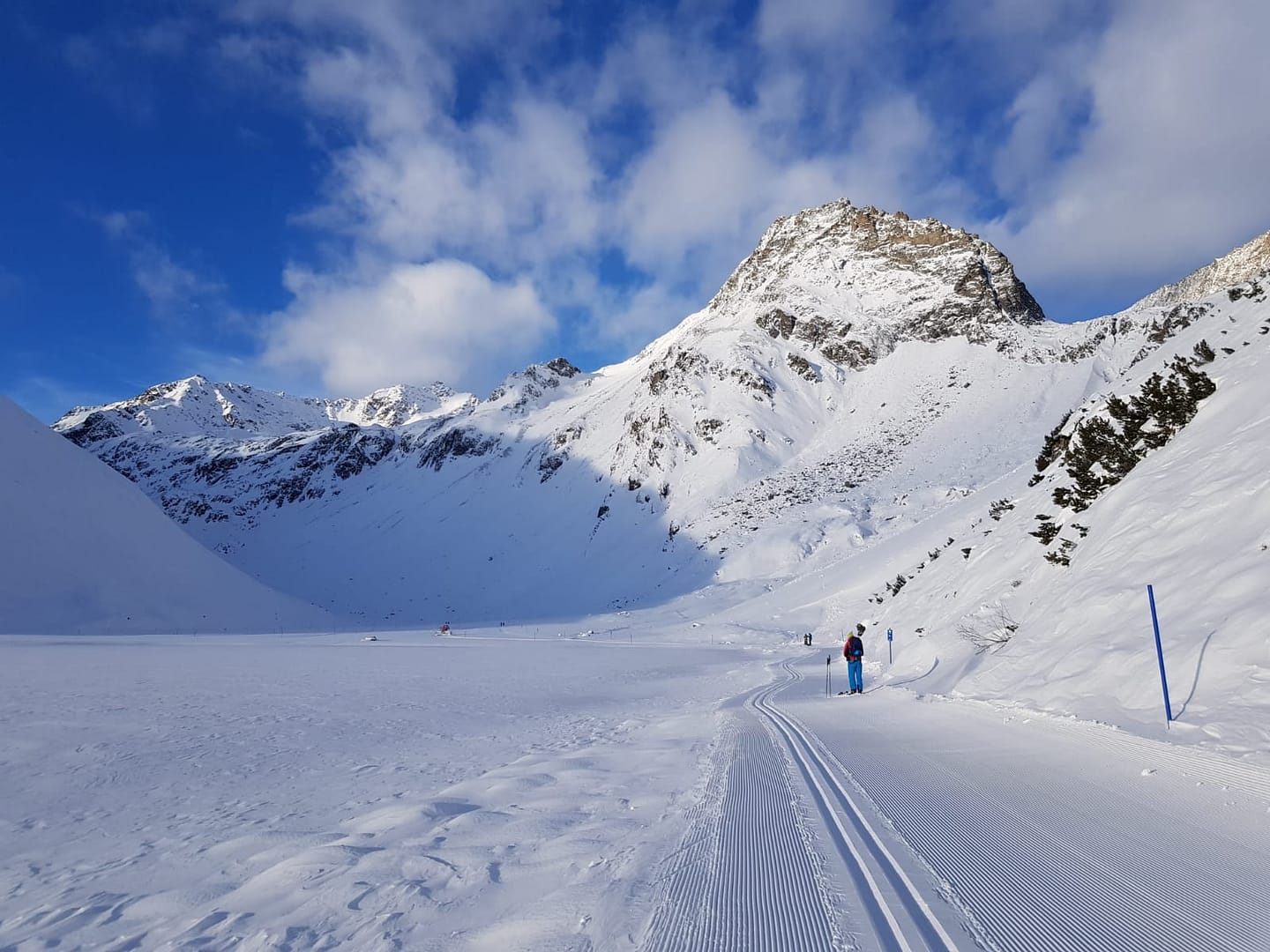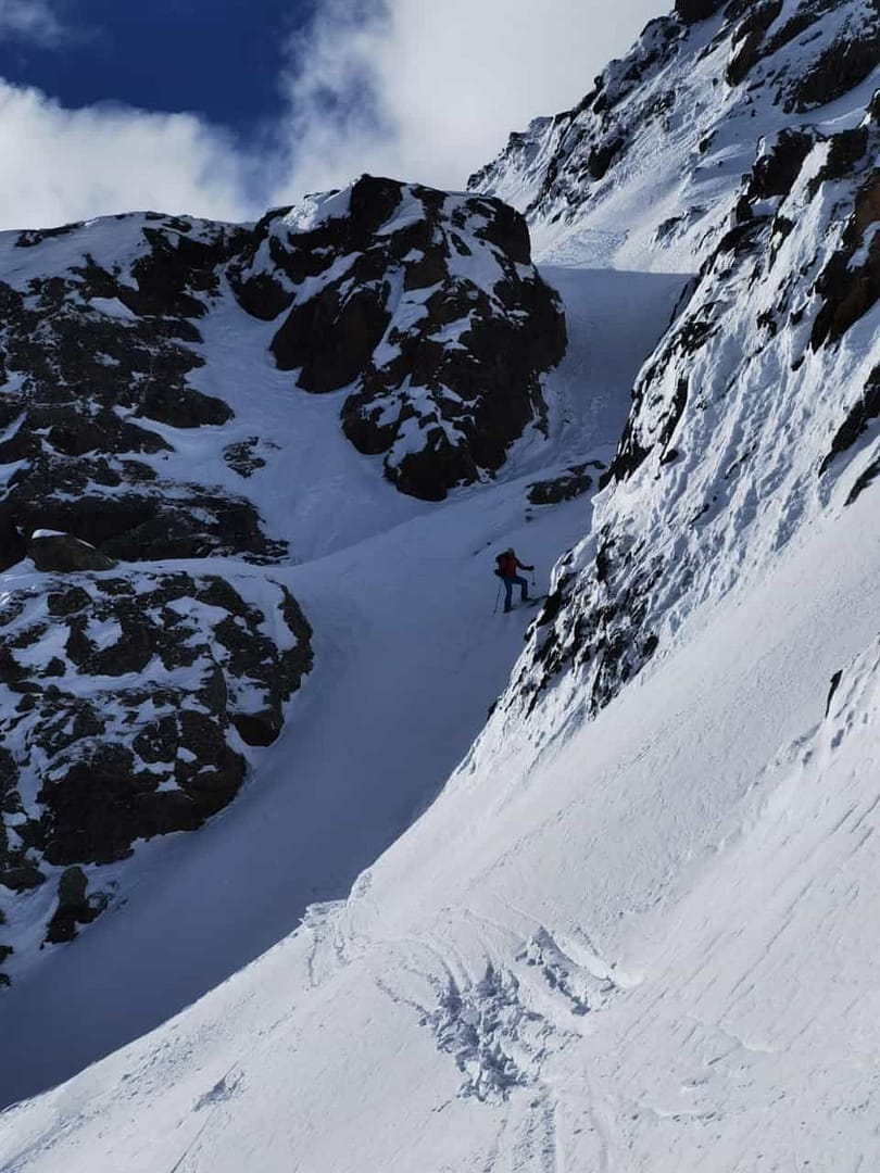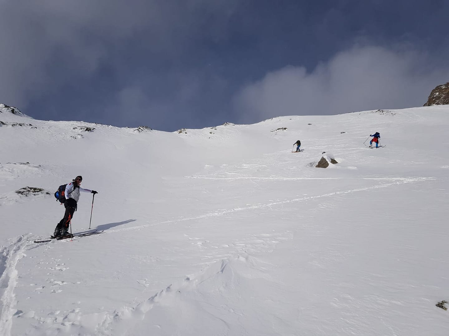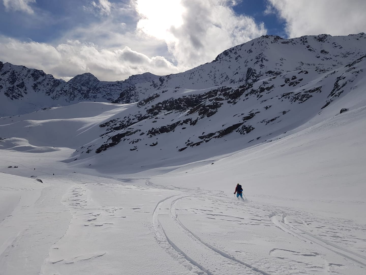 Erst einmal sind wir mit der Gondel zur Bergstation hochgefahren, somit spart man sich 600 Höhemeter im Aufstieg. Da man von der Bergstation ein paar Höhenmeter abfährt, braucht man zuvor noch nicht auffellen. Rechts am See vorbei umrunden wir den See, wenn ihr genug Schwung mitnimmt, müsst ihr erst später die Felle aufziehen. Hinten im Tal angekommen halten wir uns links und gehen über felsiges Gelände gerade auf den Wurmtaler Kopf zu. Ca. 1,5 km nach dem See zweigt der Weg zum K2 nach rechts ab und wir müssen eine kurze Steilstufe überwinden, die bei uns sehr abgeblasen und eisig war (3.-5. Bild).